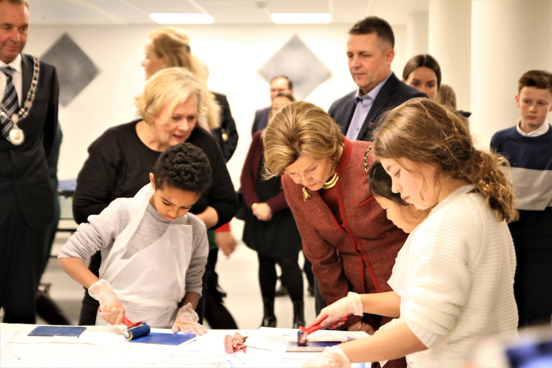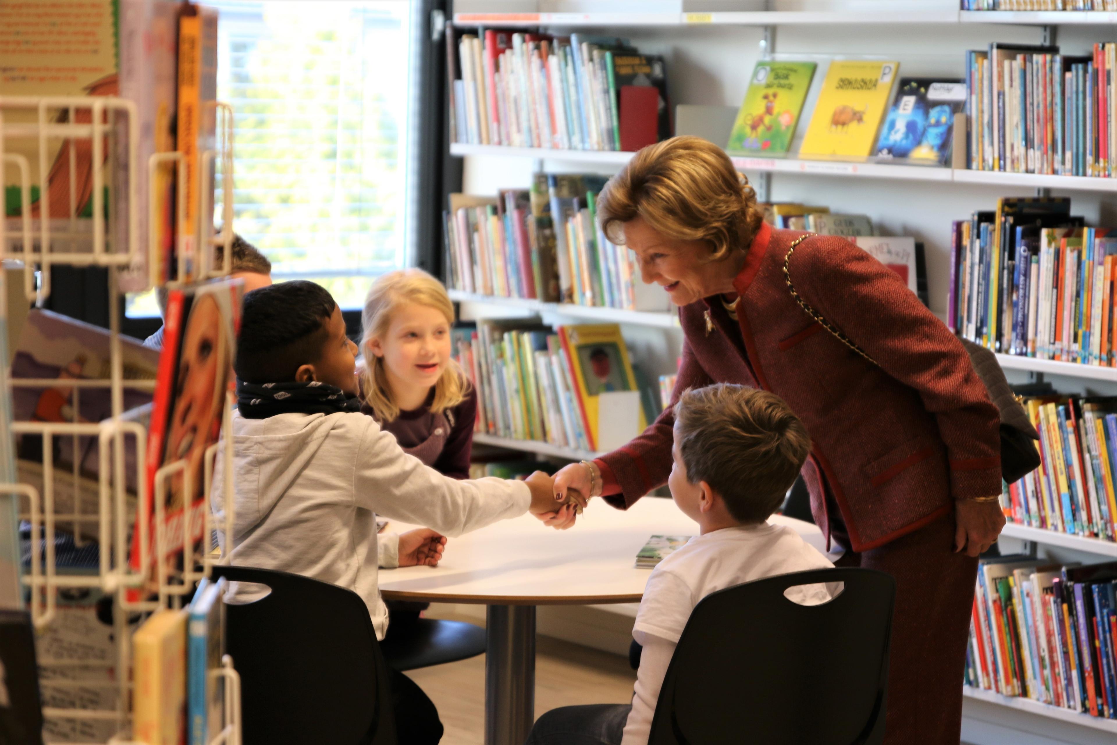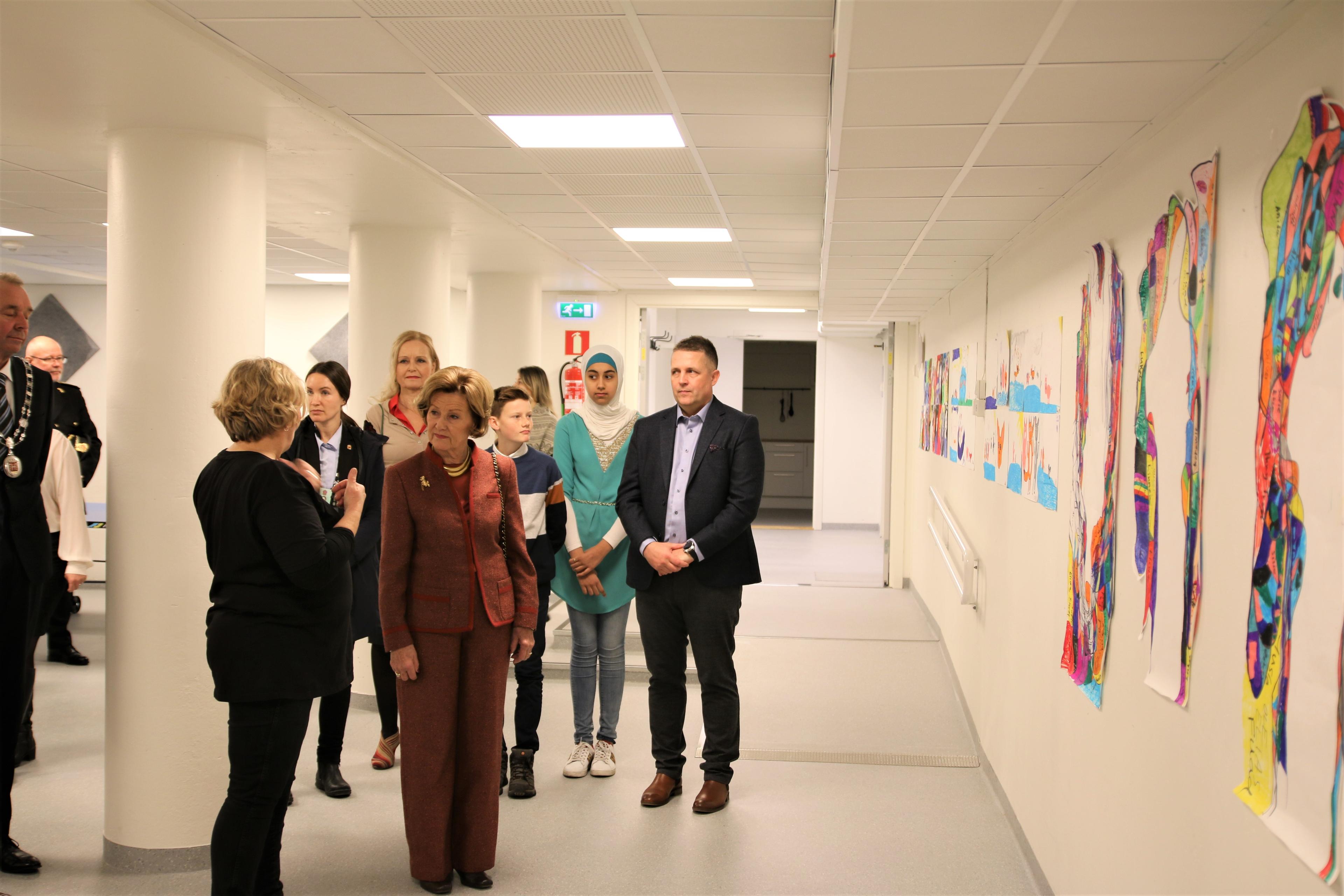 Før utdelingen av prisen fikk Dronningen en innholdsrik omvisning på skolen. Sammen med rektor og representanter fra elevrådet fikk hun se blant annet skolens bibliotek og aktivtetsrom hvor elevene får prøve seg på redesign av klær og sykler.