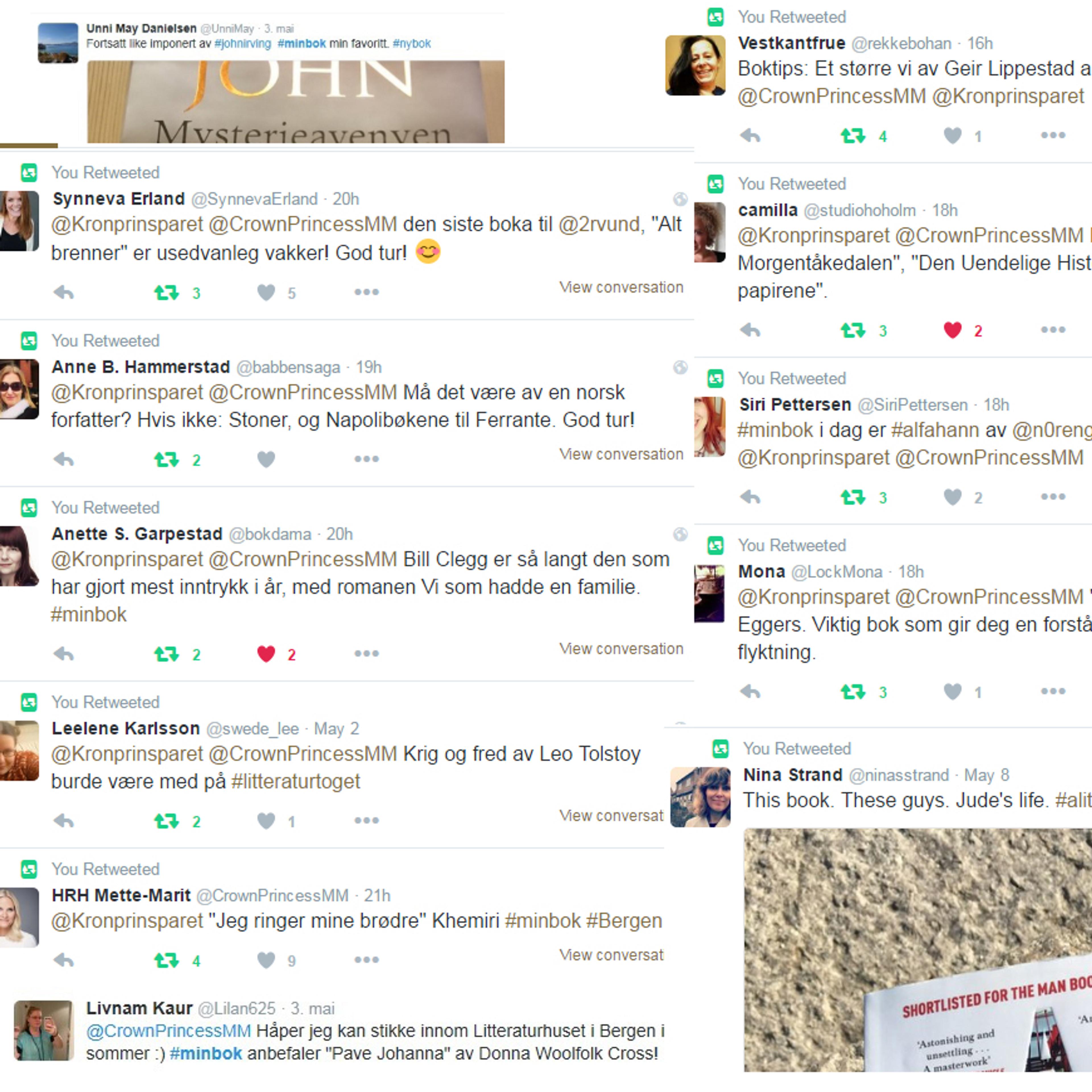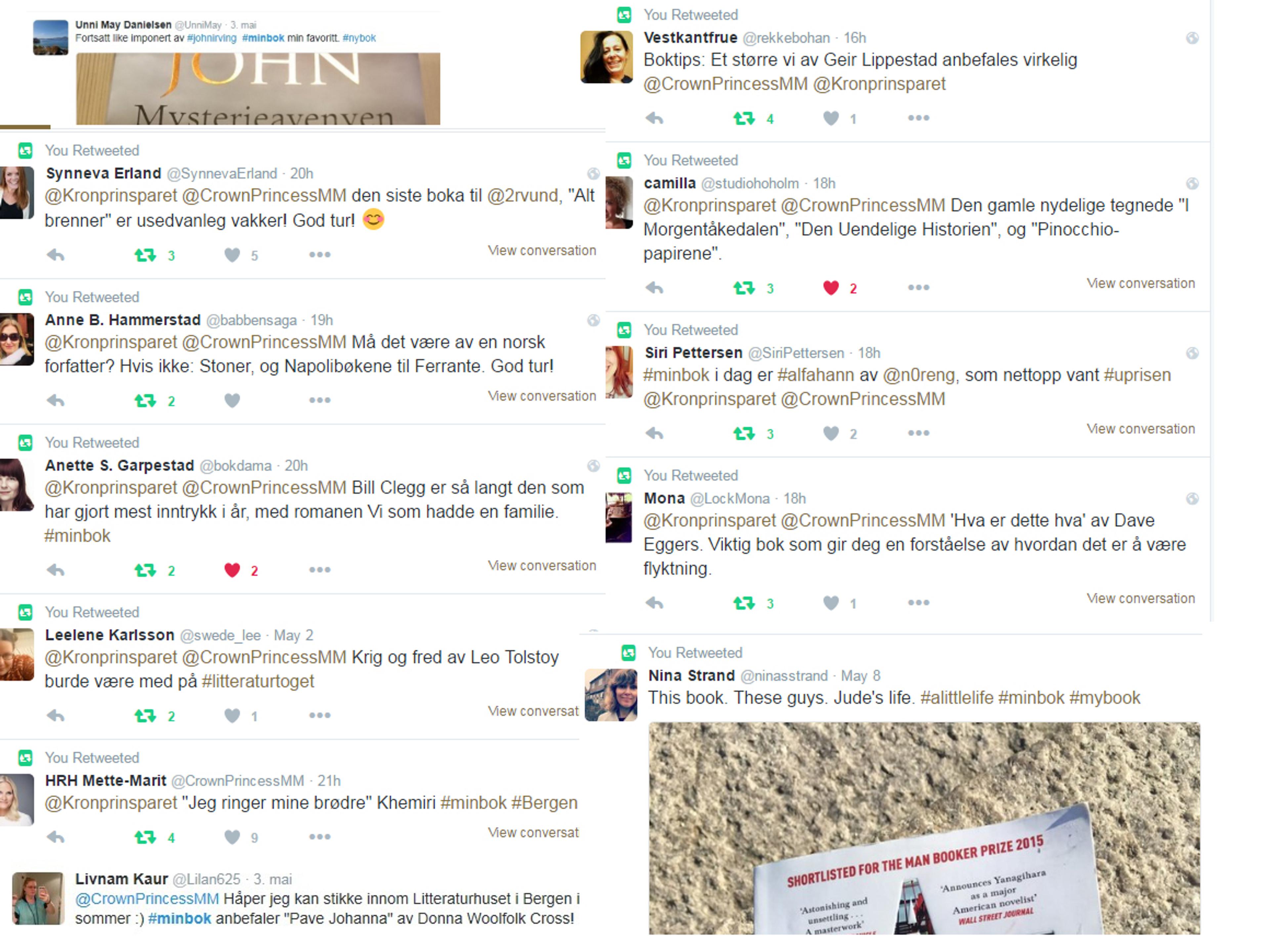 På veien ønsker Kronprinsesse Mette-Marit også få vite hva slags bøker som interesserer publikum. Det kan enkelt gjøres ved å benytte #minbok i sosiale medier. Uken før Litteraturtoget starter har emneknaggen allerede sparket i gang samtalen om hvilke bøker som er verdt å bruke tid på i sommer.