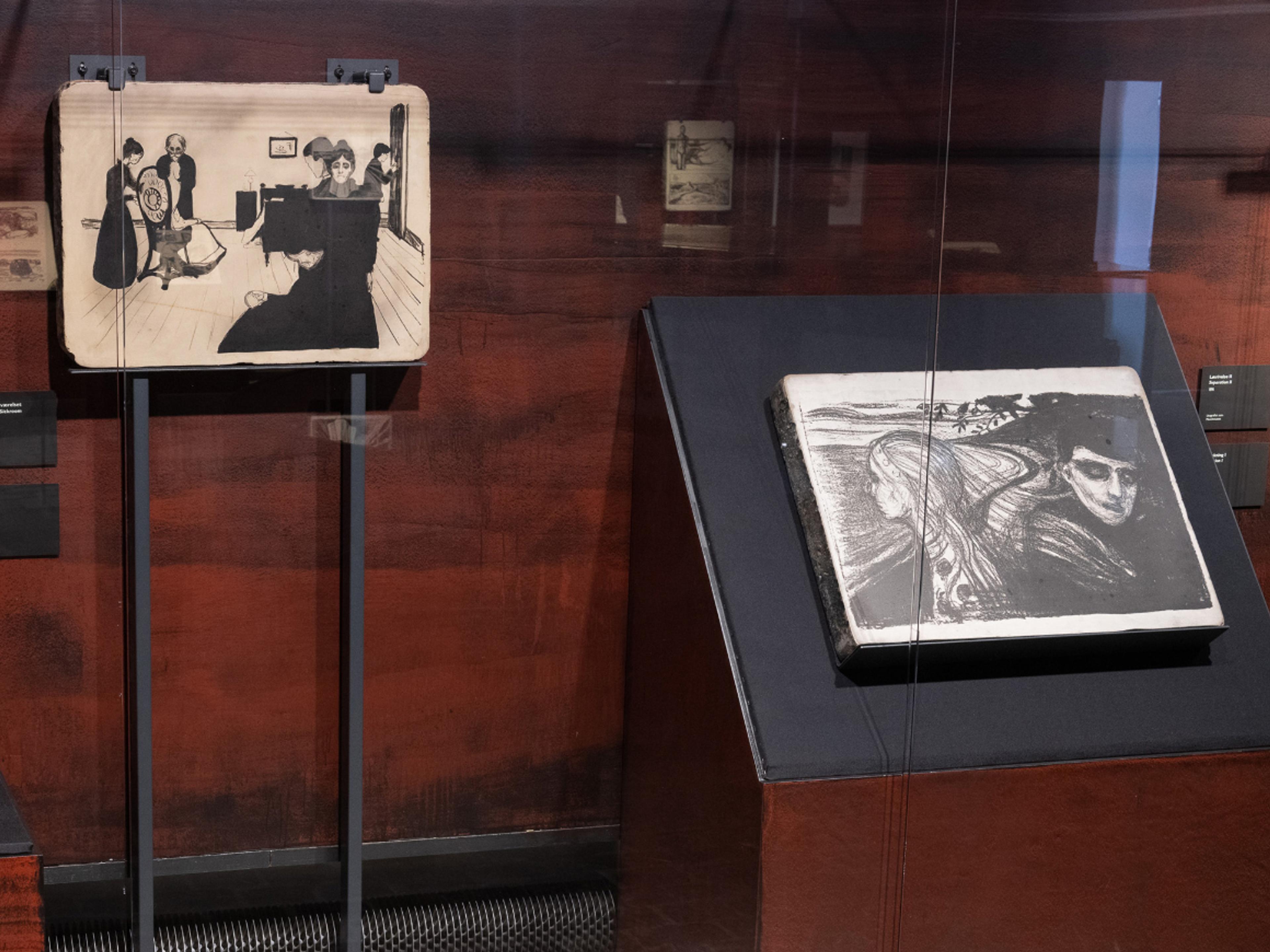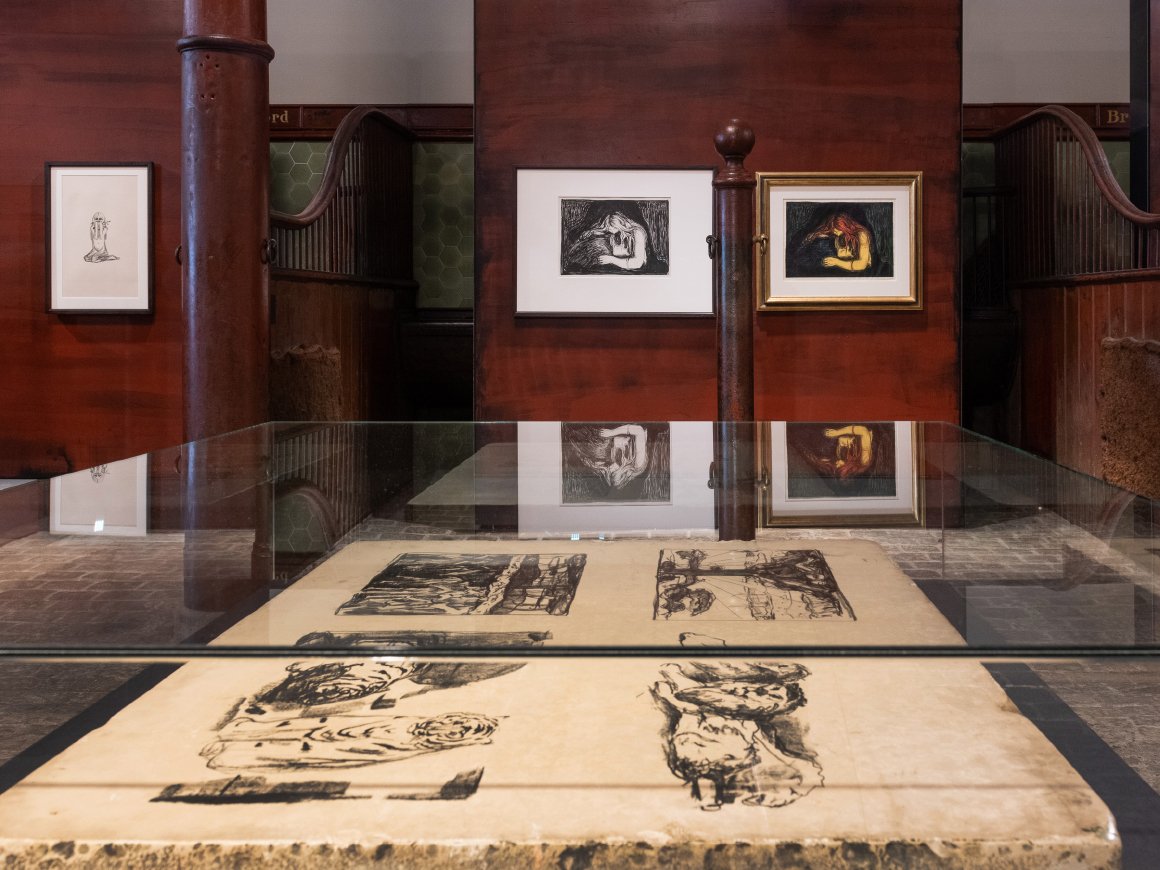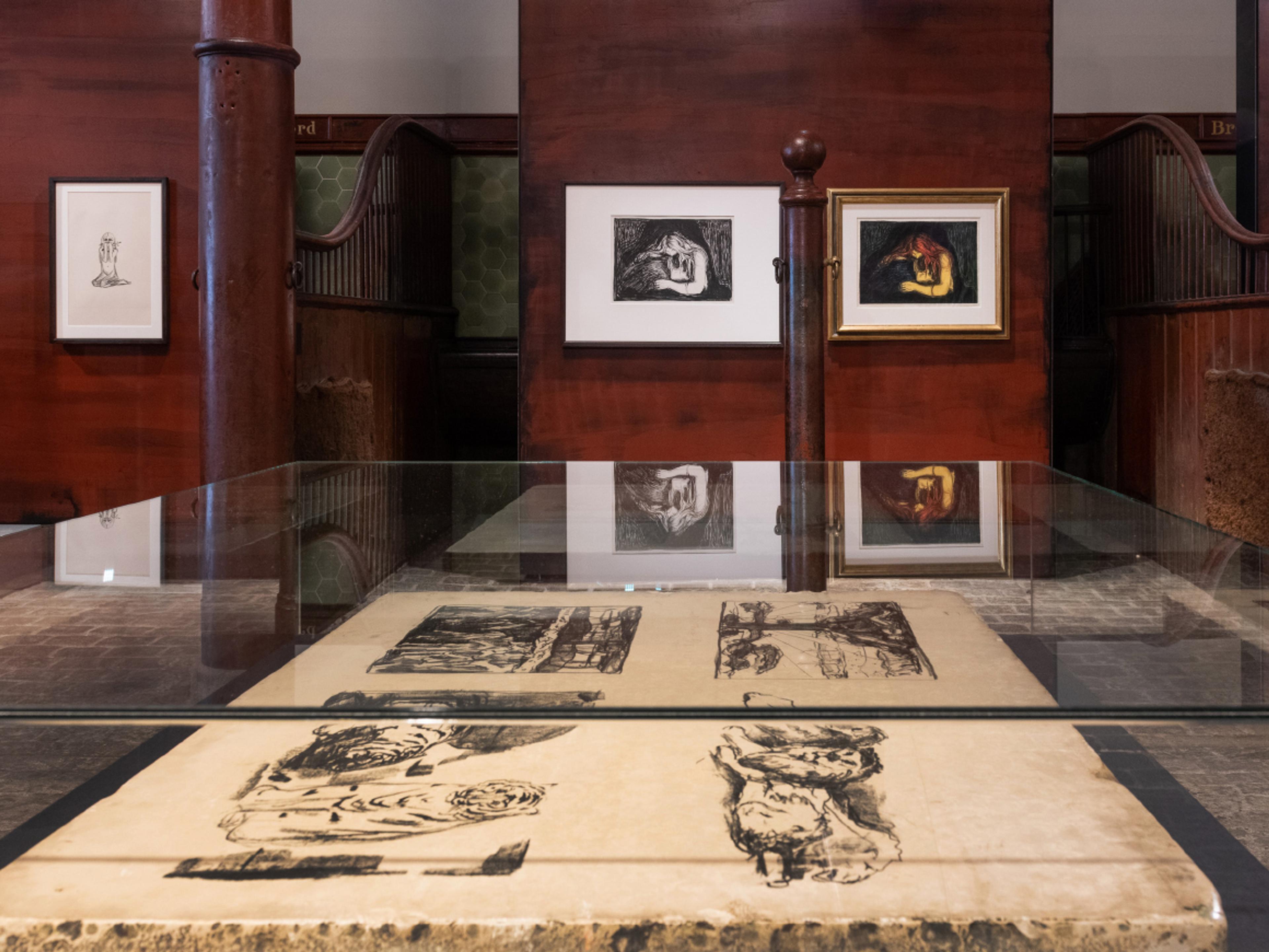 Nesten alle verkene i utstillingen er litografier, trykket ved hjelp av litografiske steiner. Nå er 38 av disse steinene å finne i KunstStallen, på utlån fra Munchmuseet. De har aldri vært vist sammen med de ferdige verkene på denne måten tidligere.