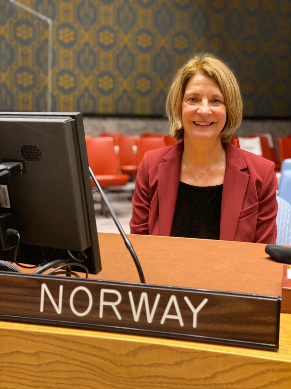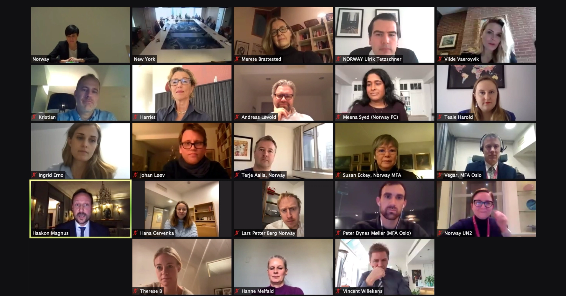 Fra hver sin skjerm i Norge deltok i dag Kronprins Haakon og utenriksminister Ine Eriksen Søreide på et digitalt møte med det norske FN-teamet i New York. Allerede tidligere på dagen hadde utenriksministeren hatt sitt første innlegg i Sikkerhetsrådet.