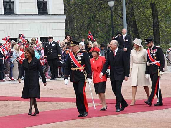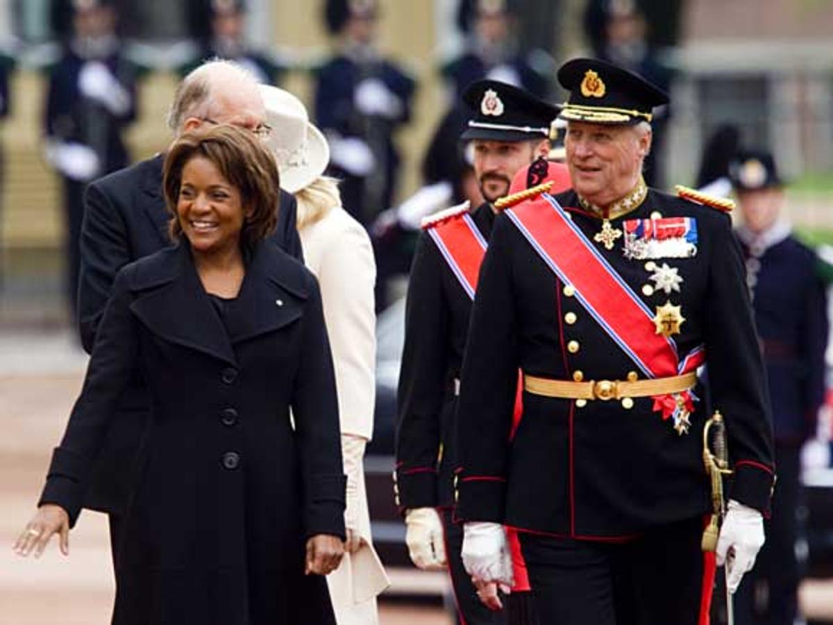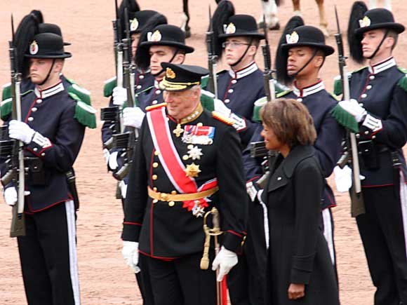DD.MM. Kongen og Dronninga ønskte Canadas generalguvernør, H.E. Michaëlle Jean, og herr Jean-Daniel Lafond velkommen til Noreg i dag. DD.KK.HH. Kronprinsen og Kronprinsessa deltok òg i velkomstseremonien på Slottsplassen.