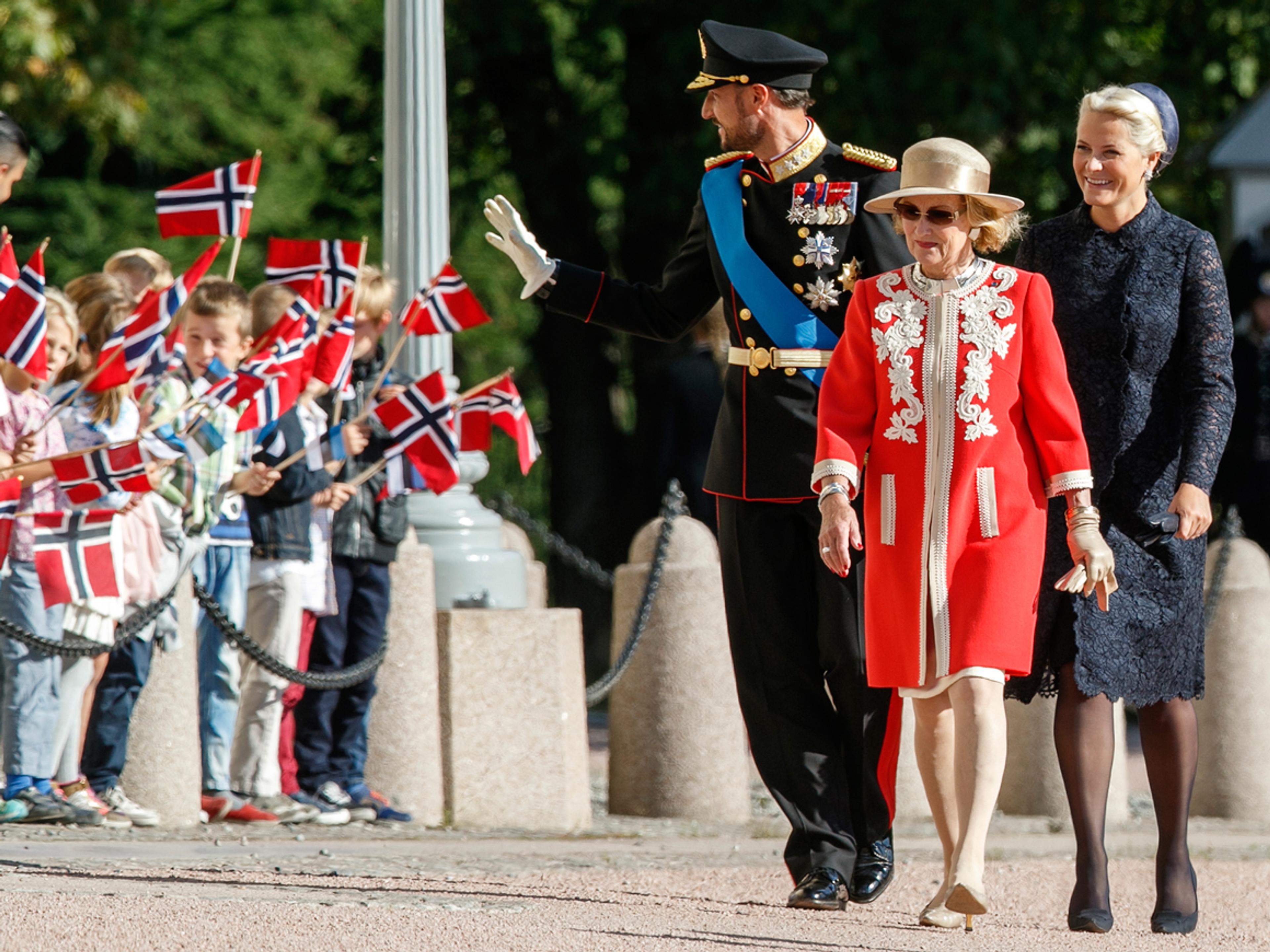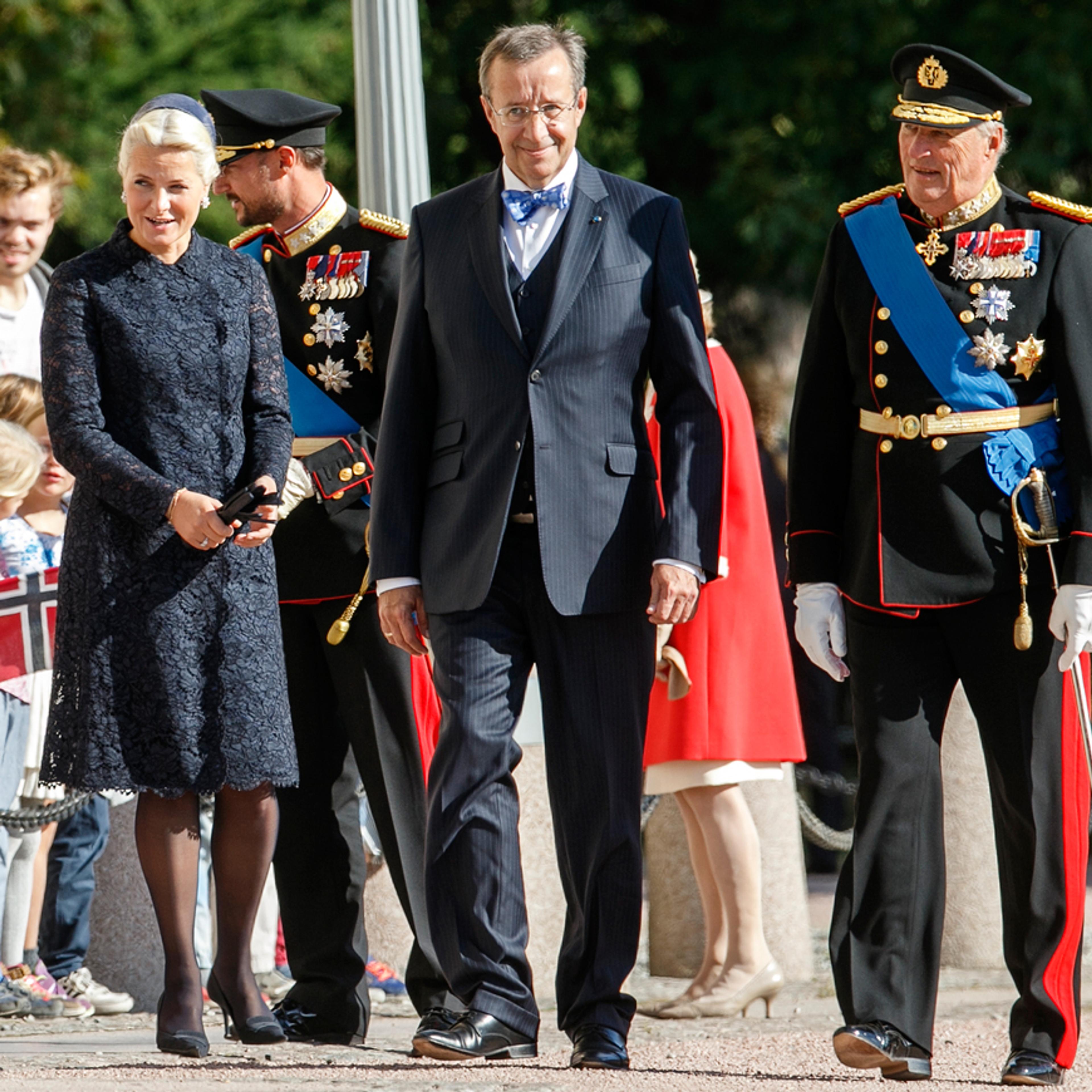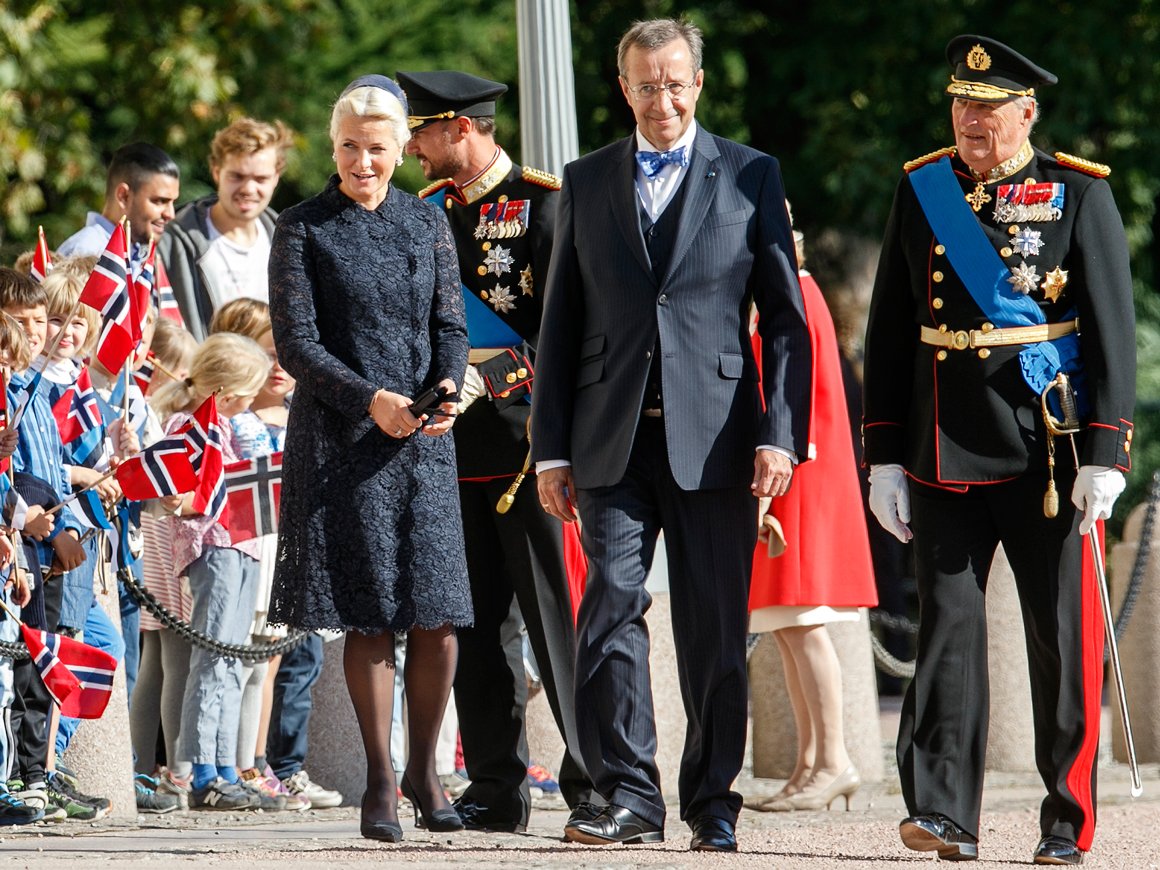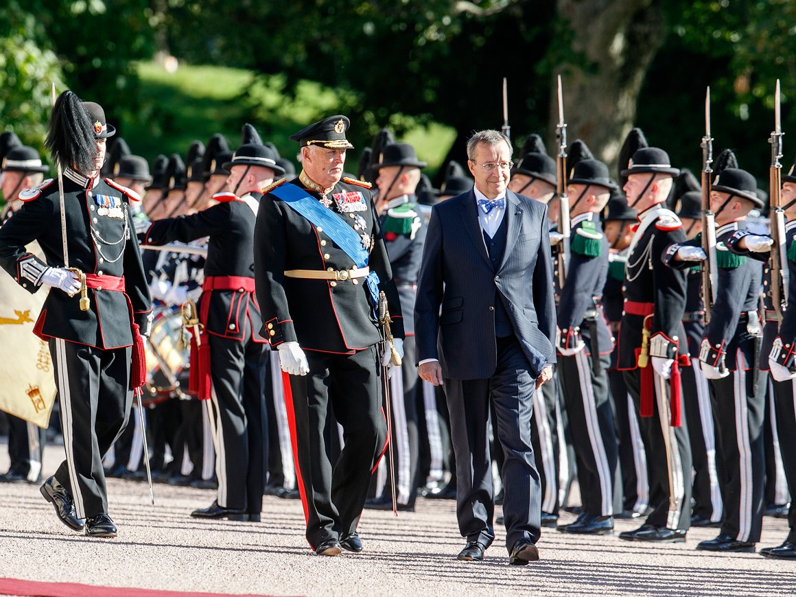 Den Høgvørde Kronprins Haakon følgde Presidenten til Slottsplassen i dag tidleg, der han vart motteken av Kongeparet og Kronprinsesse Mette-Marit. Norske og estiske flagg omkransa plassen der seremonien vart gjennomført.