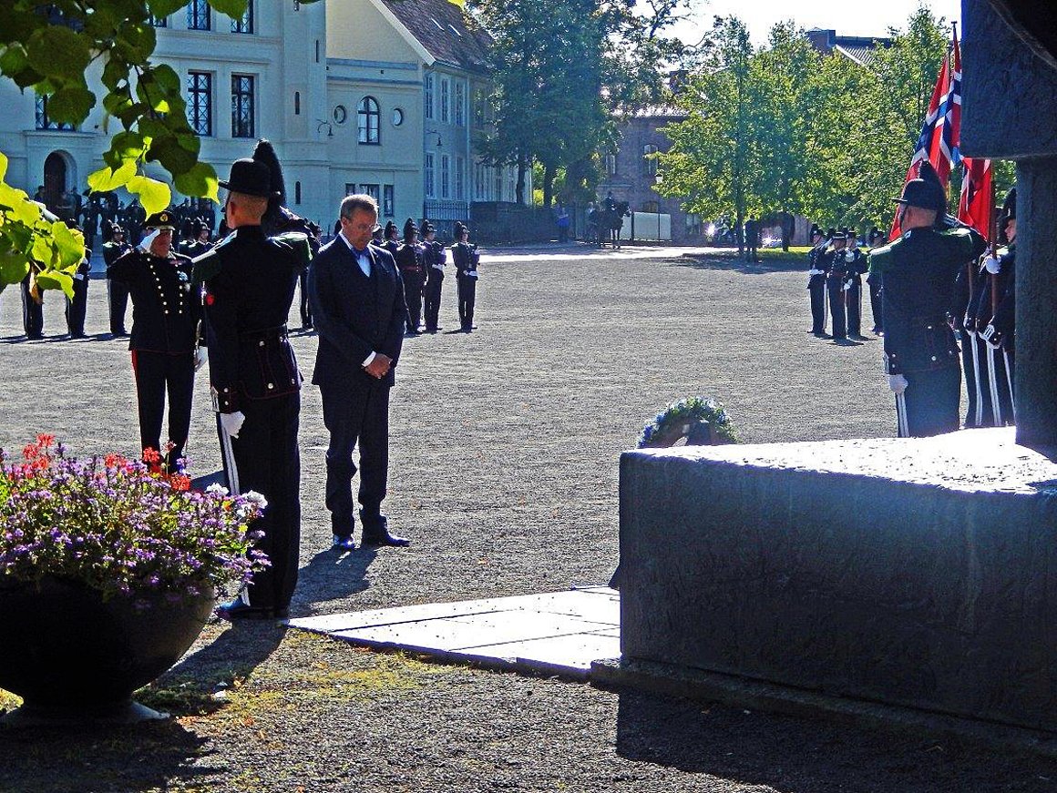 Tradisjonen tru var første programpost etter velkomsten nedlegging av krans på nasjonalmonumentet. Kong Harald og Dronning Sonja følgde Presidenten til Akershus festning, der han la ned krans på monumentet til minne om dei som fall under den andre verdskrigen.