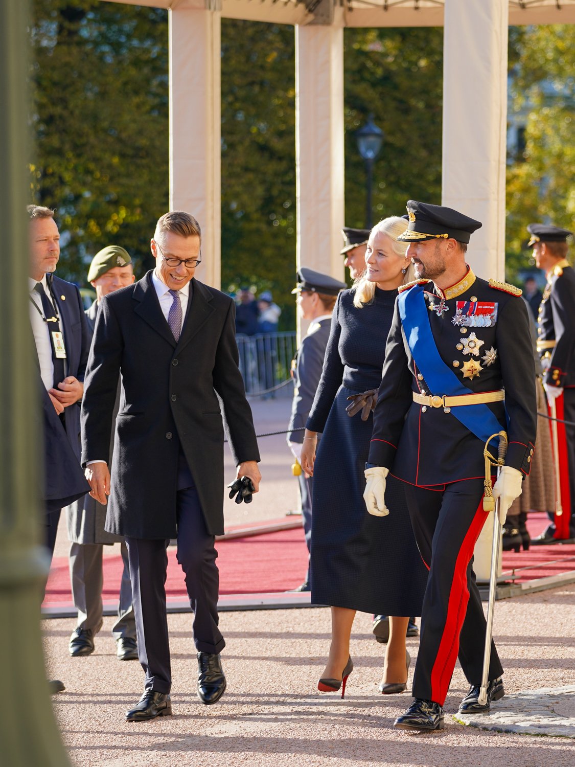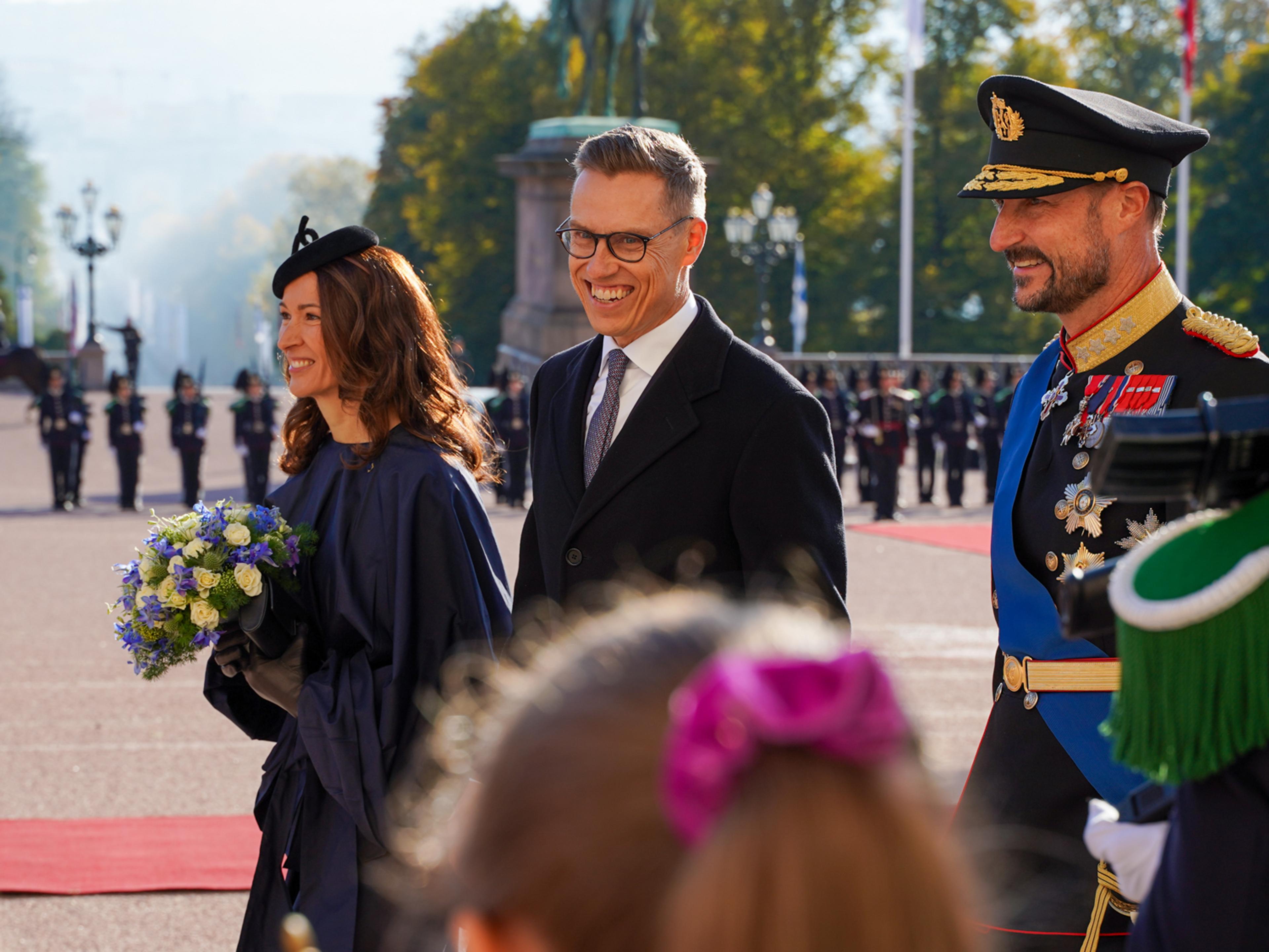 Den høytidelige velkomstseremonien startet på Slottsplassen, der landenes nasjonalsanger ble avspilt og President Stubb, ledsaget av Hans Kongelige Høyhet Kronprins Haakon, inspiserte et æreskompani fra Kongens Garde.