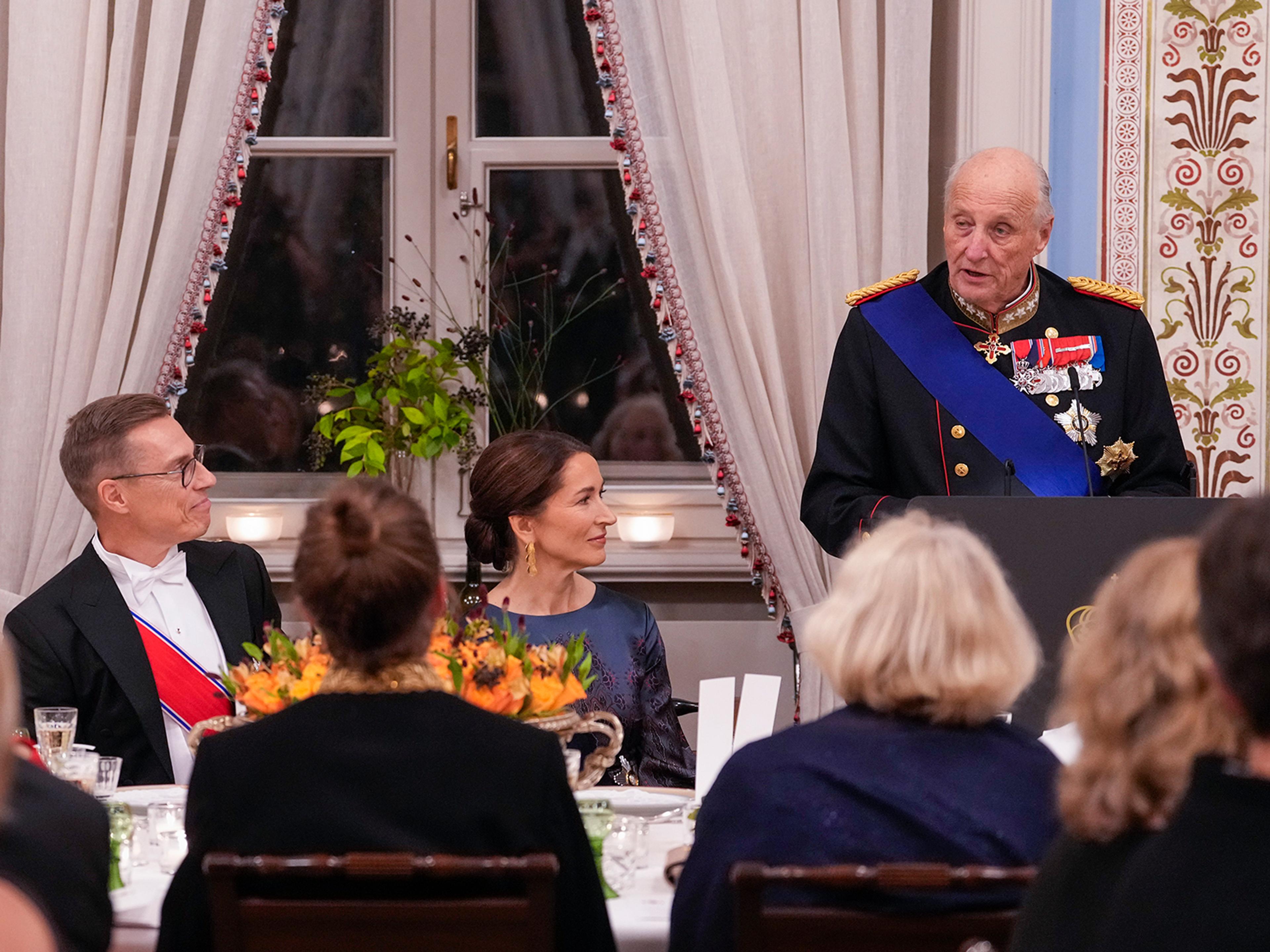 I kveld er det gallamiddag på Det kongelige slott til ære for besøket. Bordene i Store spisesal er dekket til 193 personer, og på gjestelisten står både representanter for det offisielle Norge og nordmenn med tilknytning til Finland - i tillegg til offisielle den finske delegasjonen.