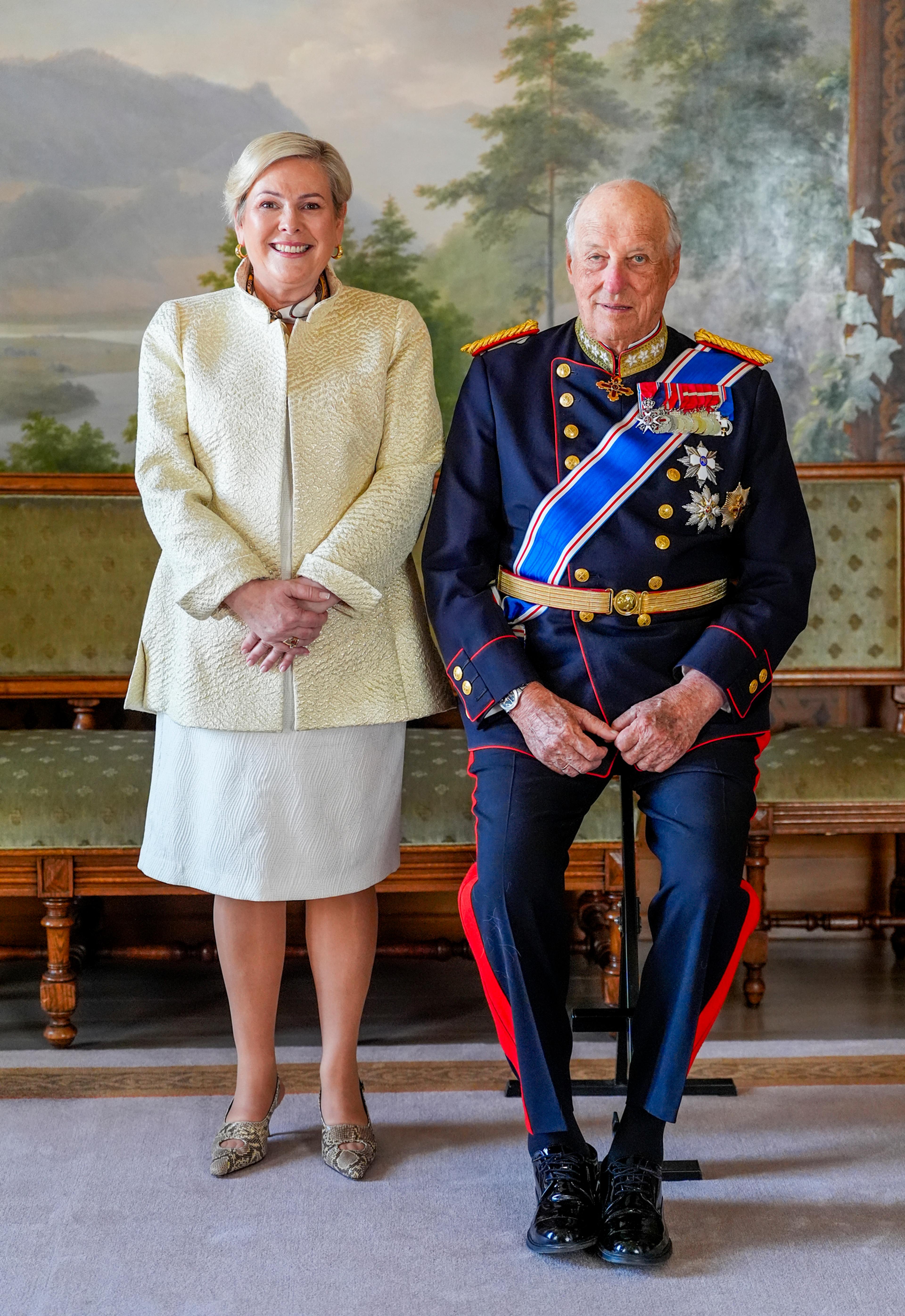 Deres Majesteter Kong Harald og Dronning Sonja ønsket Islands president Halla Tómasdóttir og hennes ektemann Björn Skúlason velkommen til Norge under en velkomstseremoni på Slottsplassen i formiddag.
