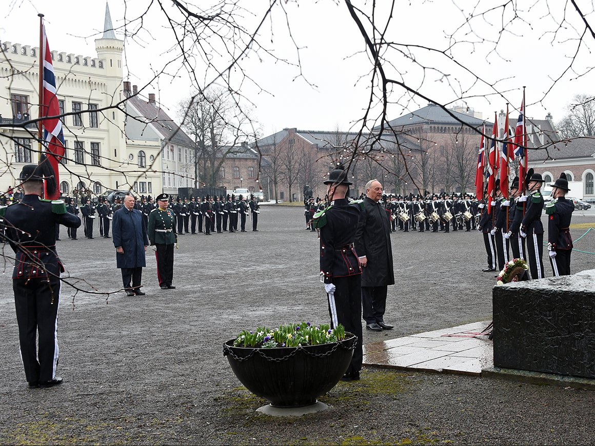 Den Høgvørde Kronprins Haakon følgde President Bērziņš til Slottsplassen, der han vart ønskt velkommen av Kongeparet og Kronprinsessa. Frå ærespaviljongen lytta statsoverhovuda til nasjonalsongane til dei to landa, før President Bērziņš inspiserte æresgarden følgd av Hans Majestet.