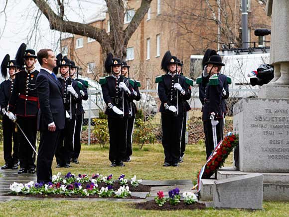 Etter utstillingen, reiste følget til Vestre gravlund der President Medvedev la ned krans på monumentet over sovjetiske soldater som falt i Norge.