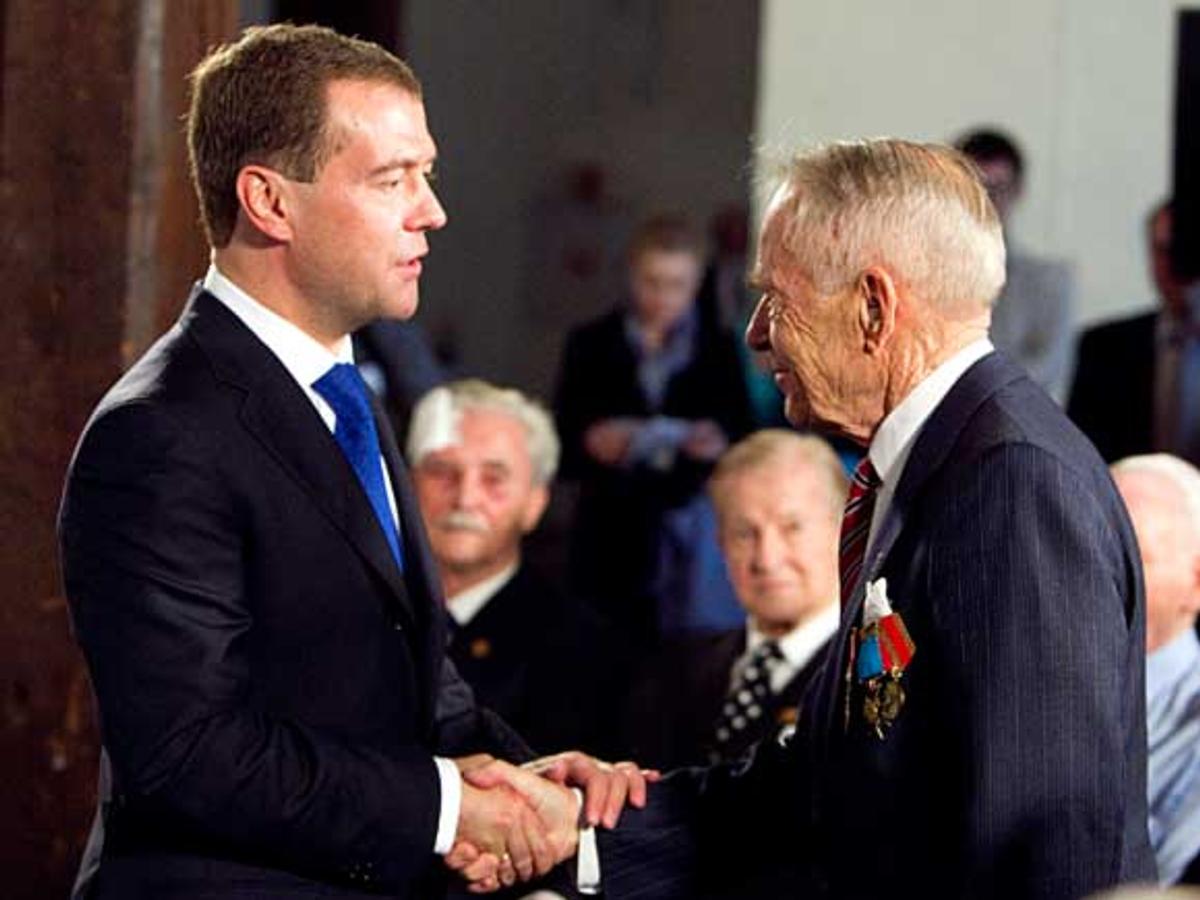 Dmitrij Medvedev hedret også 14 norske krigsveteraner med Den russiske jubileumsmedaljen som markerer 65-årsjubileet for seier i Den store fedrelandskrigen1941-1945.