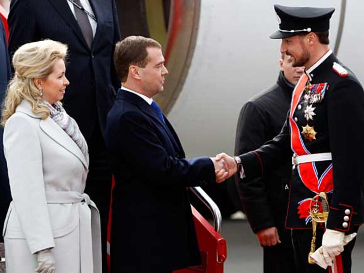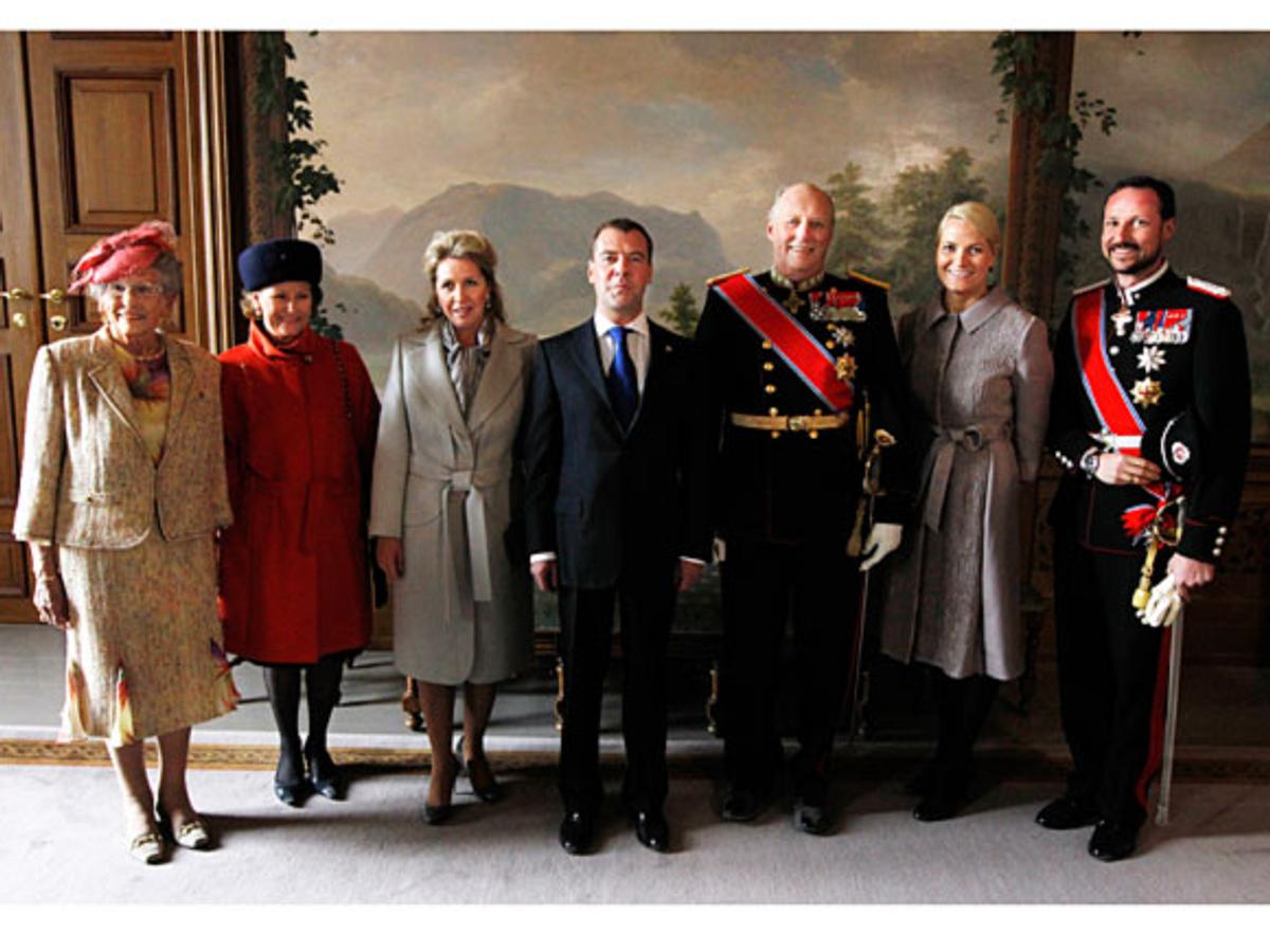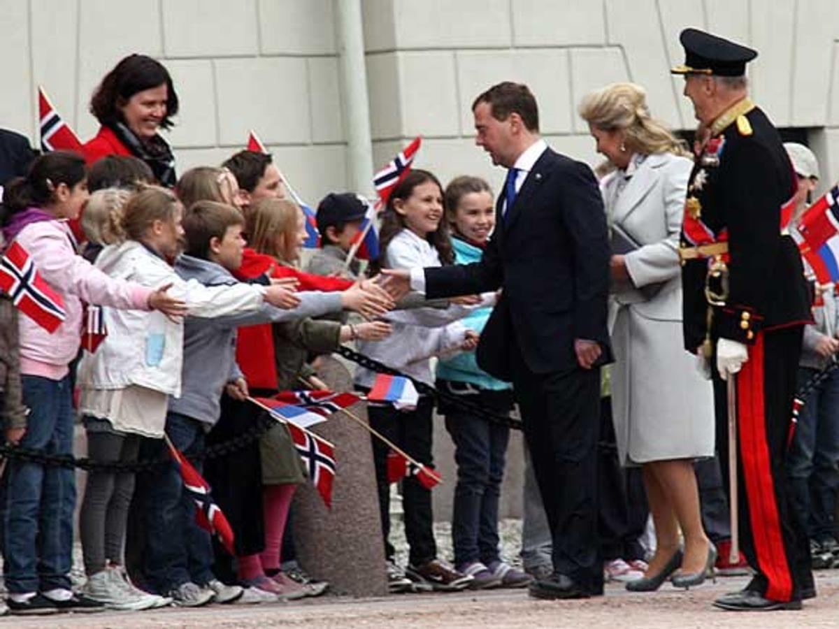 Hennes Majestet Dronningen og Kronprinsparet var også til stede under velkomstseremonien, der Kongen og Presidenten inspiserte Garden og hilste på representanter for det offisielle Norge. President Medvedev tok seg også tid til å hilse på norske og russiske barn som hadde møtt fram.