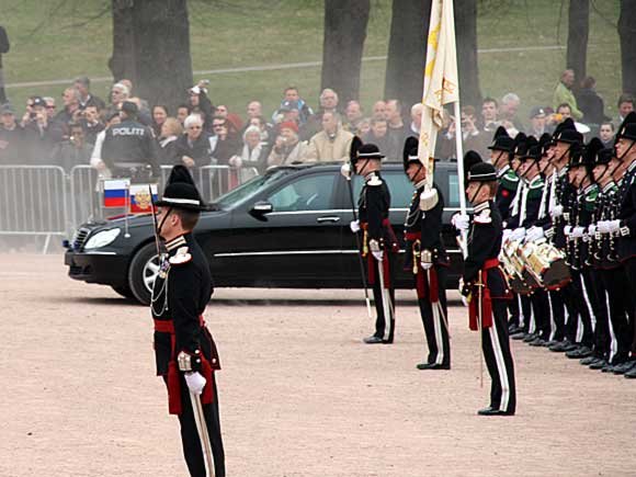 Hans Majestet Kongen ønsket Russlands president H.E. President Dmitrij Medvedev og fru Svetlana Medvedeva velkommen til Norge under en høytidelig seremoni på Slottsplassen i formiddag.