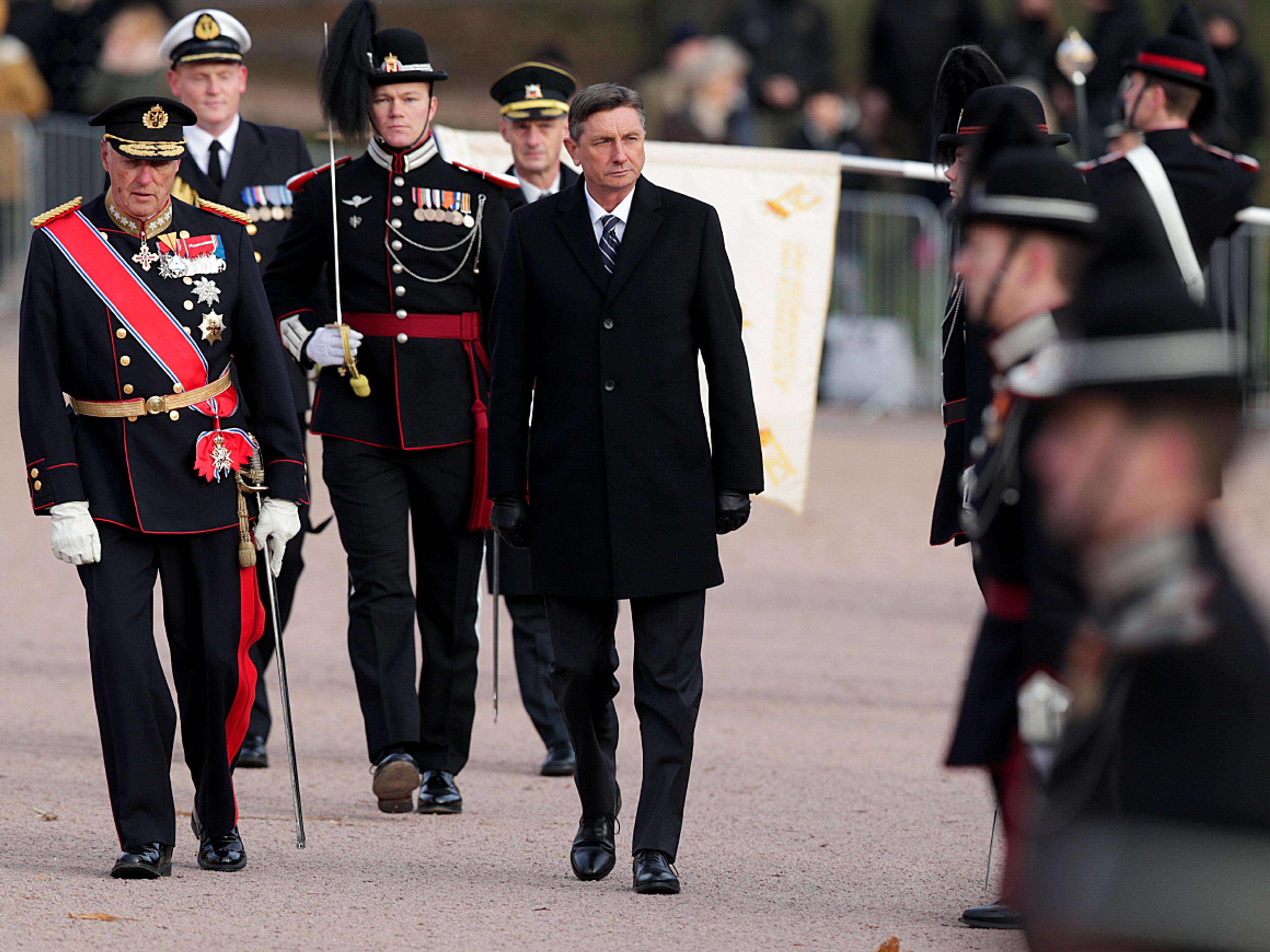 Fra sin plass på ærespaviljongen utenfor Slottet hørte Kongen og Presidenten den norske og den slovenske nasjonalsangen. Deretter inspiserte President Pahor æresgarden før Kong Harald presenterte ham for representanter for det offisielle Norge.