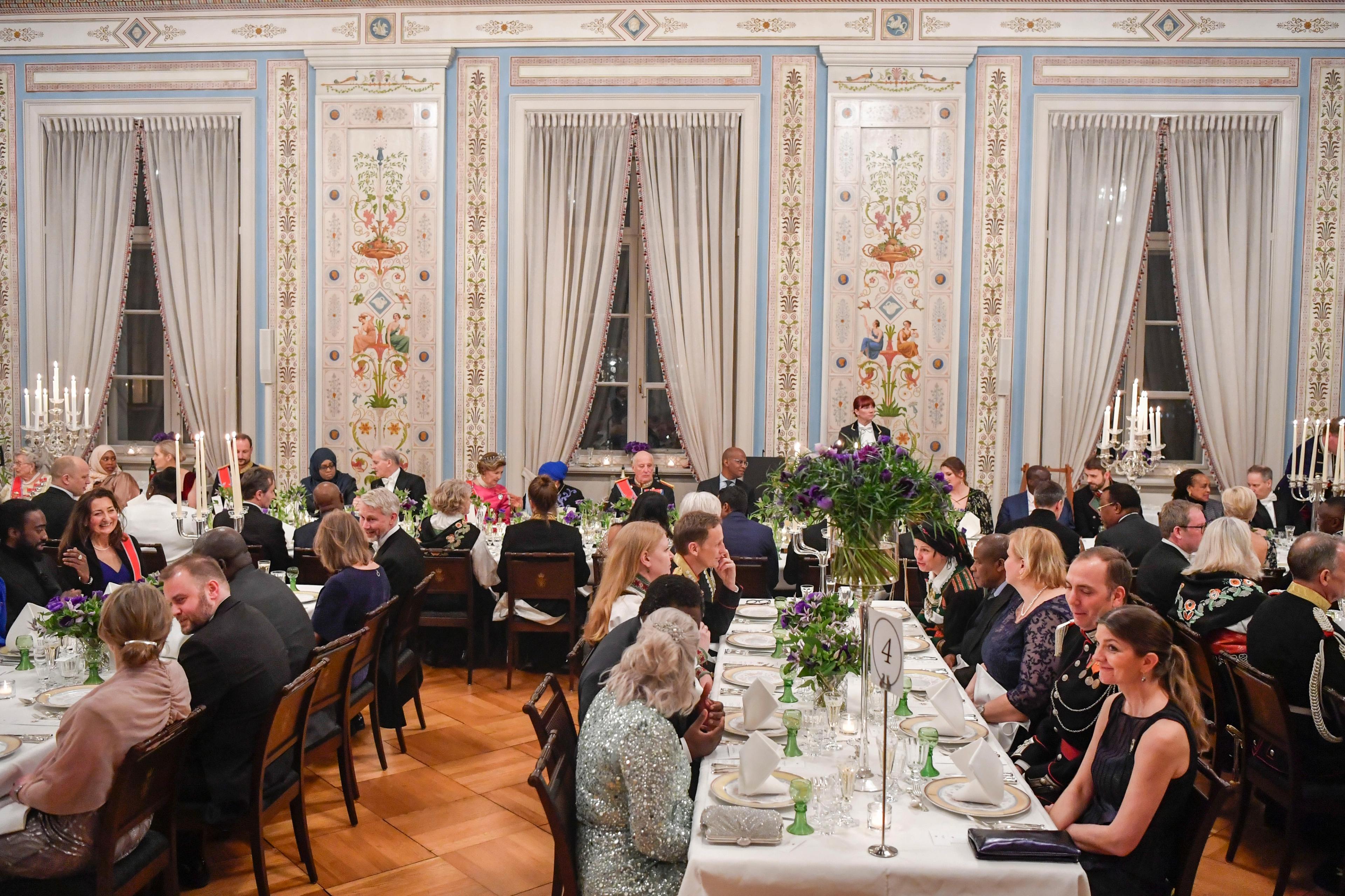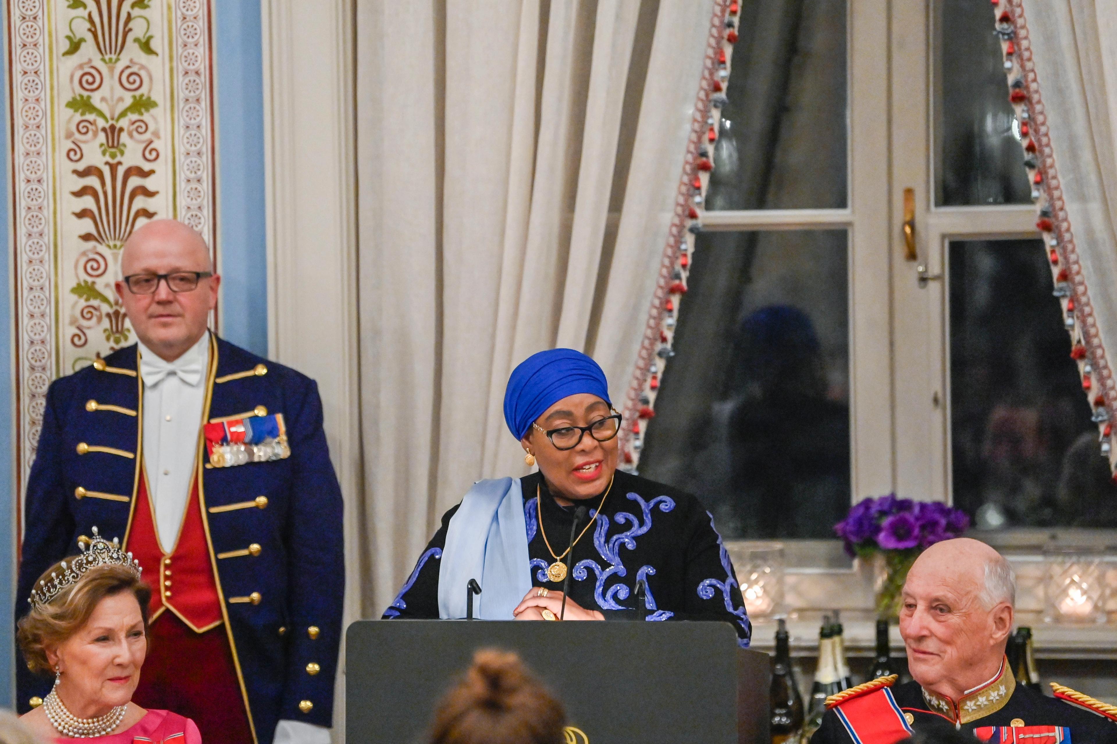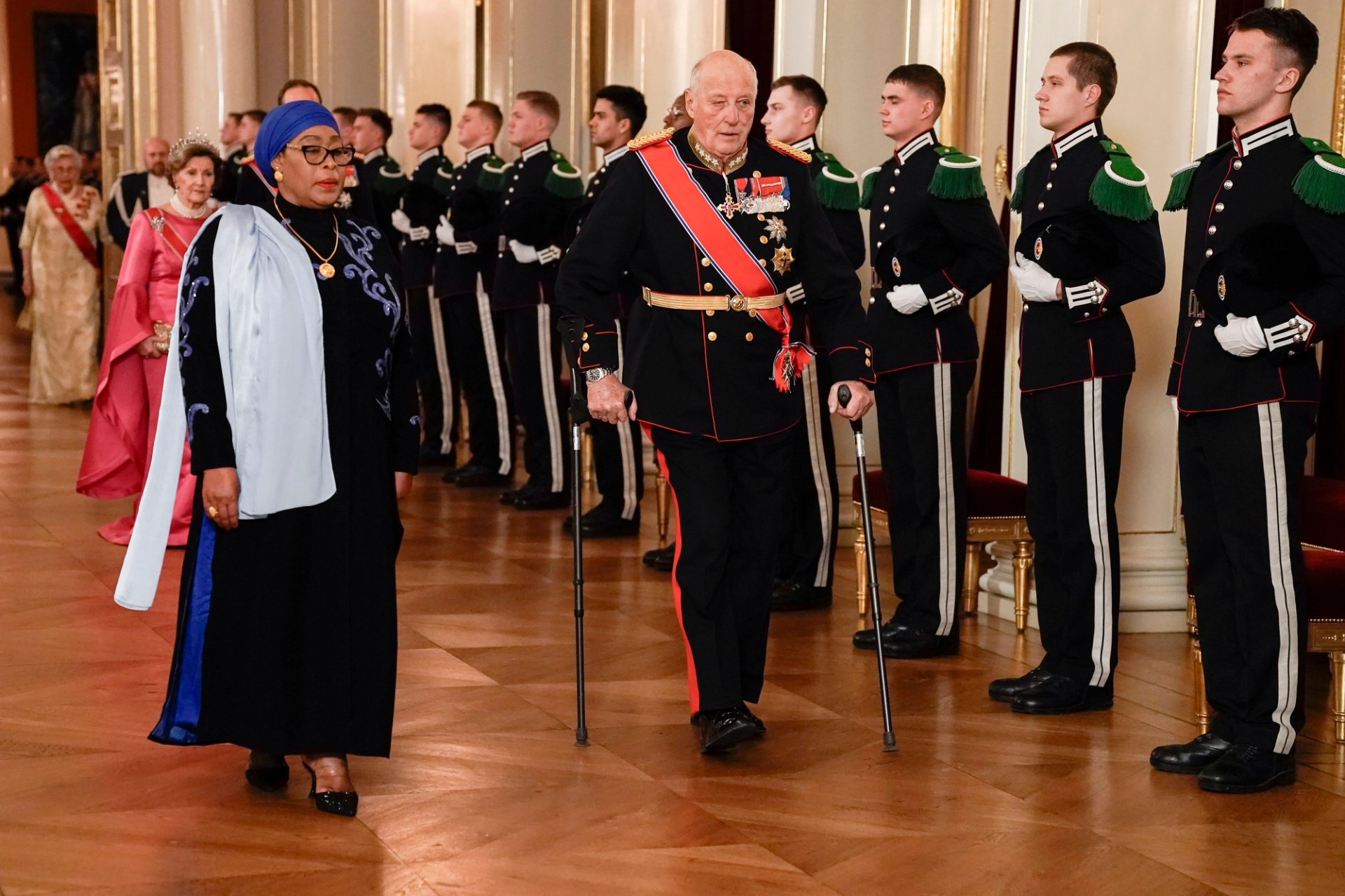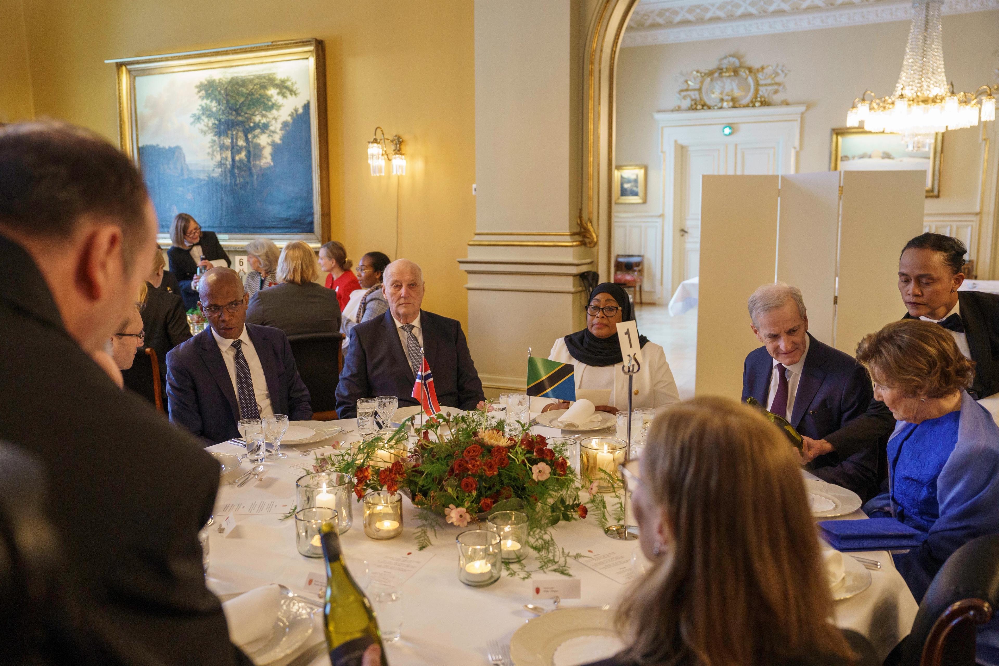 Tirsdag kveld var det gallamiddag på Det kongelige slott. Kong Harald og Dronning Sonja holdt middag til ære for Tanzanias president. Kronprinsparet og Prinsesse Astrid, fru Ferner var også til stede under middagen.