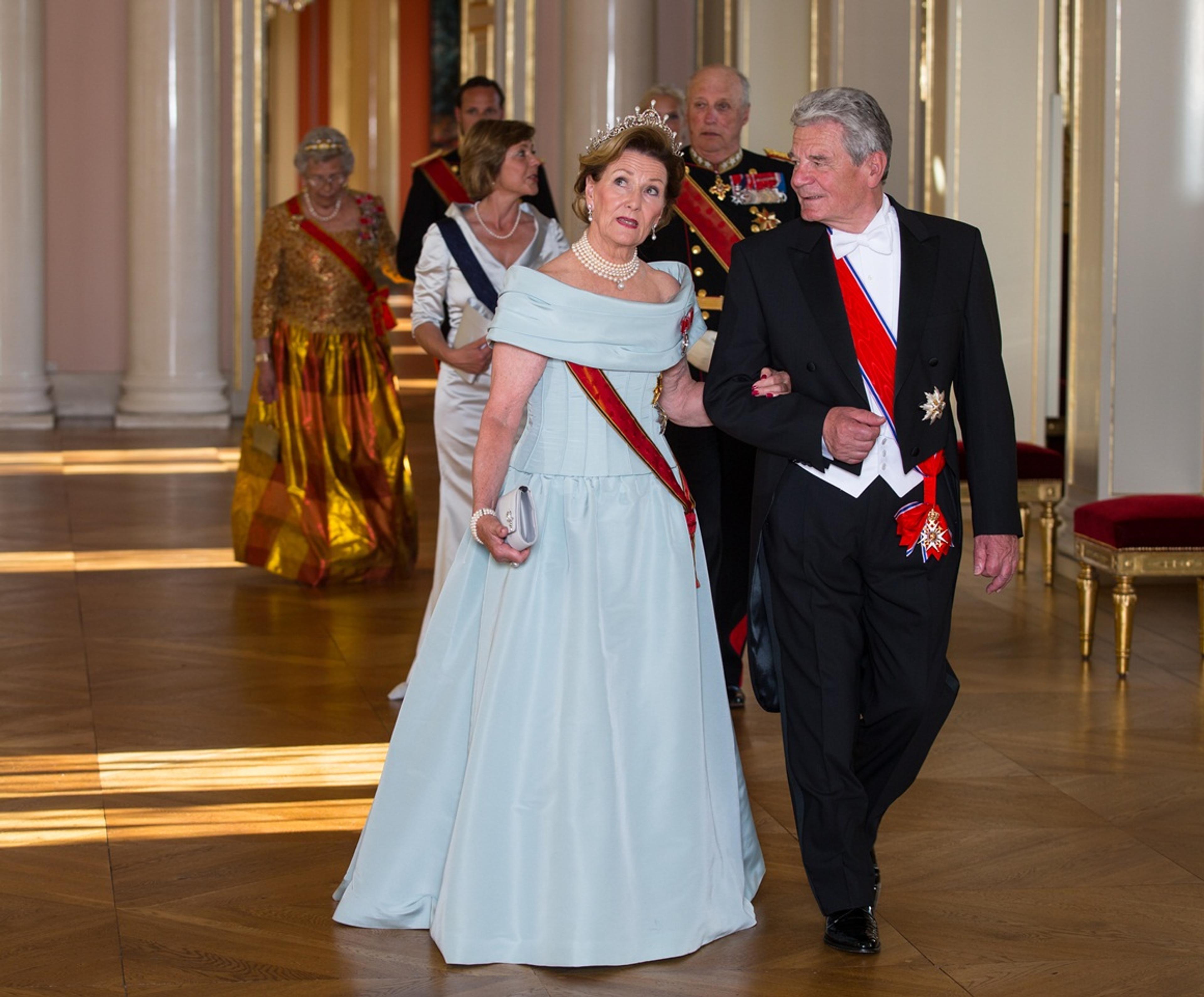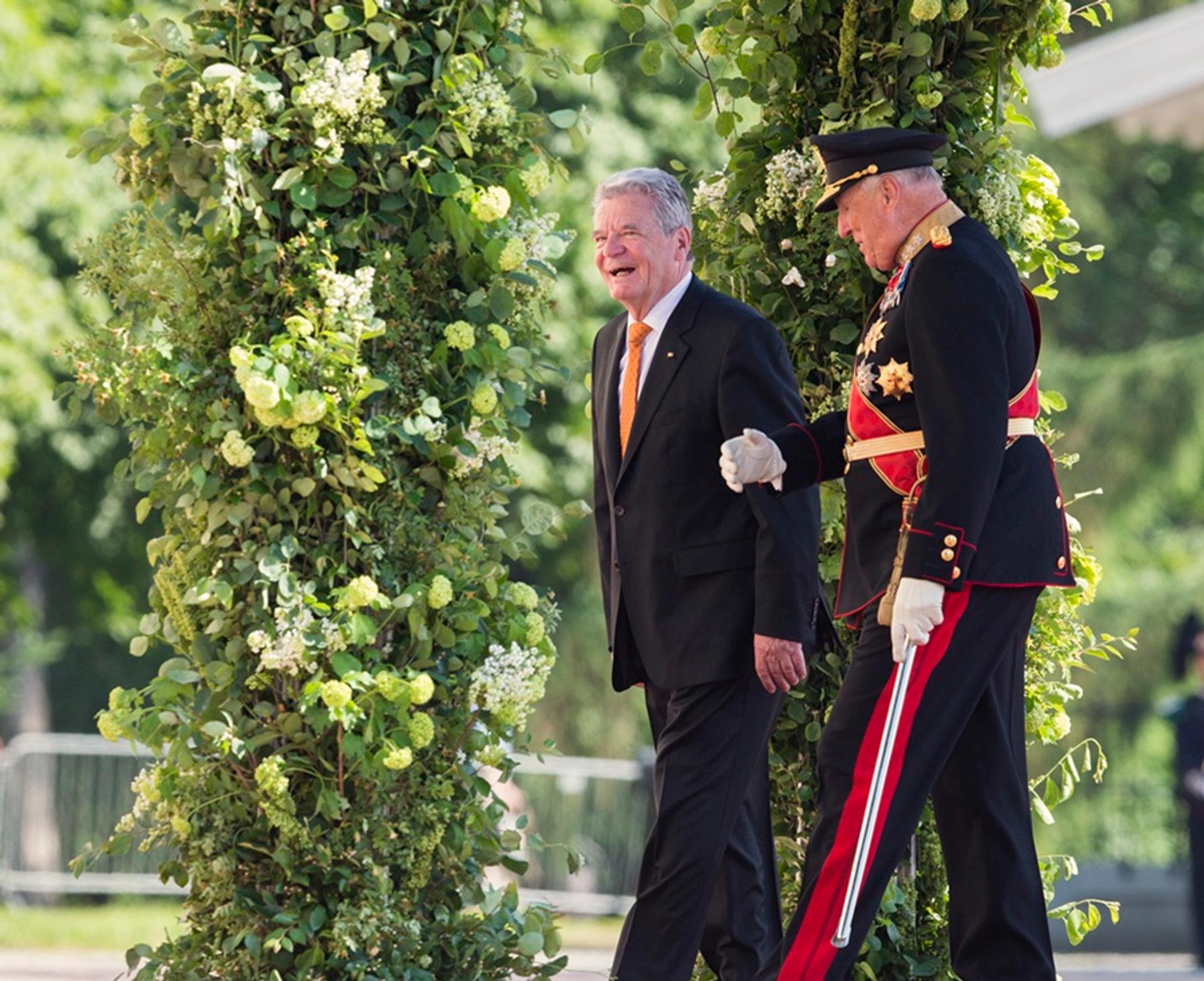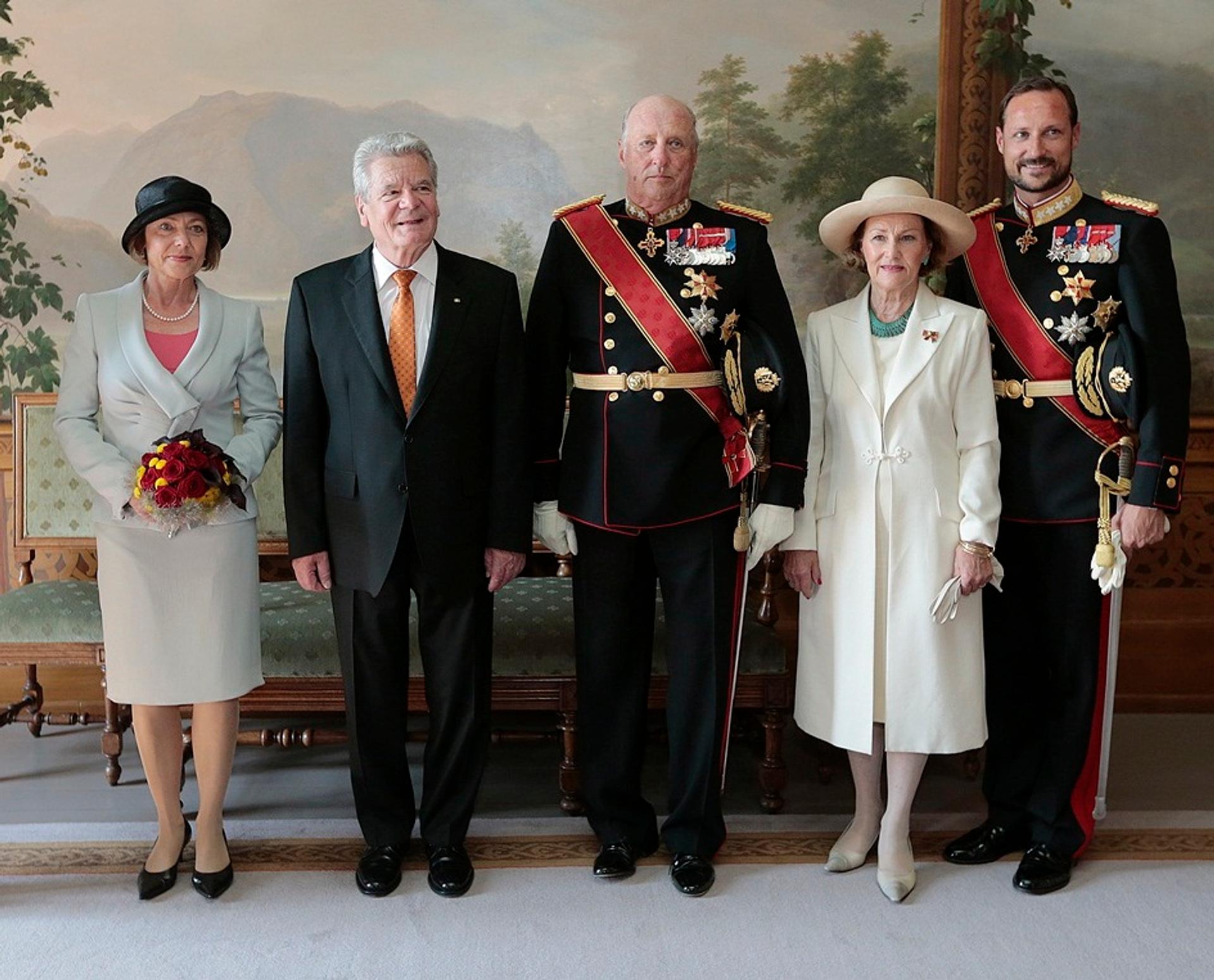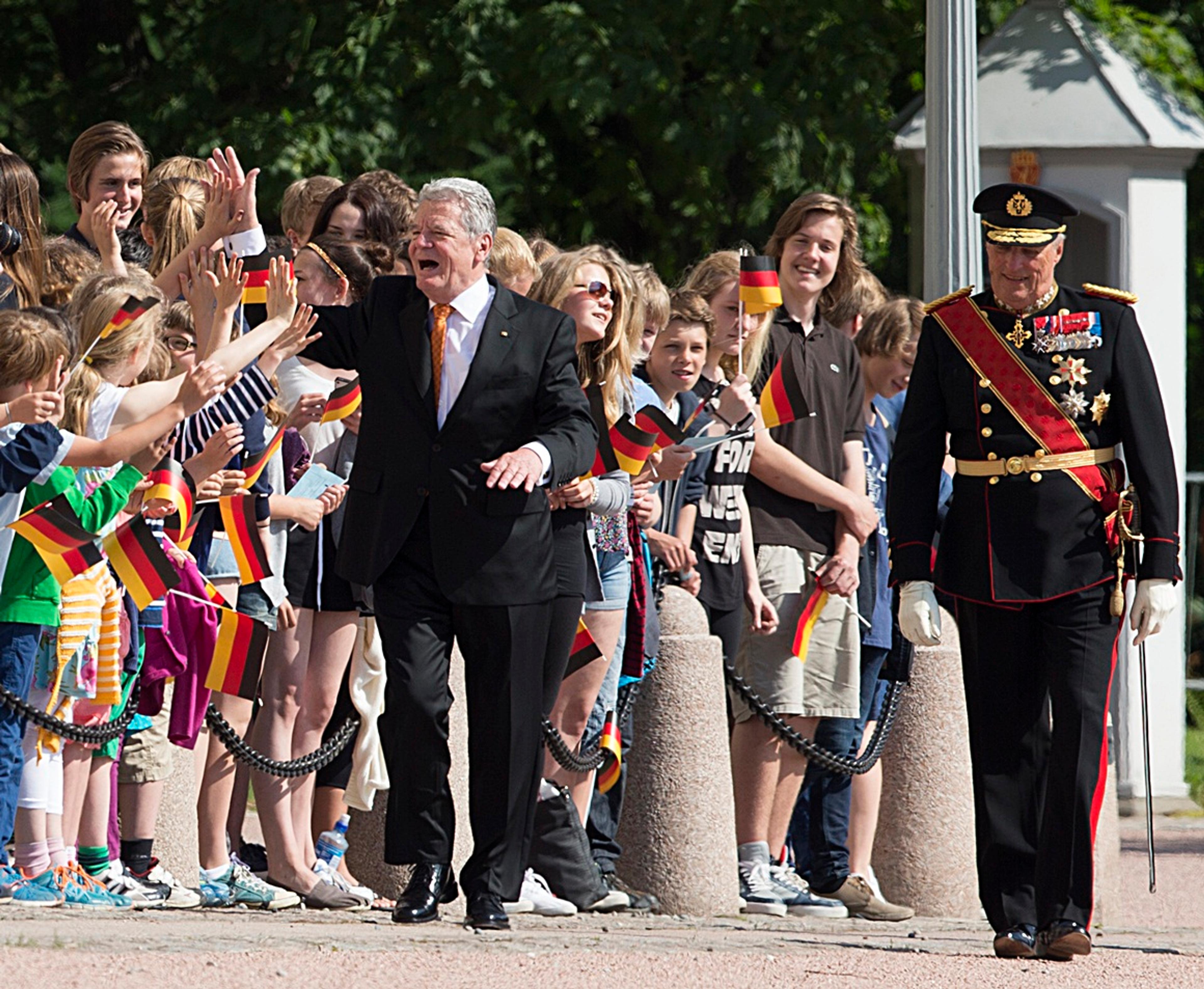 President Gauck og fru Schadt ble fulgt til Slottsplassen av Kronprinsen, hvor de ble hilst velkommen av Kong Harald og Dronning Sonja. Den høytidelige seremonien ved statsbesøk omfatter avspilling av begge lands nasjonalsanger og inspeksjon av æresgarden fra Hans Majestet Kongens Garde.