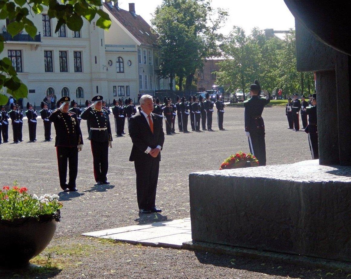 Ved statsbesøk er det tradisjon at det besøkende statsoverhodet legger ned krans på nasjonalmonumentet til minne om dem som falt under 2. verdenskrig. Kongeparet ledsaget President Gauck og fru Schadt til Akershus festning, der seremonien fant sted i formiddag.
