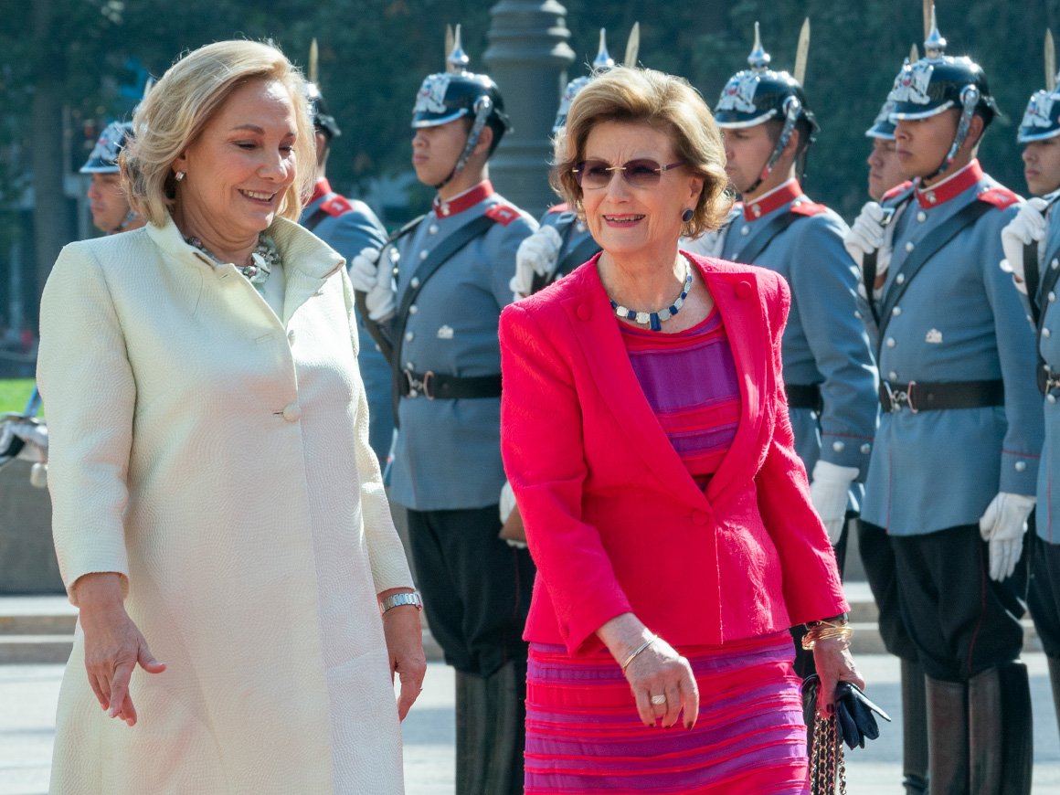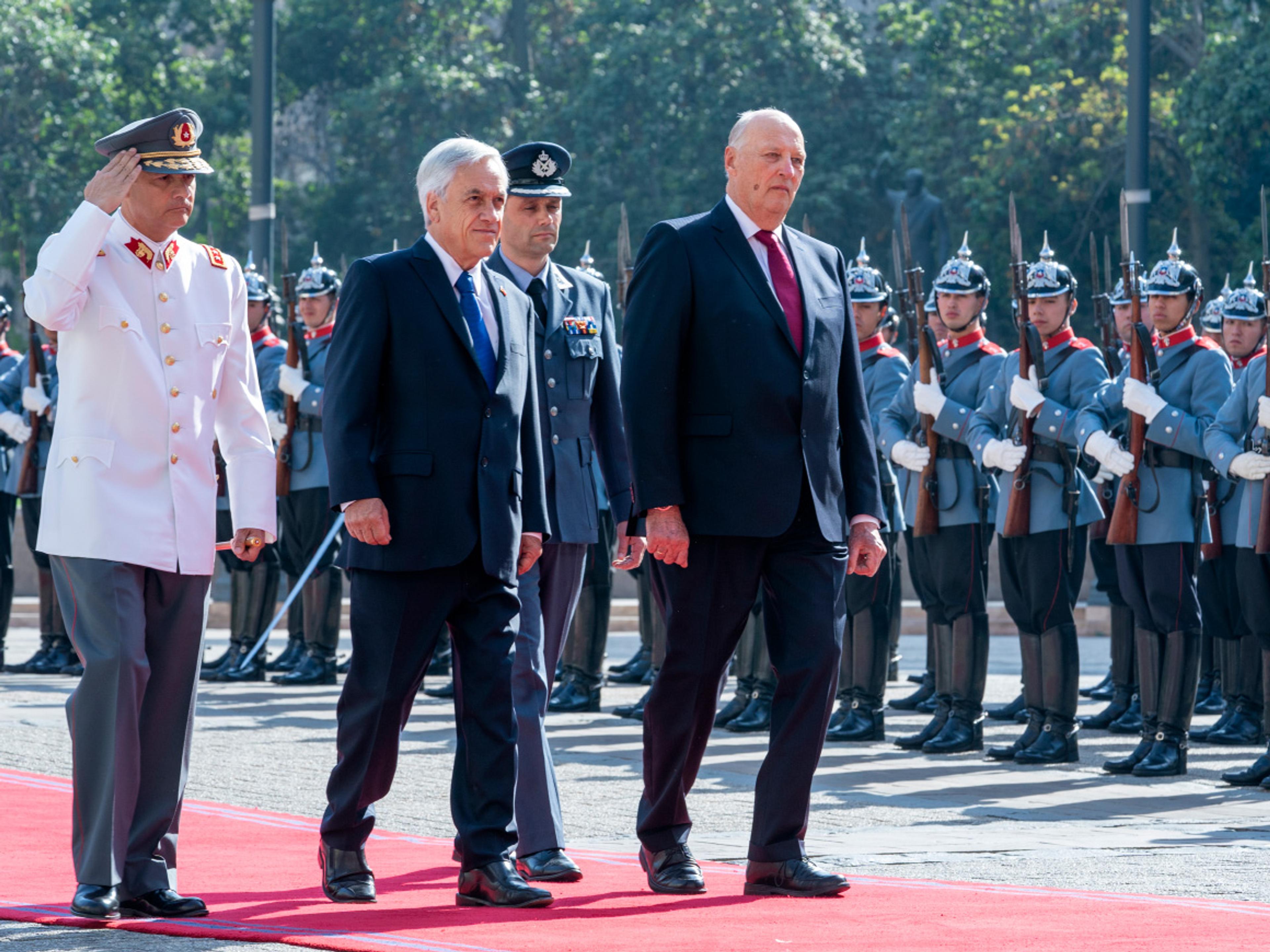 Selve velkomstseremonien fant sted utenfor presidentpalasset, La Moneda. Der ble Kongen og Dronningen ønsket velkommen til av President Piñera og Chiles førstedame, Cecilia Morel Montes. Kong Harald inspiserte æresgarden før begge landenes nasjonalsang ble spilt.