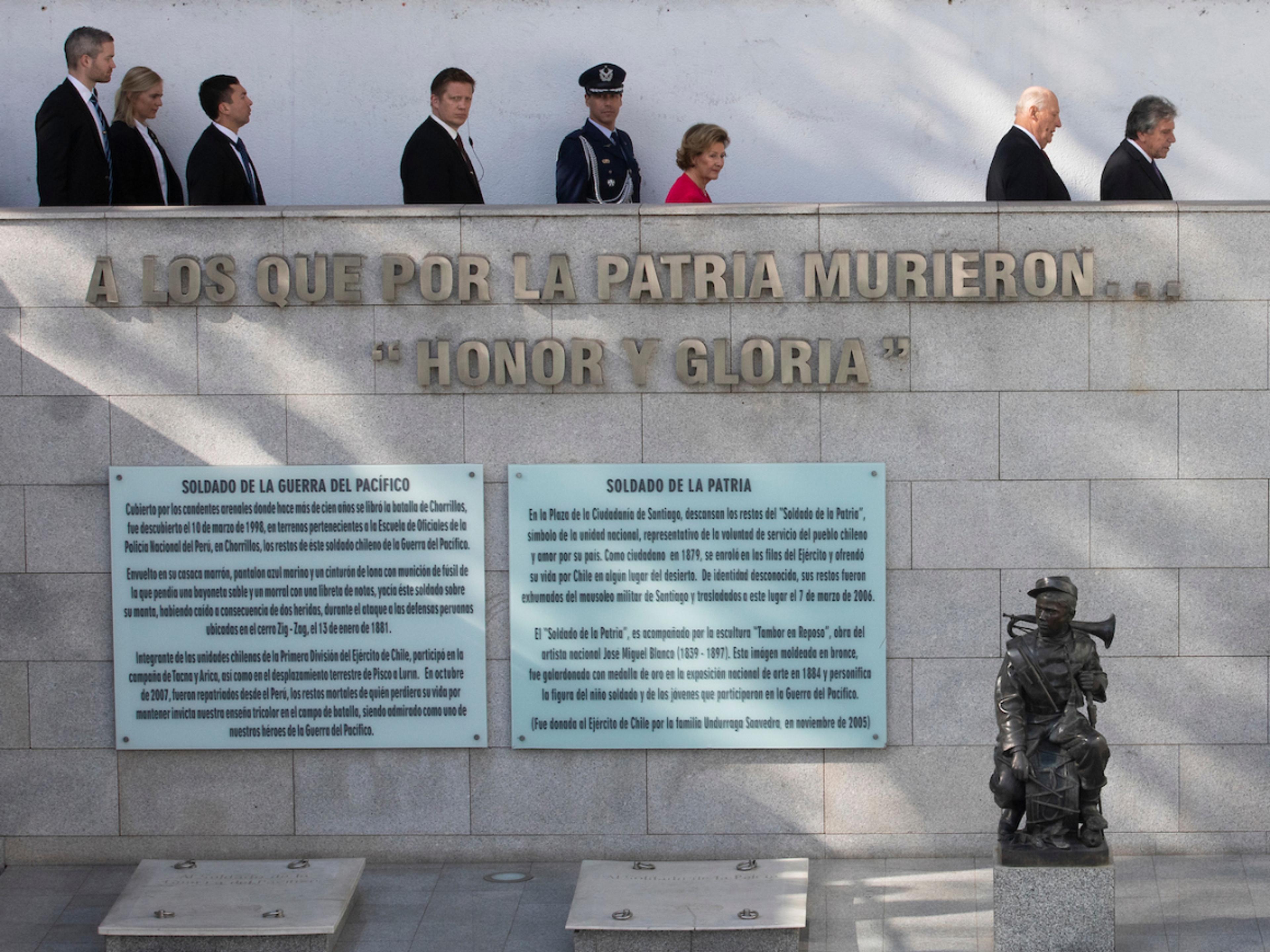Første del av Kongeparets besøk utspiller seg i Chiles hovedstad, Santiago, der en storslått velkomstseremoni ventet Kongen og Dronningen. Men aller først la Kong Harald og Dronning Sonja ned krans ved det chilenske nasjonalmonumentet.