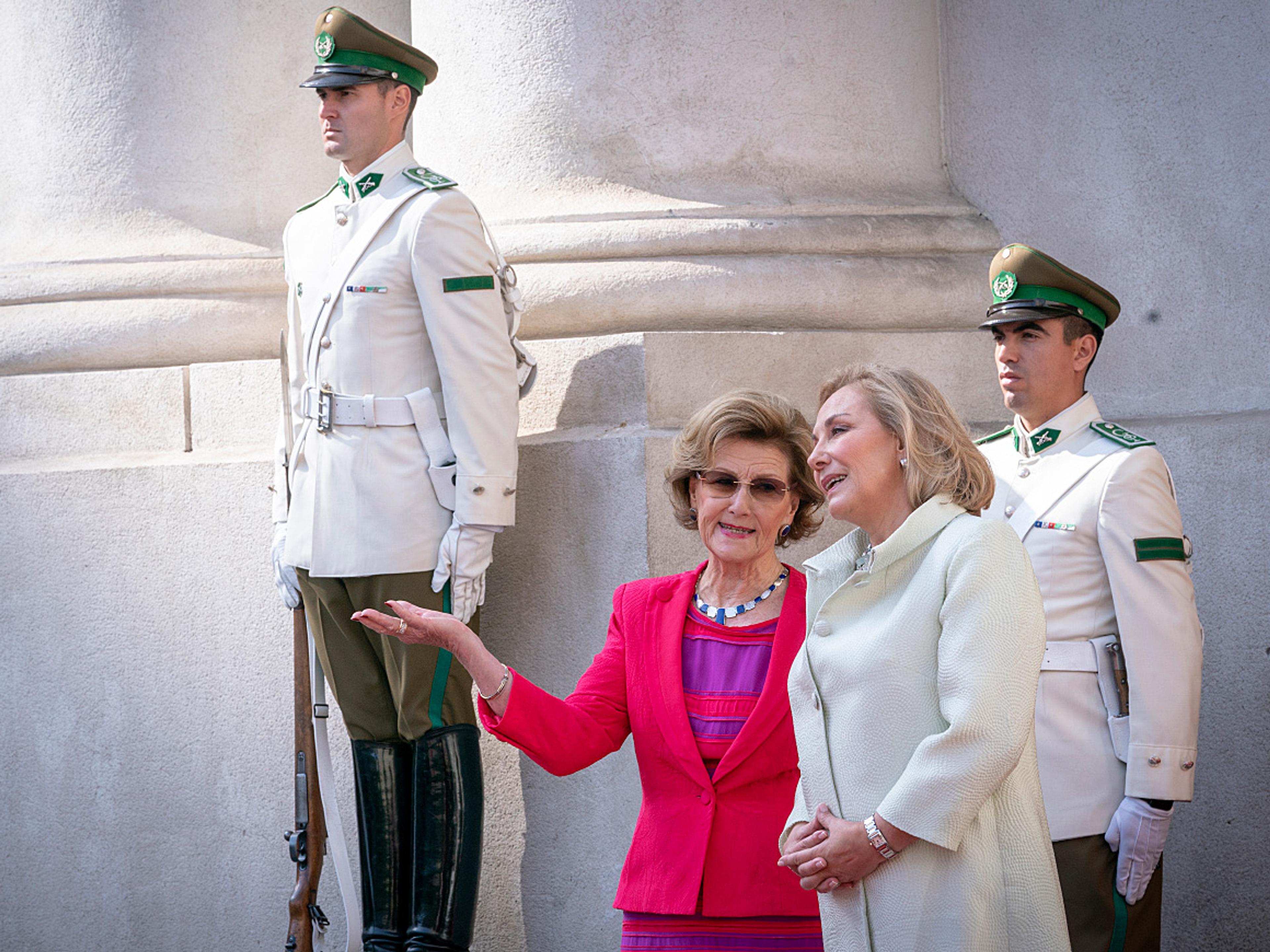 Kongeparet presenterte den norske hoveddelegasjonen for Presidenten, som presenterte den chilenske for Kongeparet og deres følge. Etter velkomstseremonien gikk ferden inn i Presidentpalasset for samtaler mellom Kongeparet og Presidentparet, og videre møter mellom delegasjonene. Utenriksminister Ine Eriksen Søreide og fiskeriminister Harald T. Nesvik ledsager Kongeparet under besøket, i tillegg til en stor næringslivsdelegasjon og representanter for norsk samfunns- og kulturliv. Flere samarbeidsavtaler ble signert allerede etter dagens møter.