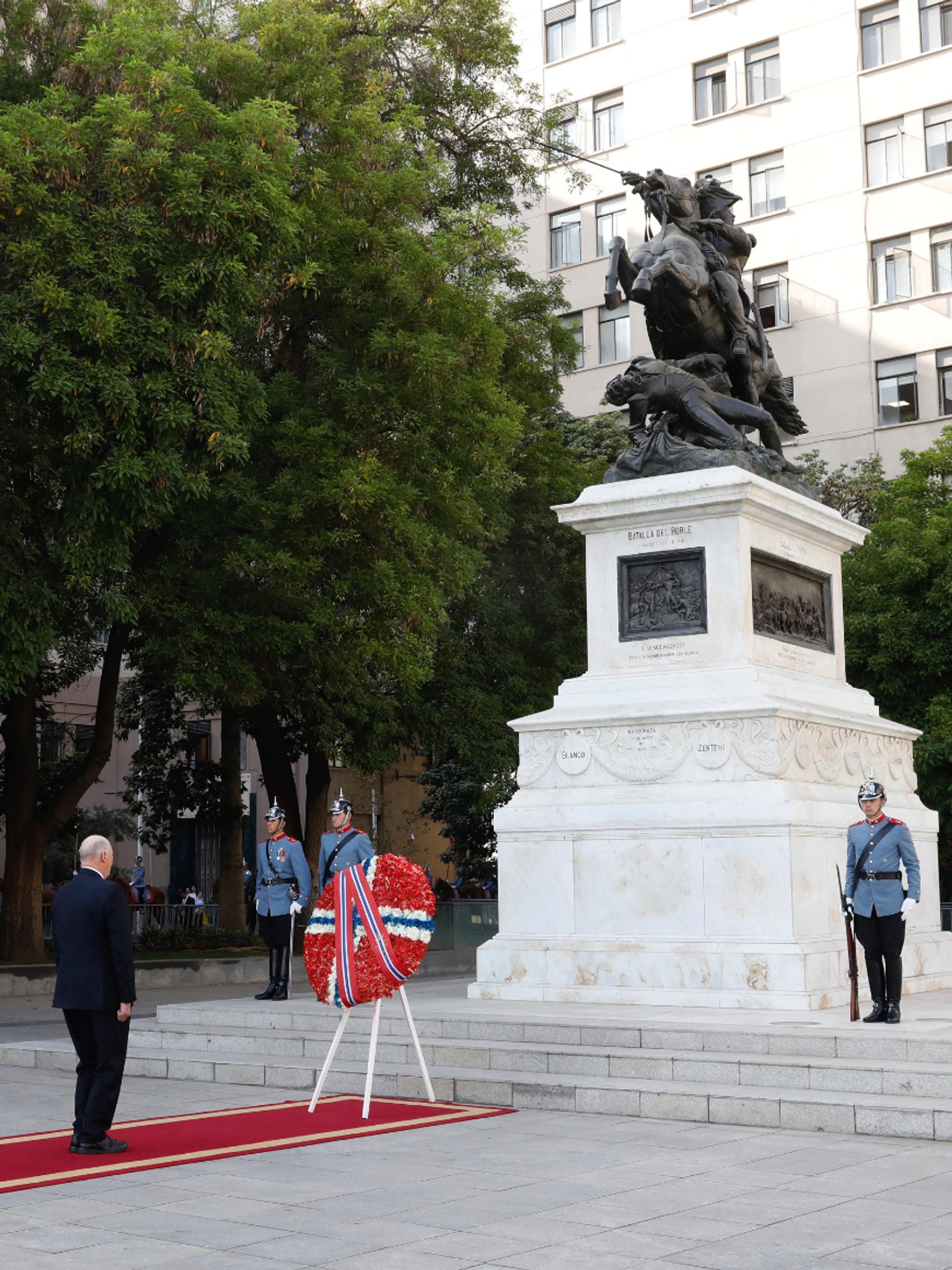 Bernardo O'Higgins ledet uavhengighetskampen mot den spanske kolonimakten og regnes som Chiles landsfader. Da landet erklærte sin selvstendighet i 1818 ble frigjøringshelten O'Higgins Chiles første statssjef. Det er han som æres med det store monumentet utenfor presidentpalasset, der Kongeparet la ned krans under en høytidelig seremoni i formiddag.