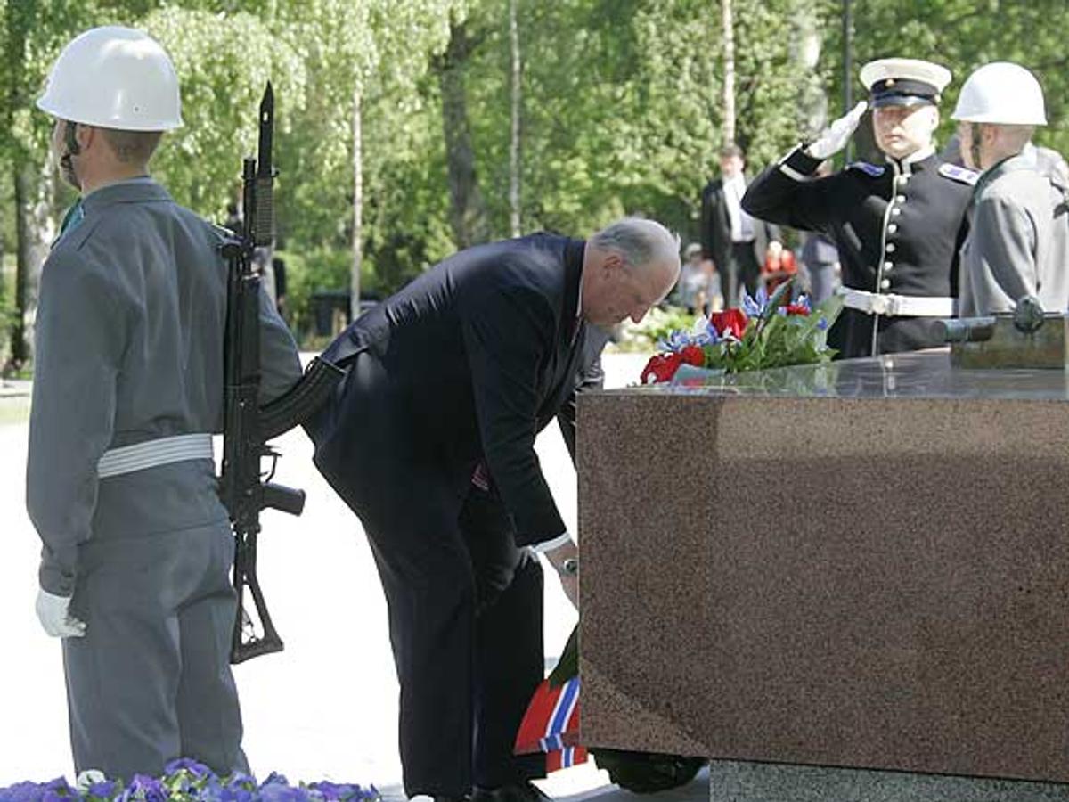 H.M. Kongen la ned krans ved heltekorset og ved marskalk Mannerheims grav. Deretter la H.M. Dronningen blomster ved minnesteinen over de norske frivillige fra Vinterkrigen.