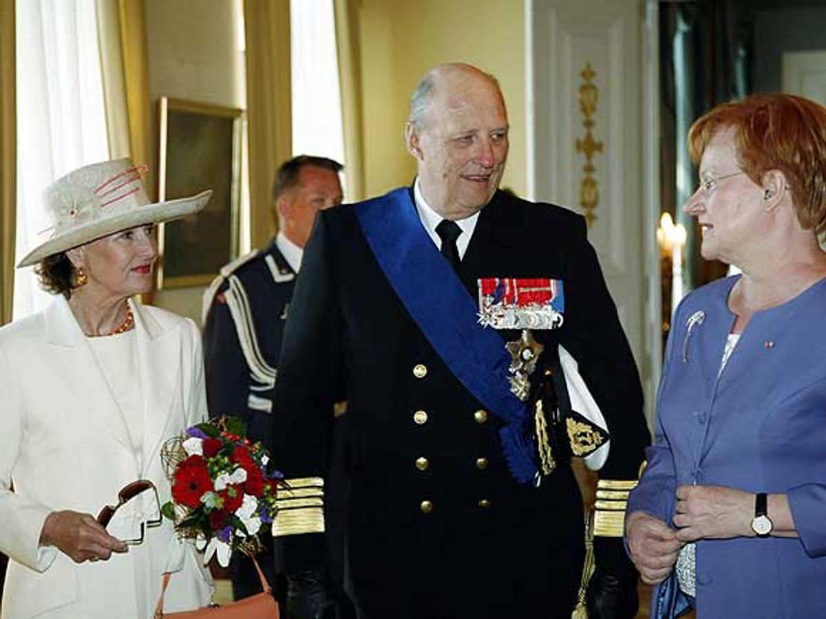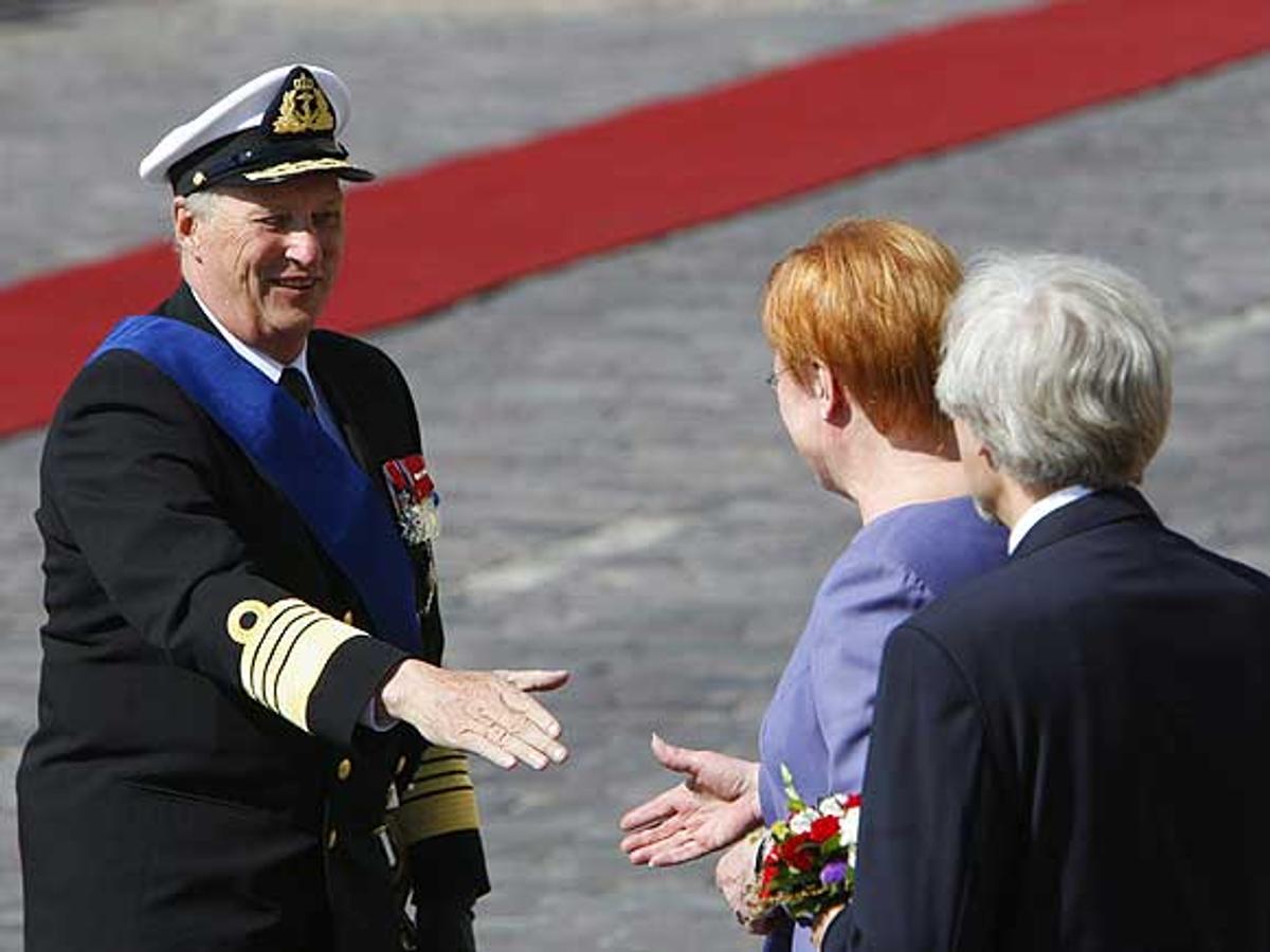 Den offisielle velkomstseremonien fant sted utenfor presidentpalasset, der President Halonen og hennes mann dr. Pentti Arajärvi tok i mot Kongen og Dronningen.