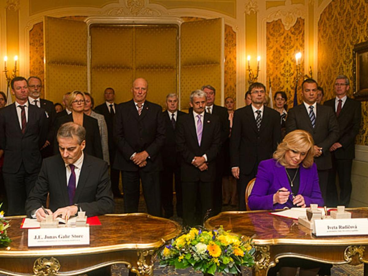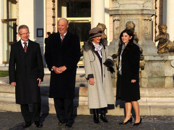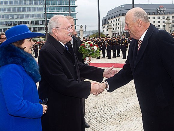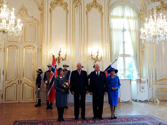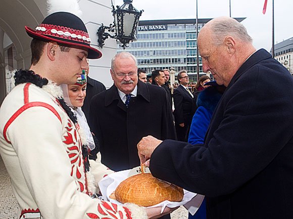 Den høgtidelege velkomstseremonien vart halden i føremiddag, da H.E. President Ivan Gašparovič og fru Silvia Gašparovičová ønskte Kongeparet velkommen på tradisjonelt vis: med brød og salt. Kong Harald og President Gašparovič helsa flagget og æresgarden før dei offisielle delegasjonane vart presenterte.