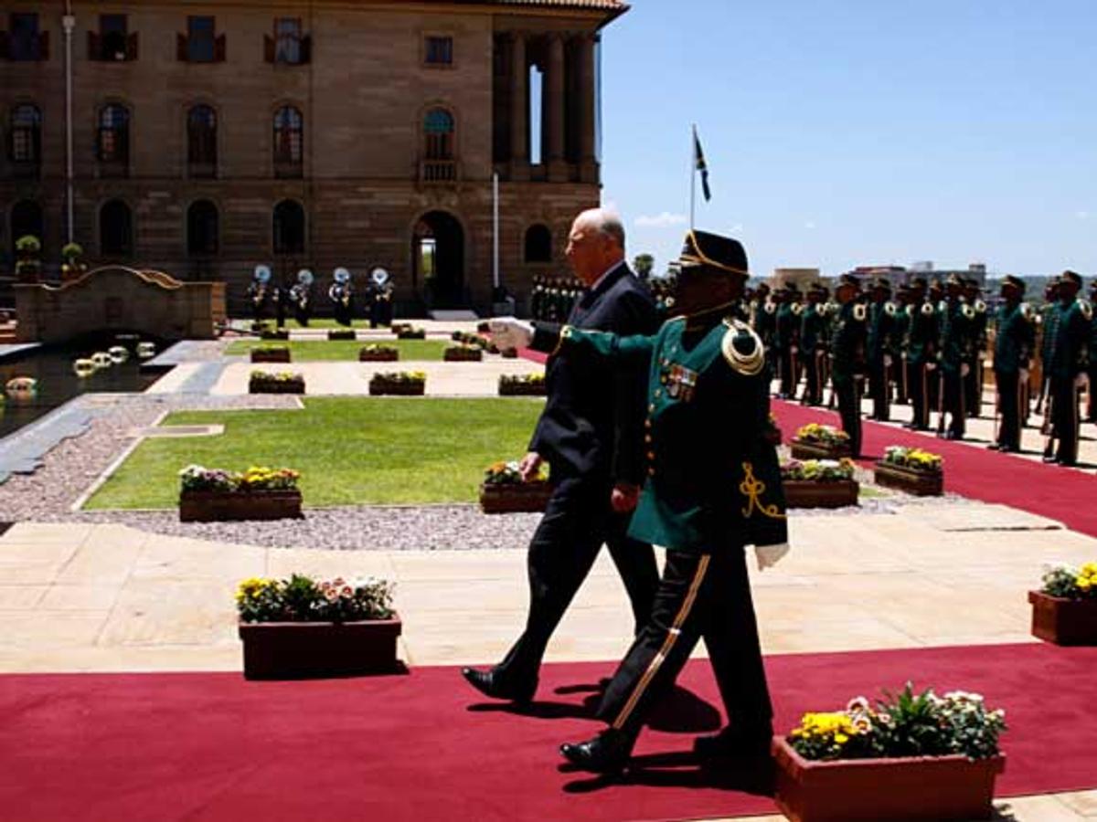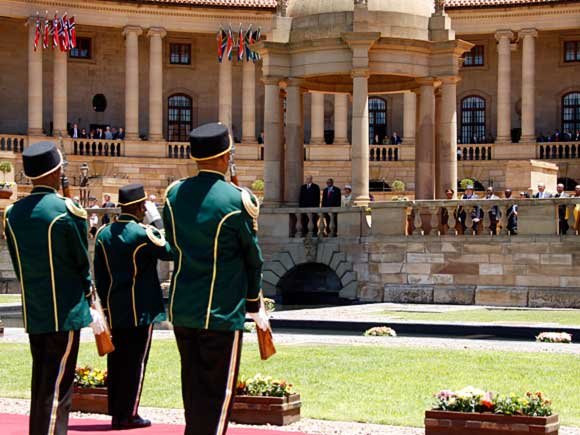 Kongen og Dronningen ble ønsket velkommen av President Jacob Zuma og fru Zuma med en høytidelig velkomstseremoni i Union Buildings. Stedet huser regjeringen og Presidentens kontorer, og er omgitt av et større anlegg med en rekke minnesmerker. Det er her innsettelsesseremoniene for nye presidenter finner sted.