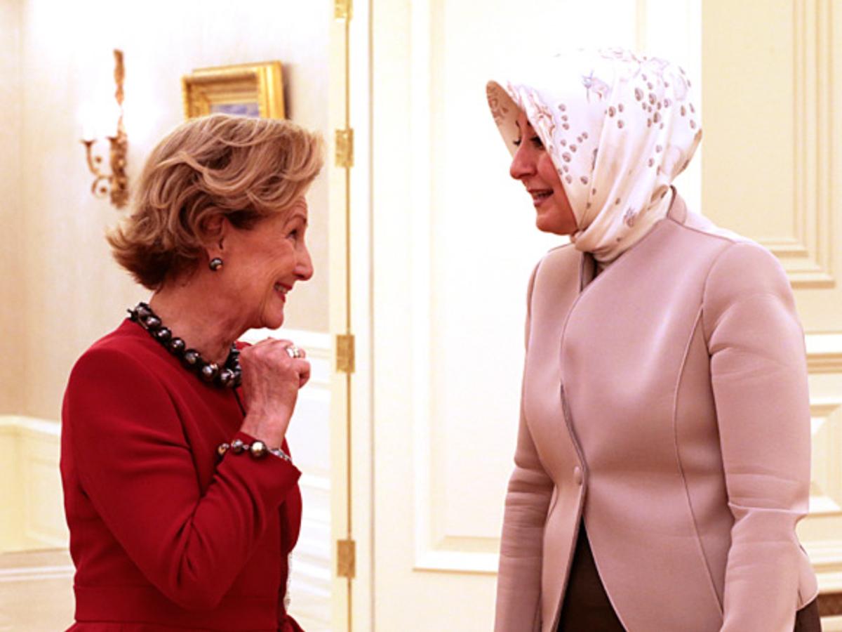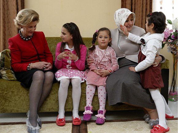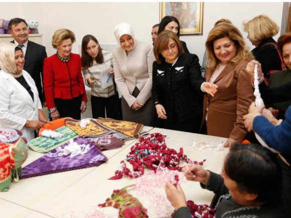 Dronningen og Presidentfruen møtte funksjonshemmede som lager kunst og håndtverksprodukter og fikk også anledning til å snakke med noen av barna som bor på Sevgi Evleri.