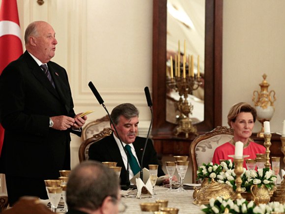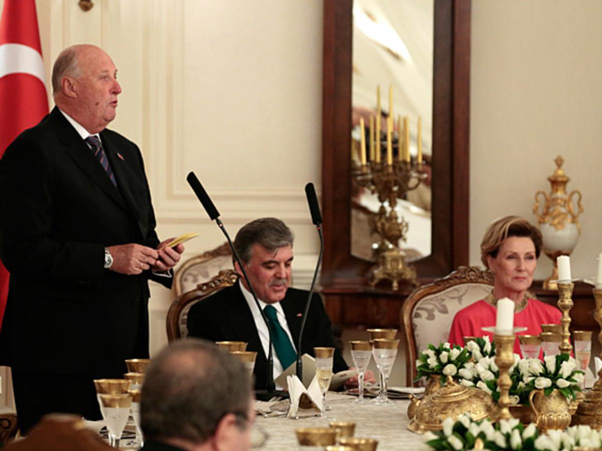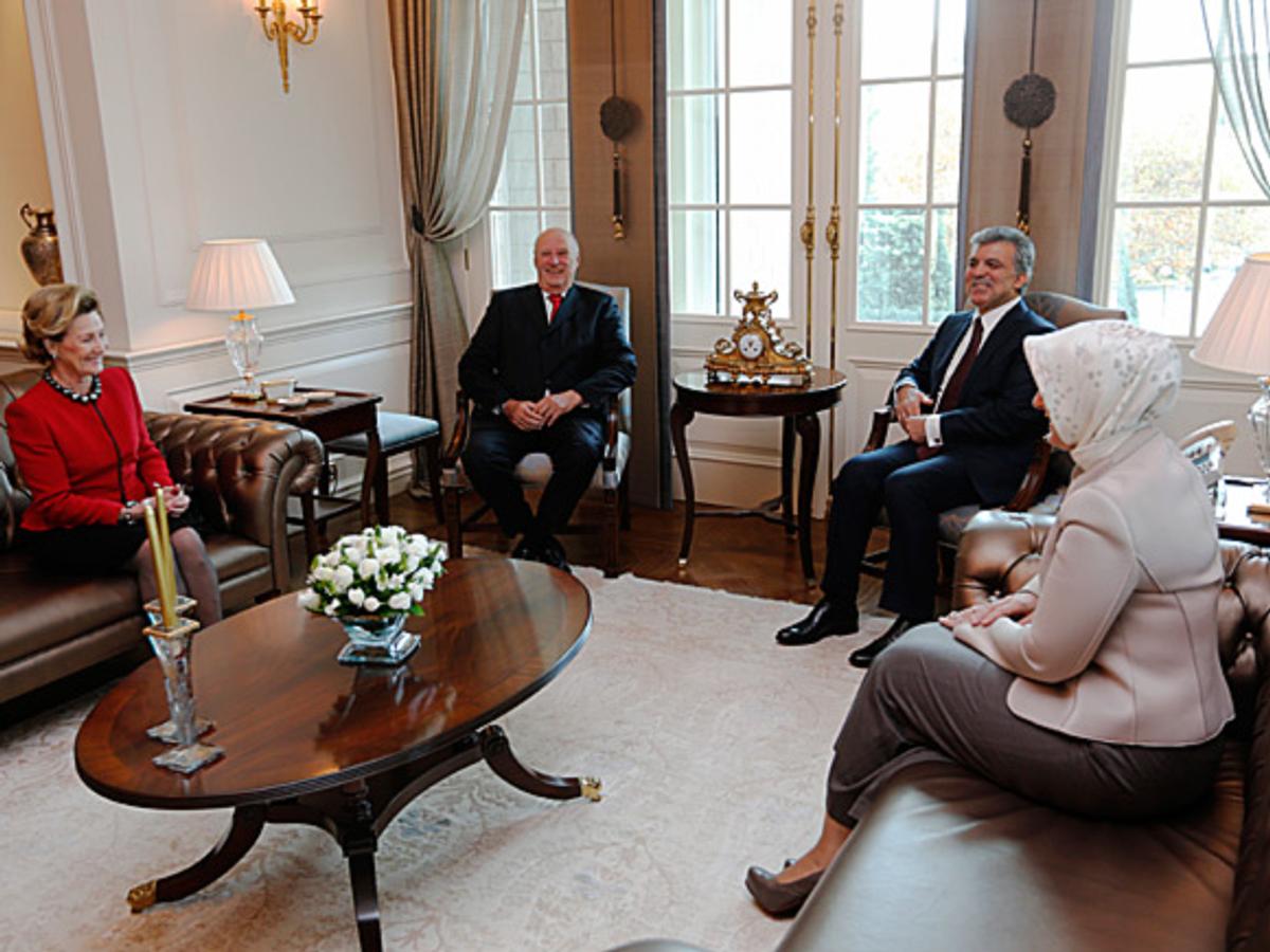Kongen og Dronningen ble ønsket offisielt velkommen til Tyrkia av sitt vertskap, H.E. President Abdullah Gül og fru Hayrünnisa Gül utenfor Presidentpalasset i Ankara. Etter begge lands nasjonalsanger, inspiserte Kong Harald og President Gül æresvakten, før delegasjonene ble presentert.