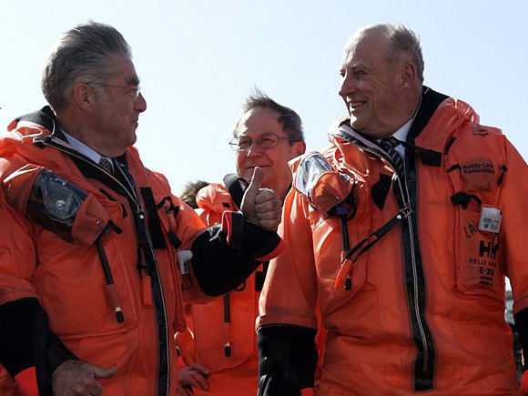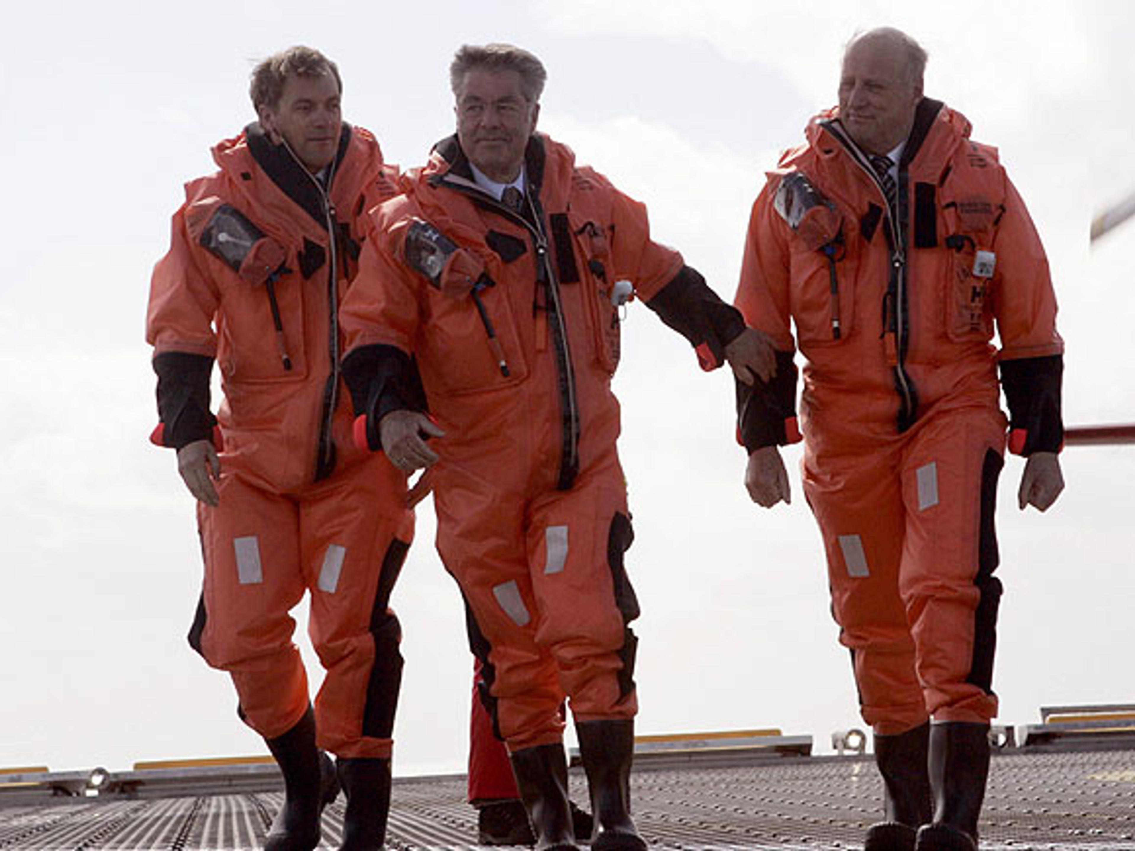Kong Harald og President Fischer reiste i formiddag med helikopter til Oseberg feltsenter, der de fikk et innblikk i norsk offshore-virksomhet og -teknologi. Hydros konsernsjef Eivind Reiten var vert for omvisningen, som inkluderte både sikkerhetsgjennomgang og presentasjon av Oseberg-området. Østerrike er blant landene som mottar gass fra Osebergplattformen.