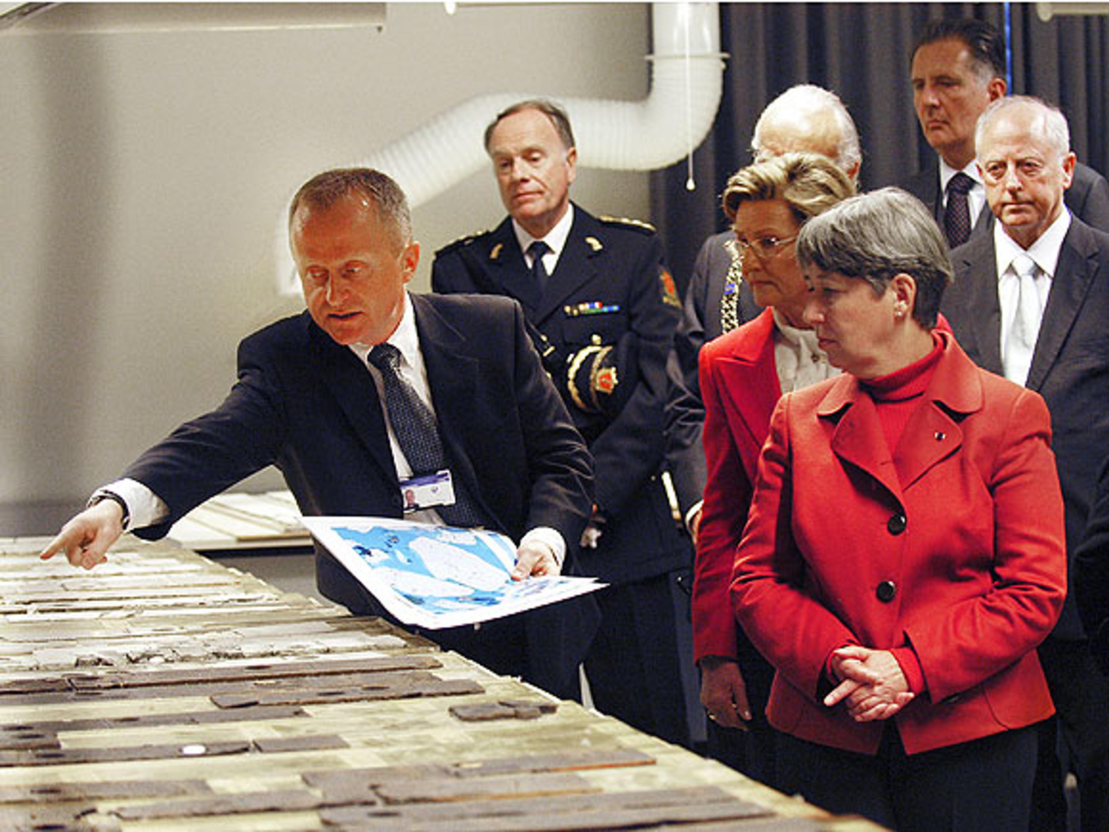 Parallelt besøkte fru Fischer og H.M. Dronningen Norsk Hydros forskningssenter på Sandsli. Her fikk Dronningen og Presidentfruen en innføring i hvordan man leter etter olje og gass på havbunnen.