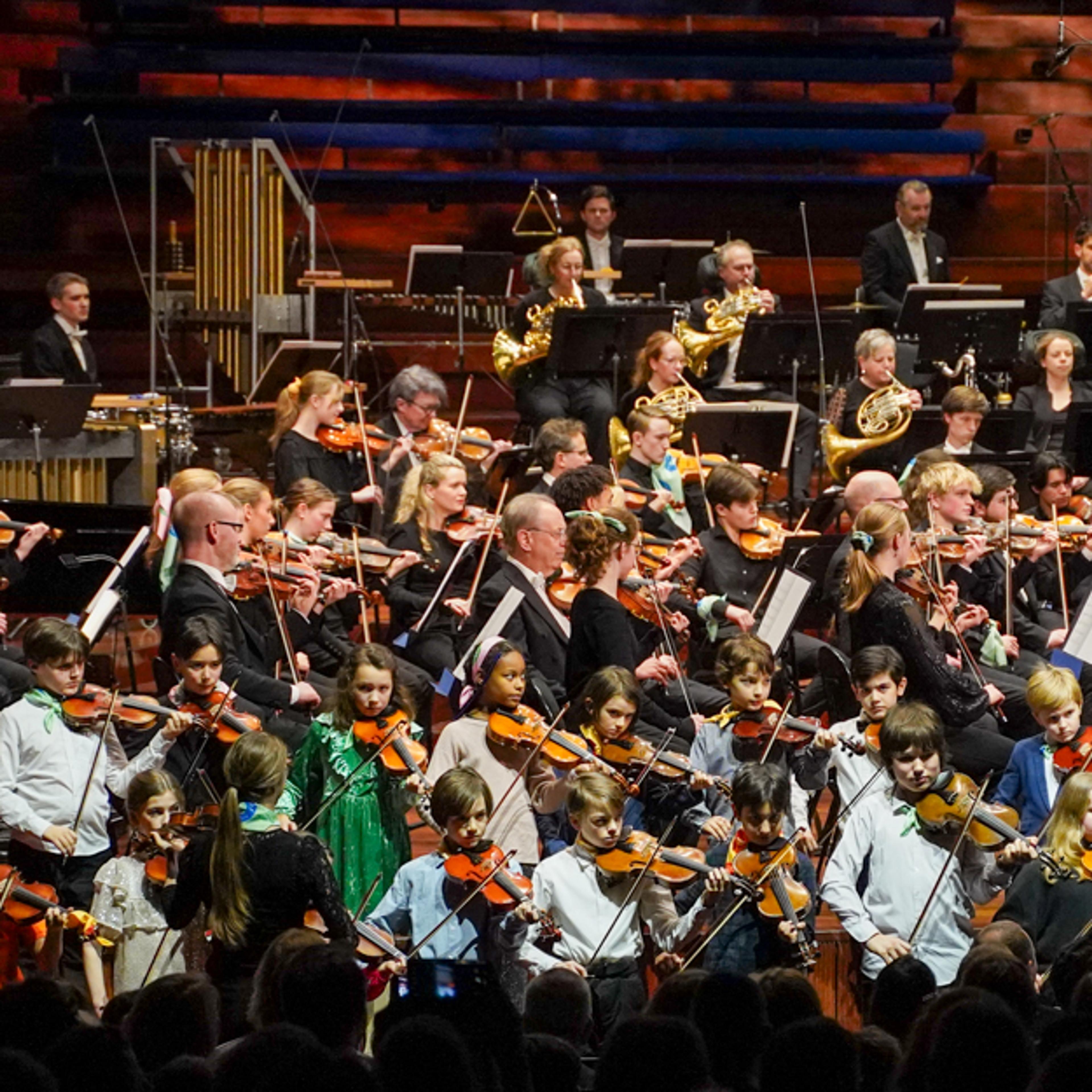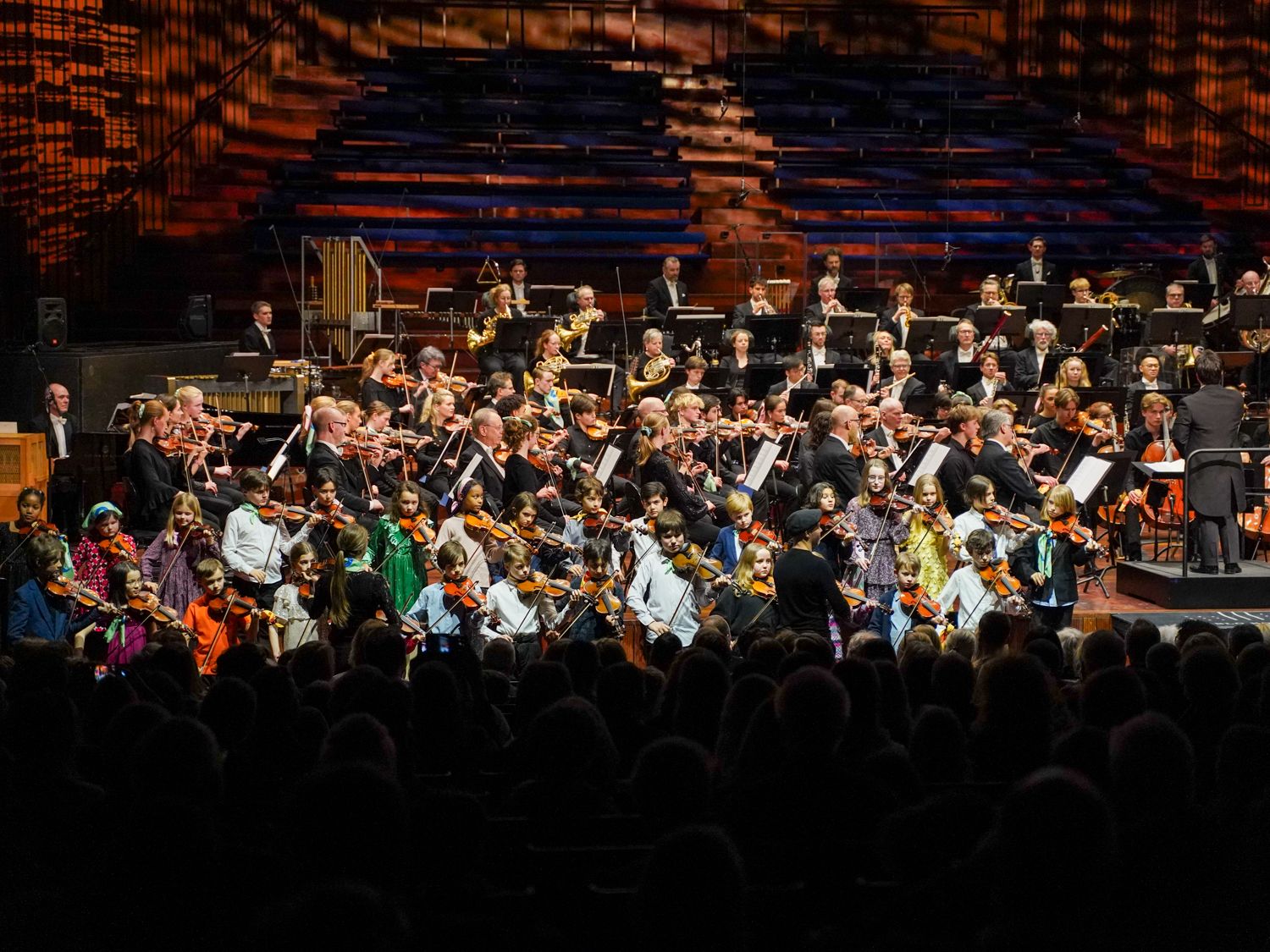 På scena i konsertlokalet sat Oslo-filharmonien side om side med unge musikarar frå Vestre Aker strykeorkester og NOR59. Dei serverte ein hitparade av kjende melodiar og filmmusikkstykke under leiing av dirigent Aage Richard Meyer.