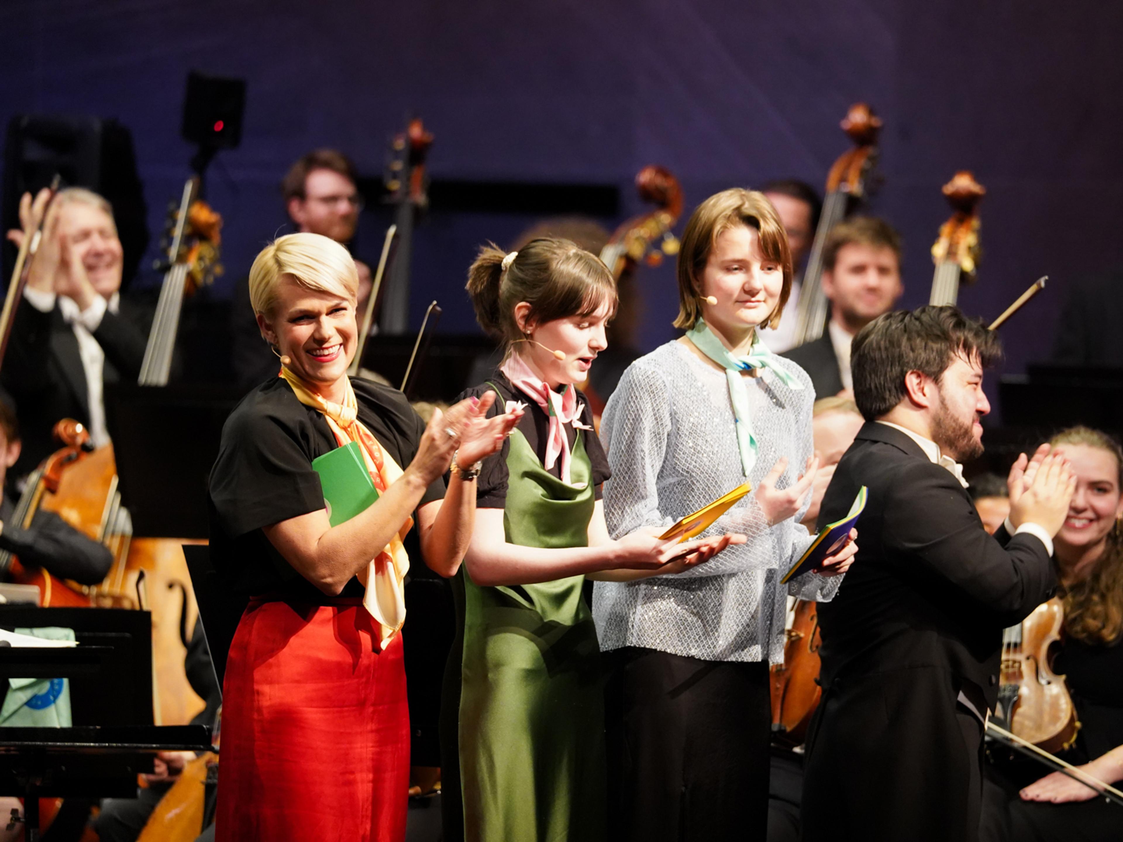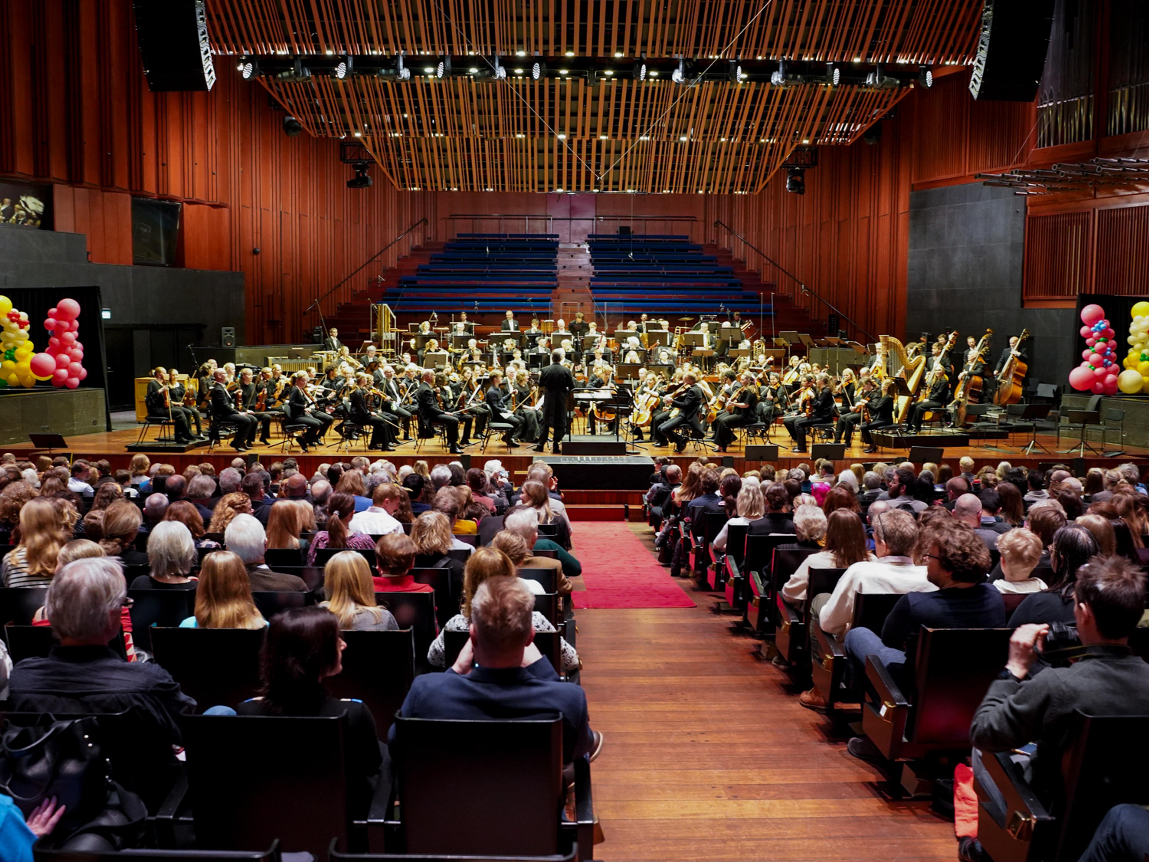 Før konsertens siste nummer, "Pomp and Circumstance nr. 1” av Edward Elgar, reiste publikum seg, vifta med Orkesteråret-flagg og song “Vi elskar orkester. Vi spelar på lag,” til den høgtidelege melodien.