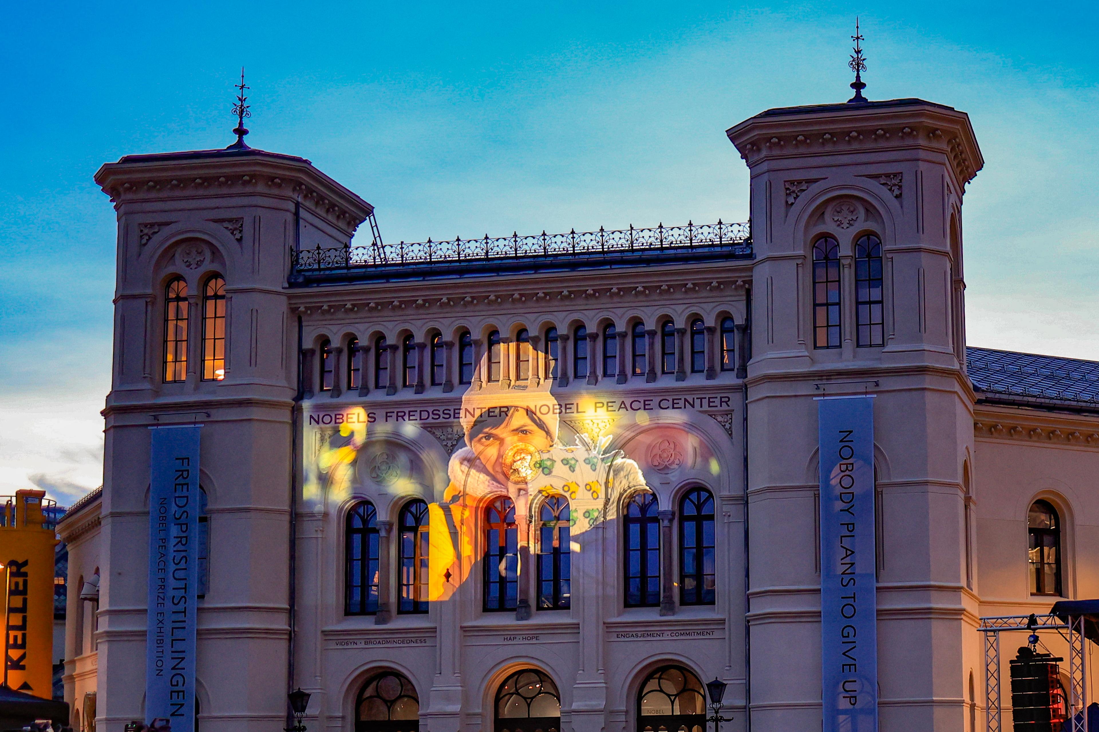 Bygningen der Nobels fredssenter holder til var lyst opp med bilder av mennesker som er rammet av krigen, de som hjelper til og de som får hjelp.