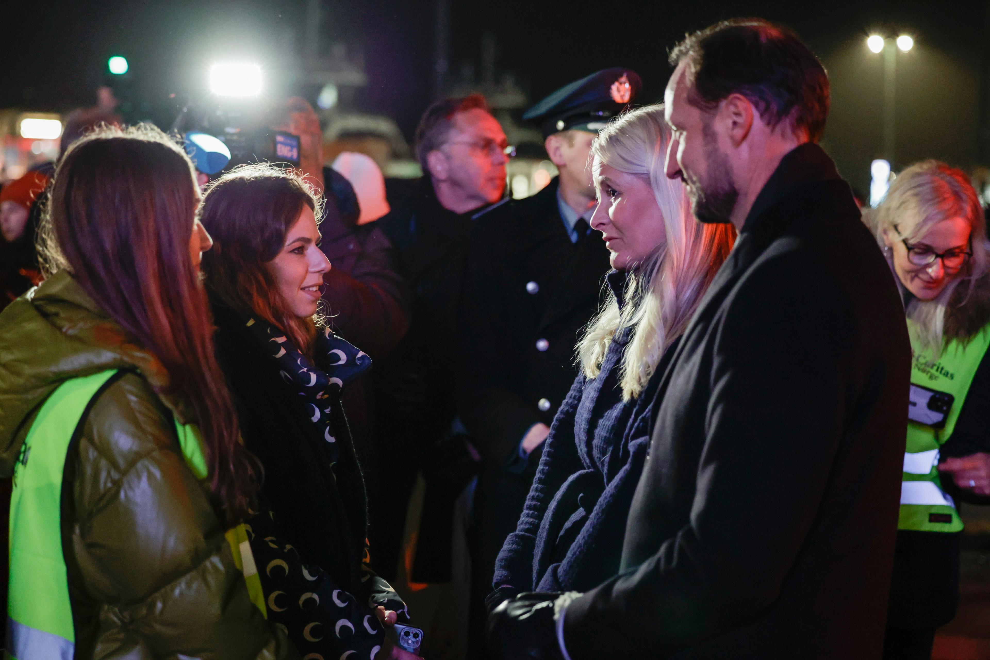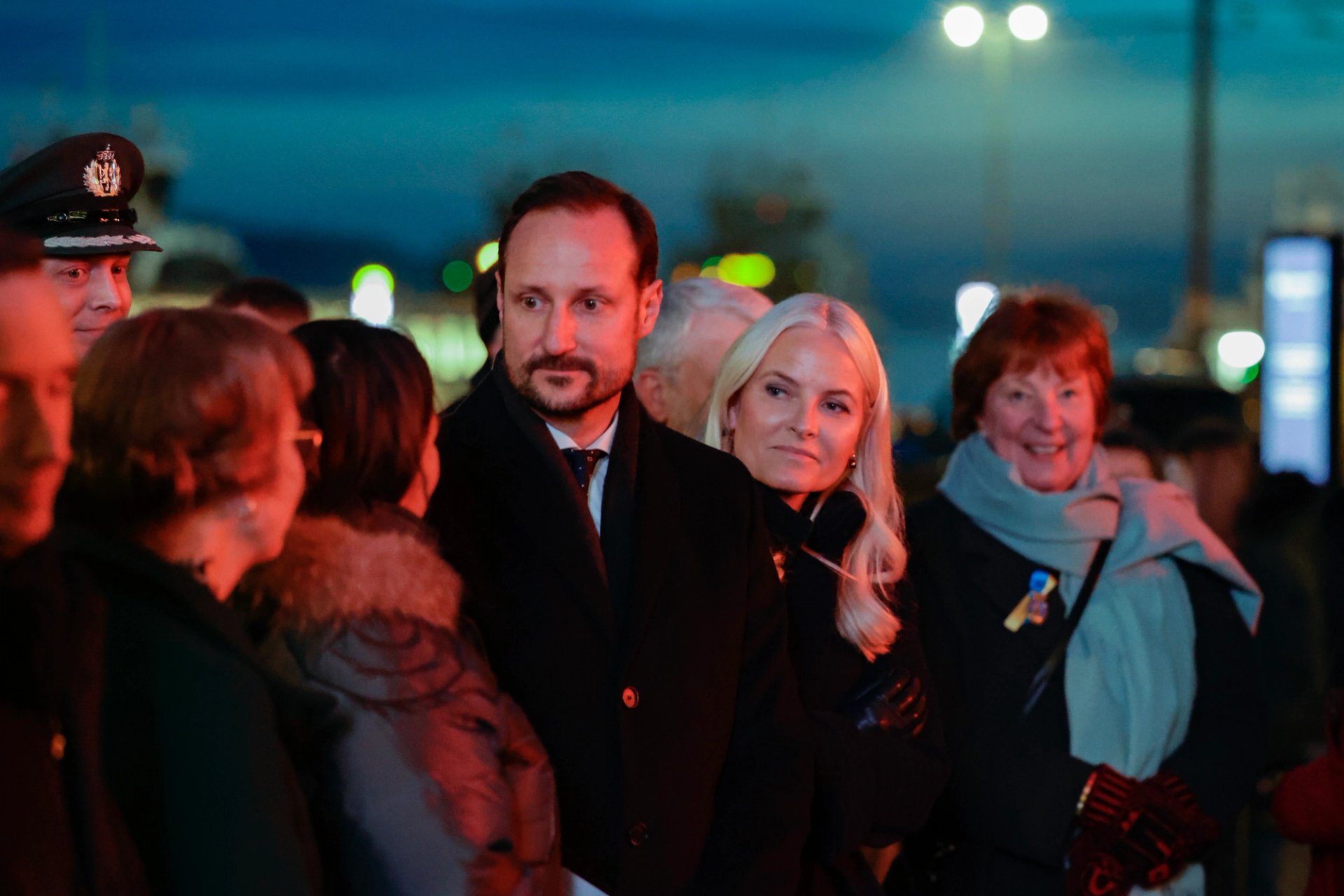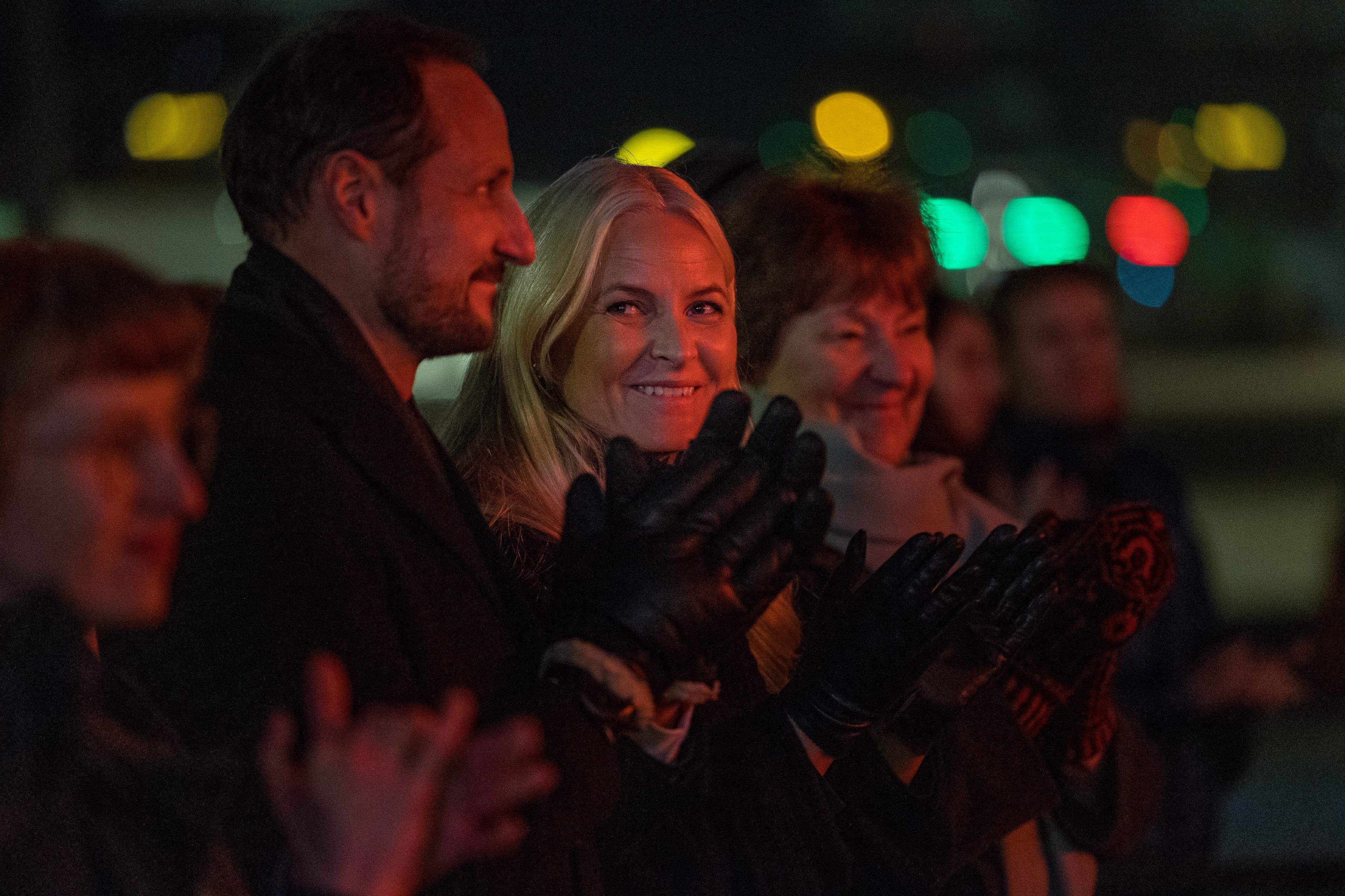 Kronprins Haakon og Kronprinsesse Mette-Marit ble tatt imot av ordfører Marianne Borgen, administrende direktør ved Nobels fredssenter Kjersti Fløgstad og generalsekretær i Norges Røde Kors Anne Bergh.