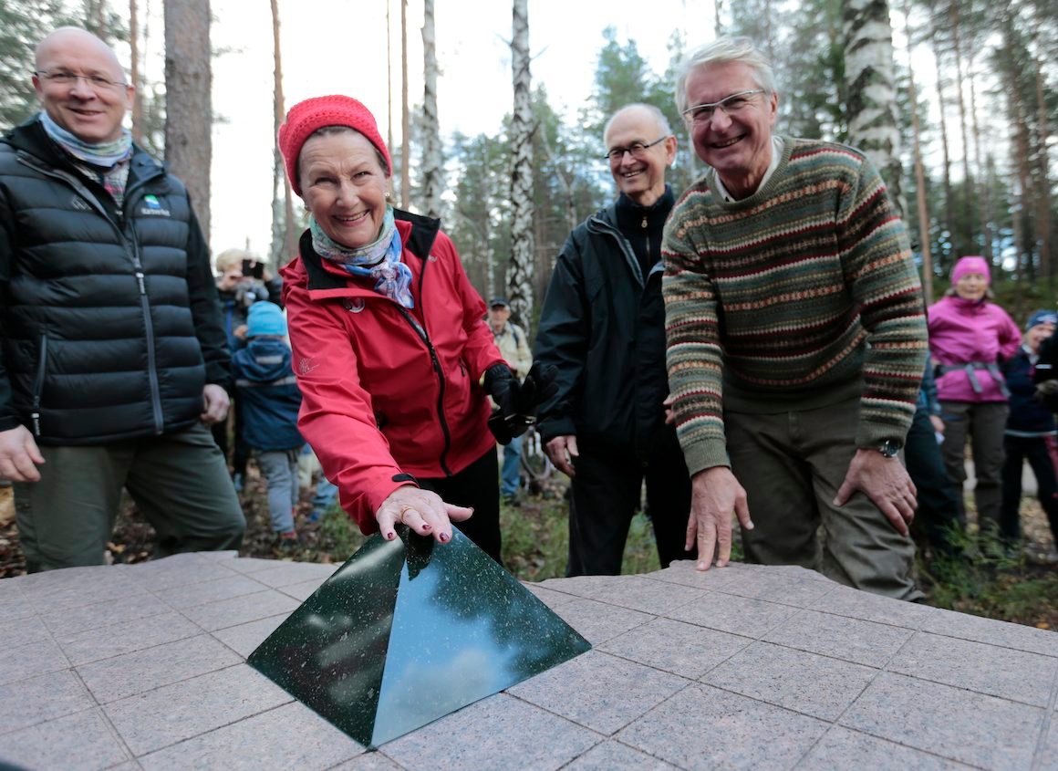 Saman med Dronning Sonja var ordførar Fabian Stang, biletkunstnar Jon Gundersen, kommunikasjonsdirektør Ole Magnus Grønli i Statens kartverk og divisjonsdirektør Kjetil S. Hansen i Bymiljøetaten til stades under den offisielle avdukinga av midtpunktet.