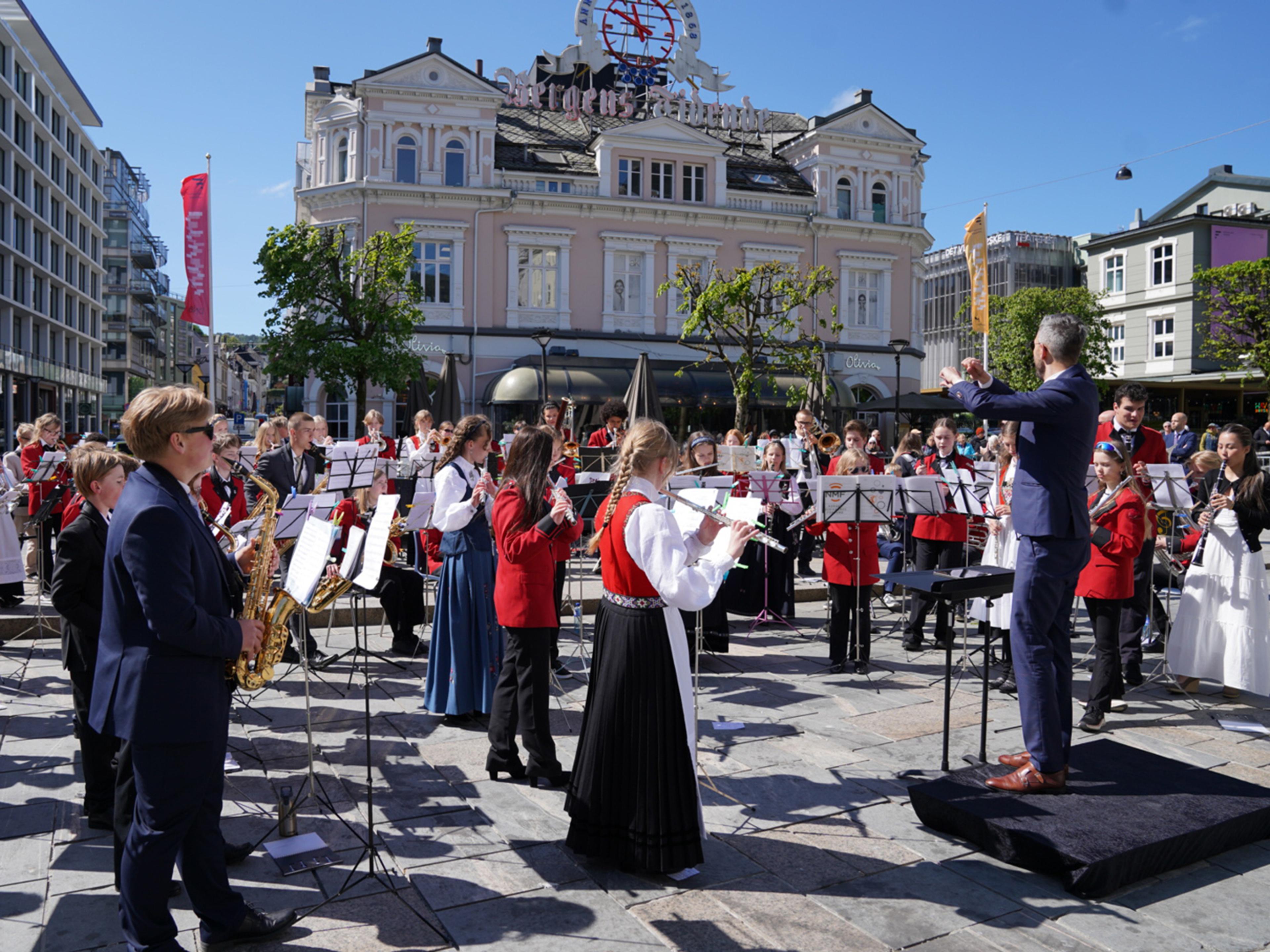 På scena i Bergen sentrum, framfor eit par tusen tilskodarar og med sol frå skyfri himmel, stod Bergen Filharmoniske Orkester under leiing av dirigent Grete Pedersen.