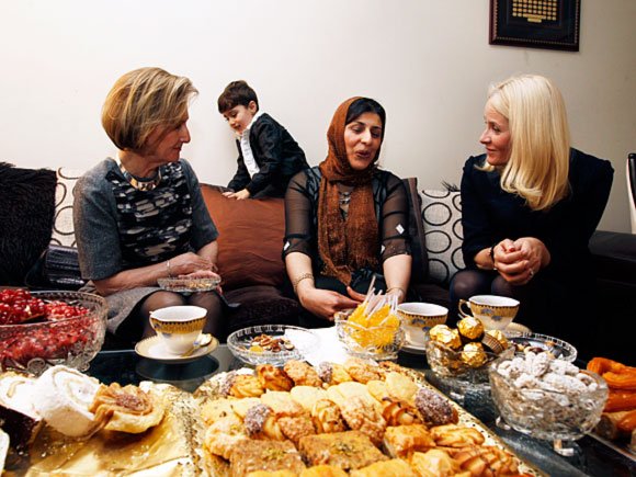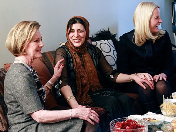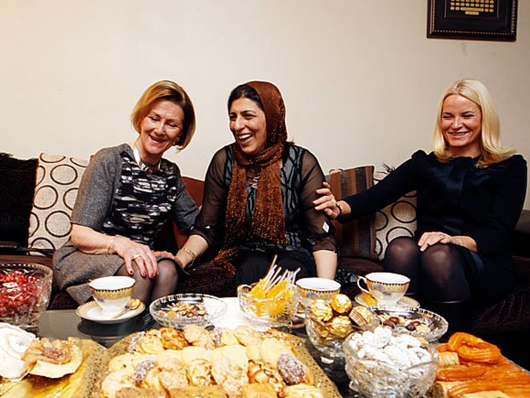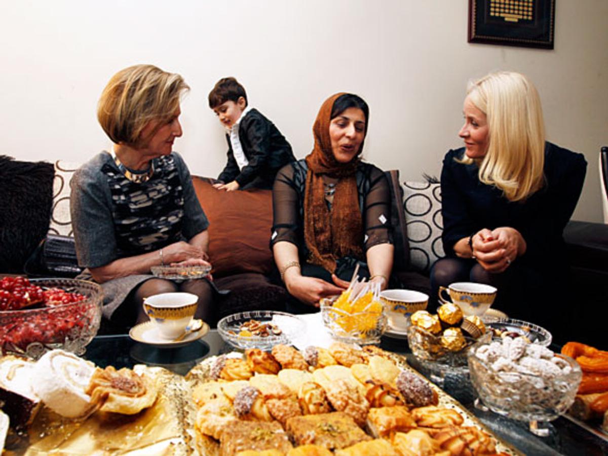 H.M. Dronninga og H.K.H. Kronprinsessa var inviterte på te hos familien Adampour på Grünerløkka i Oslo i dag. Besøket var eit ledd i Antirasistisk senters kampanje Tea Time, der muslimar inviterer ikkje-muslimar på te.