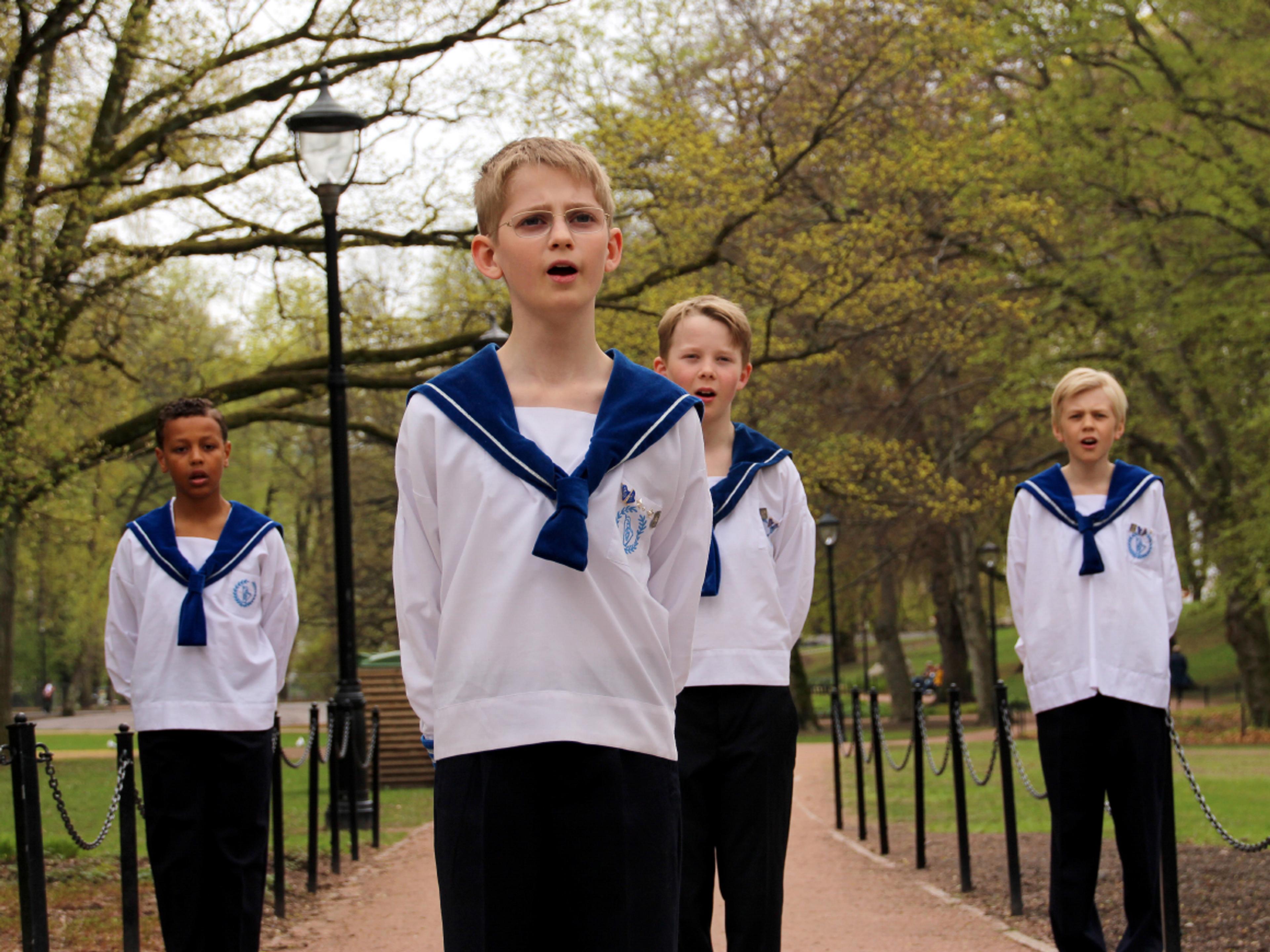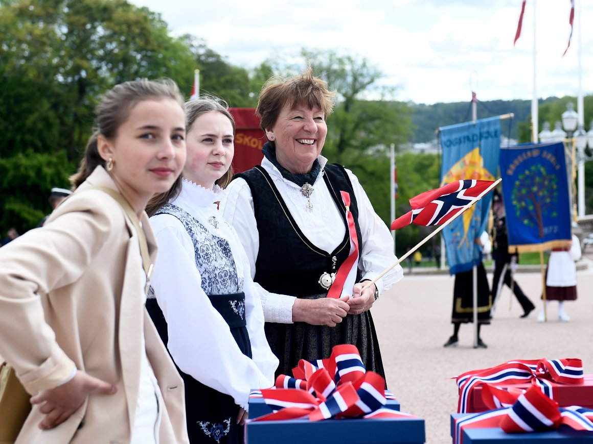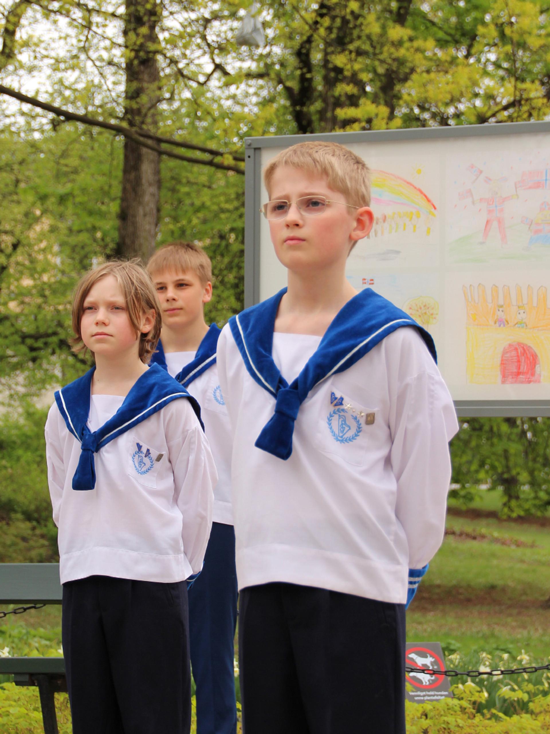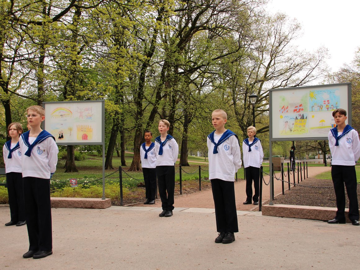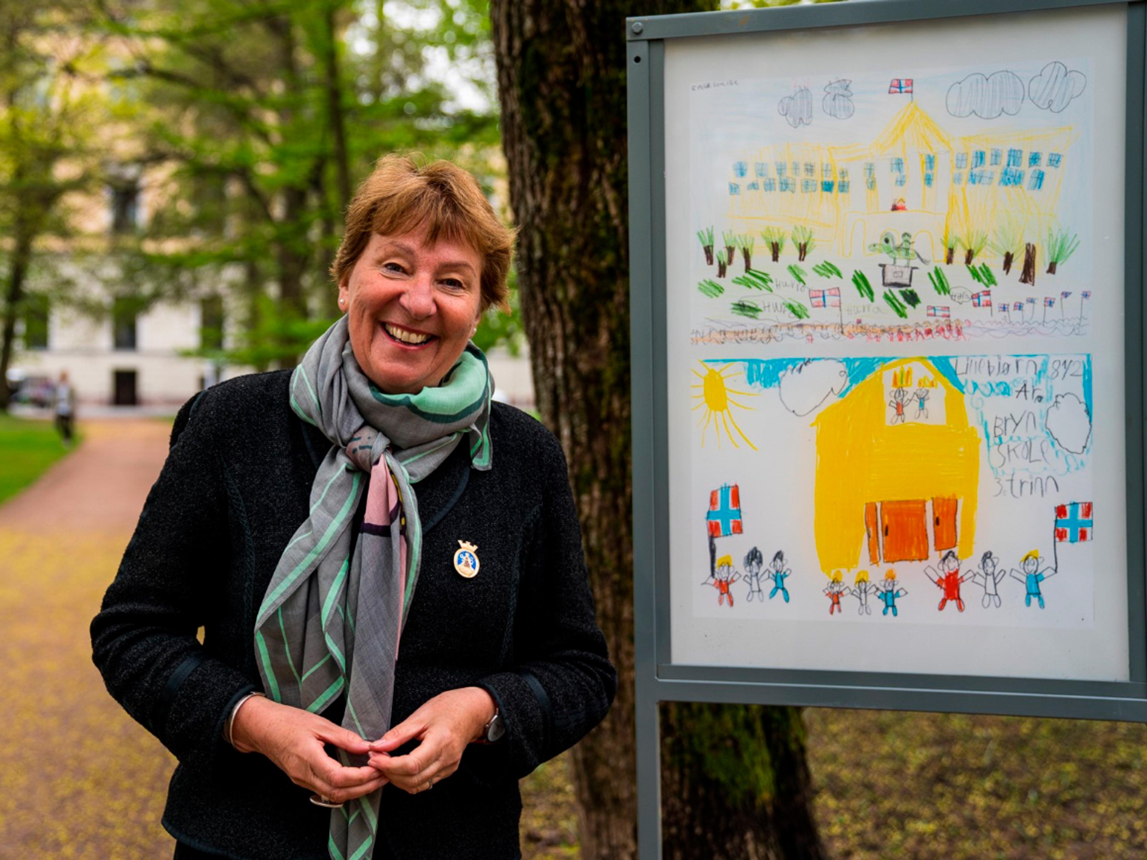 Det var Oslos ordfører Marianne Borgen som tok initiativet til tegningene før 17. mai i fjor, og tirsdag var hun til stede da den lille utstillingen ble markert i Slottsparken. Åtte sølvgutter satte stemningen med "Vi ere en nasjon vi med".