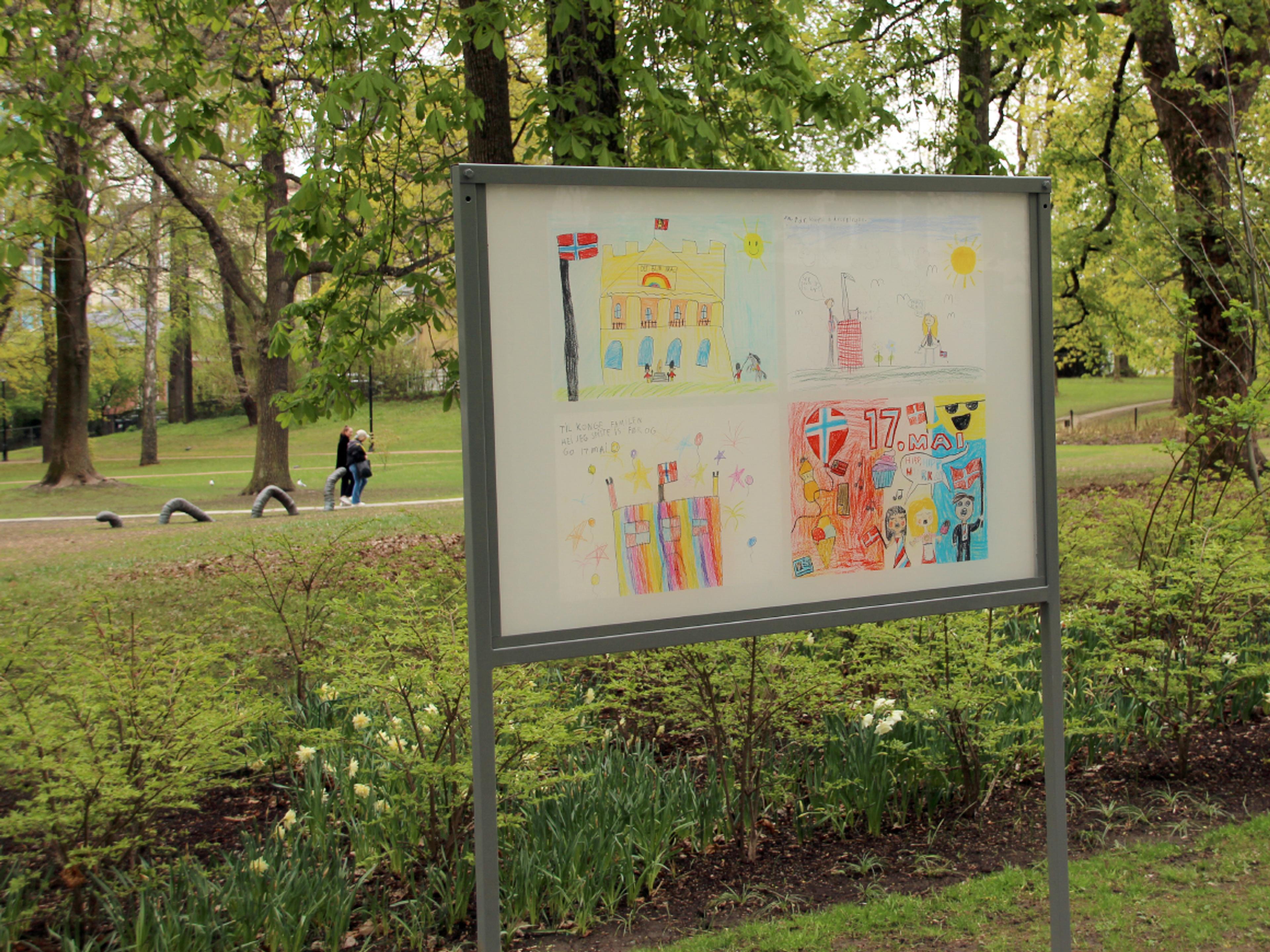 Forrige 17. mai fikk Kongeparet overrakt over 4 000 tegninger fra barn i Oslo. Nå nærmer vi oss en ny nasjonaldag, og et utvalg av tegningene stilles ut i Slottsparken.