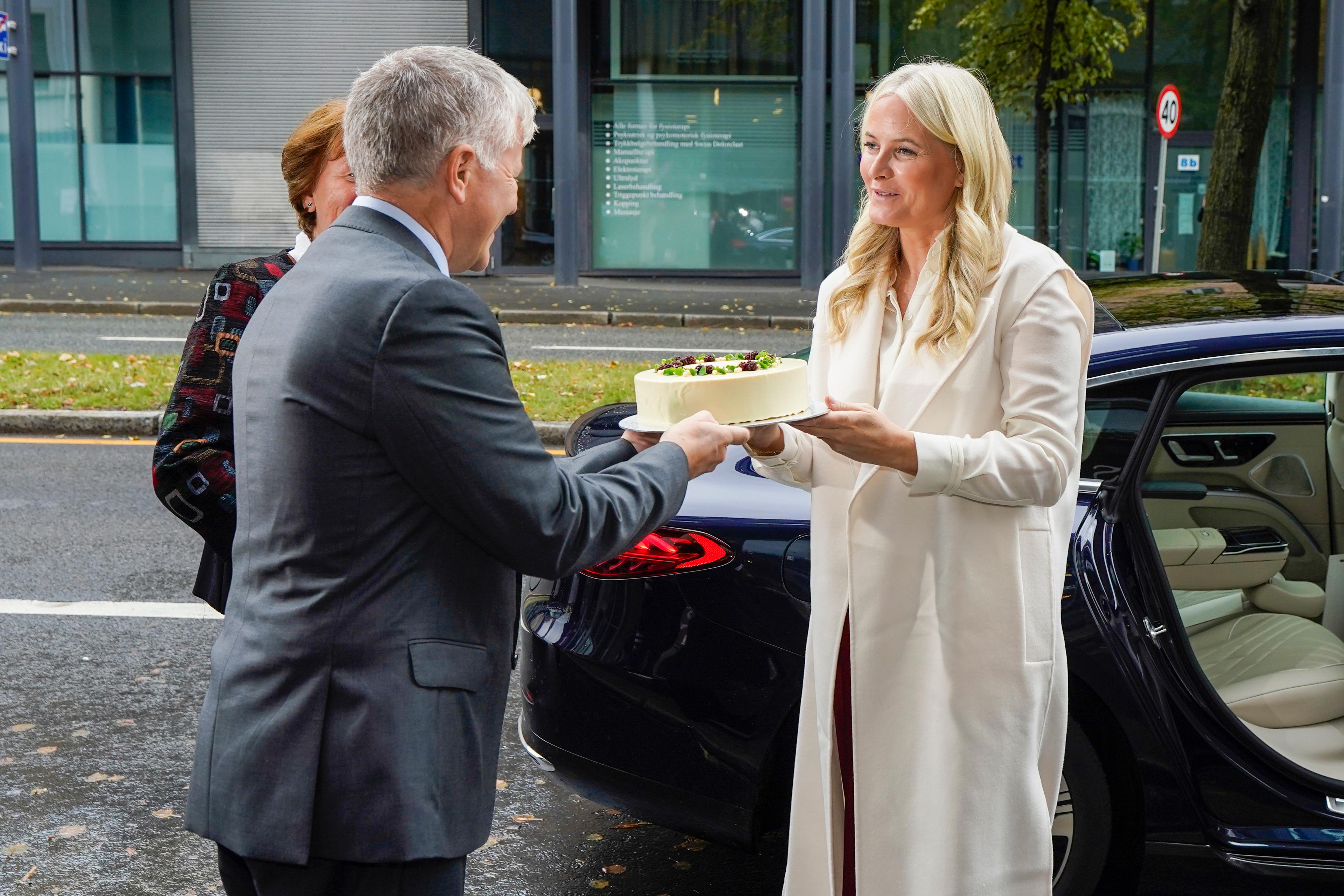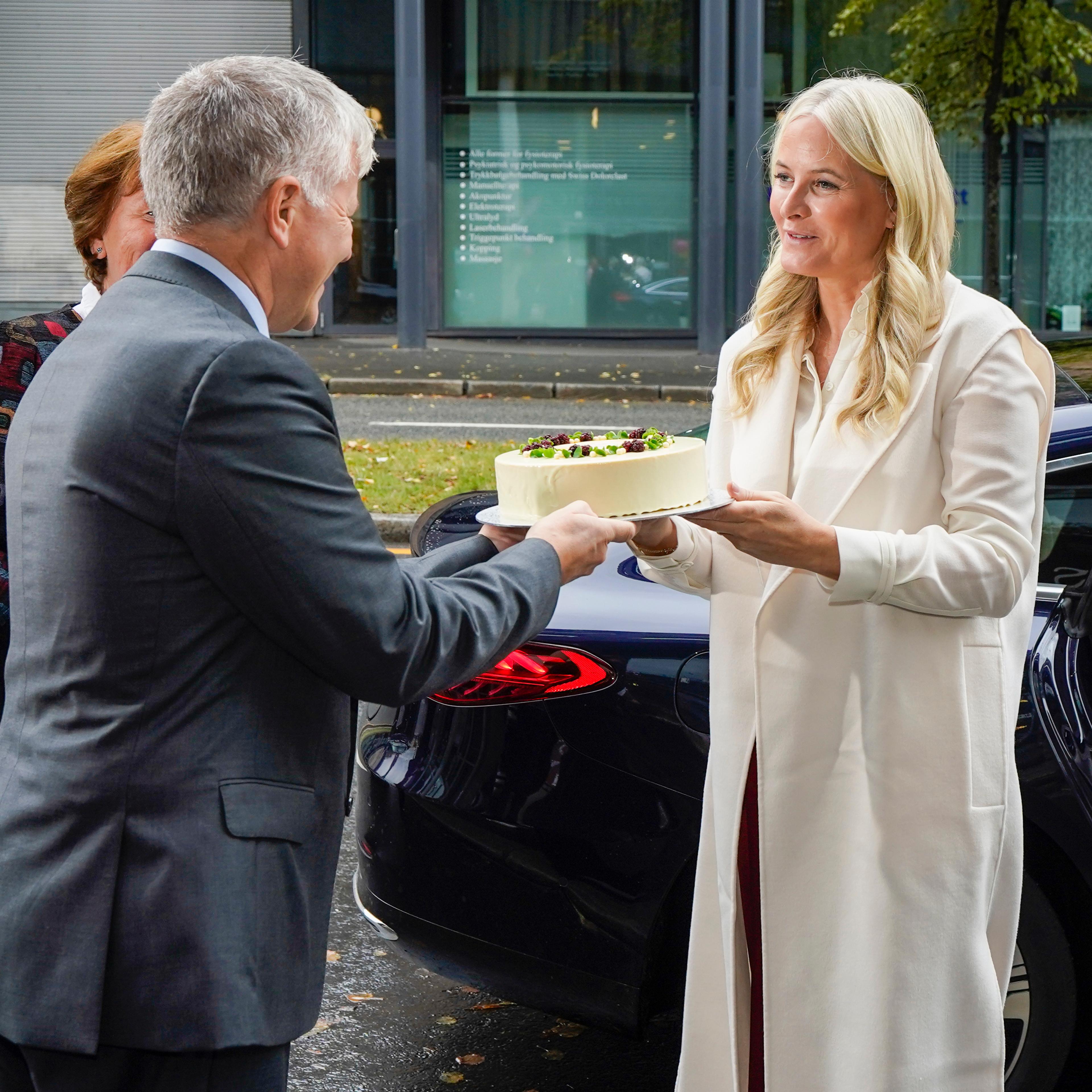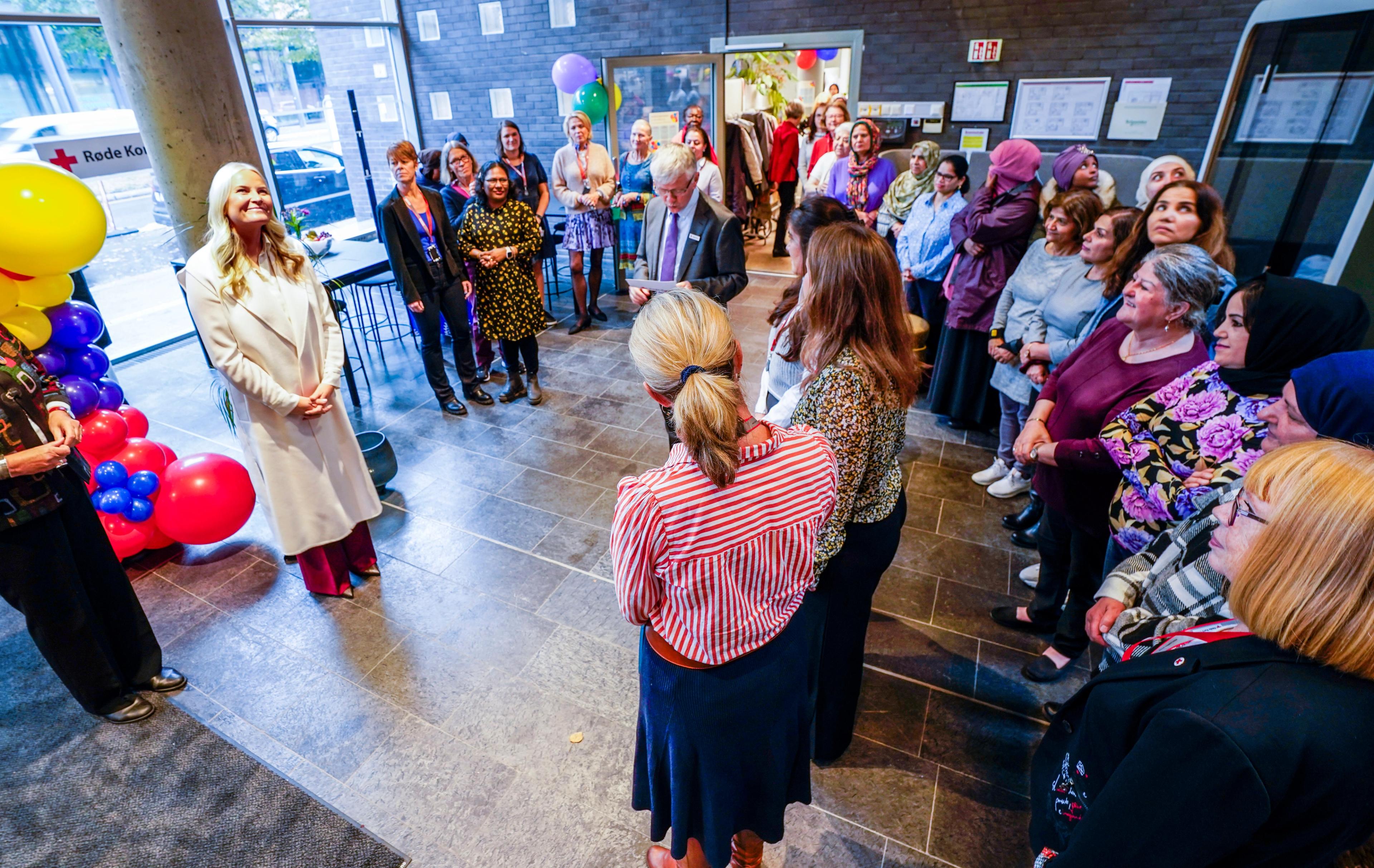 Denne uken markerer senteret sitt 10-årsjubileum med ulike aktiviteter. Kronprinsessen ble ønsket velkommen av president i Røde Kors Thor Inge Sveinsvoll og daglig leder ved Oslo Røde Kors Elin Holmedal. Holmedal orienterte om arbeidet og tilbudene ved senteret i dag.