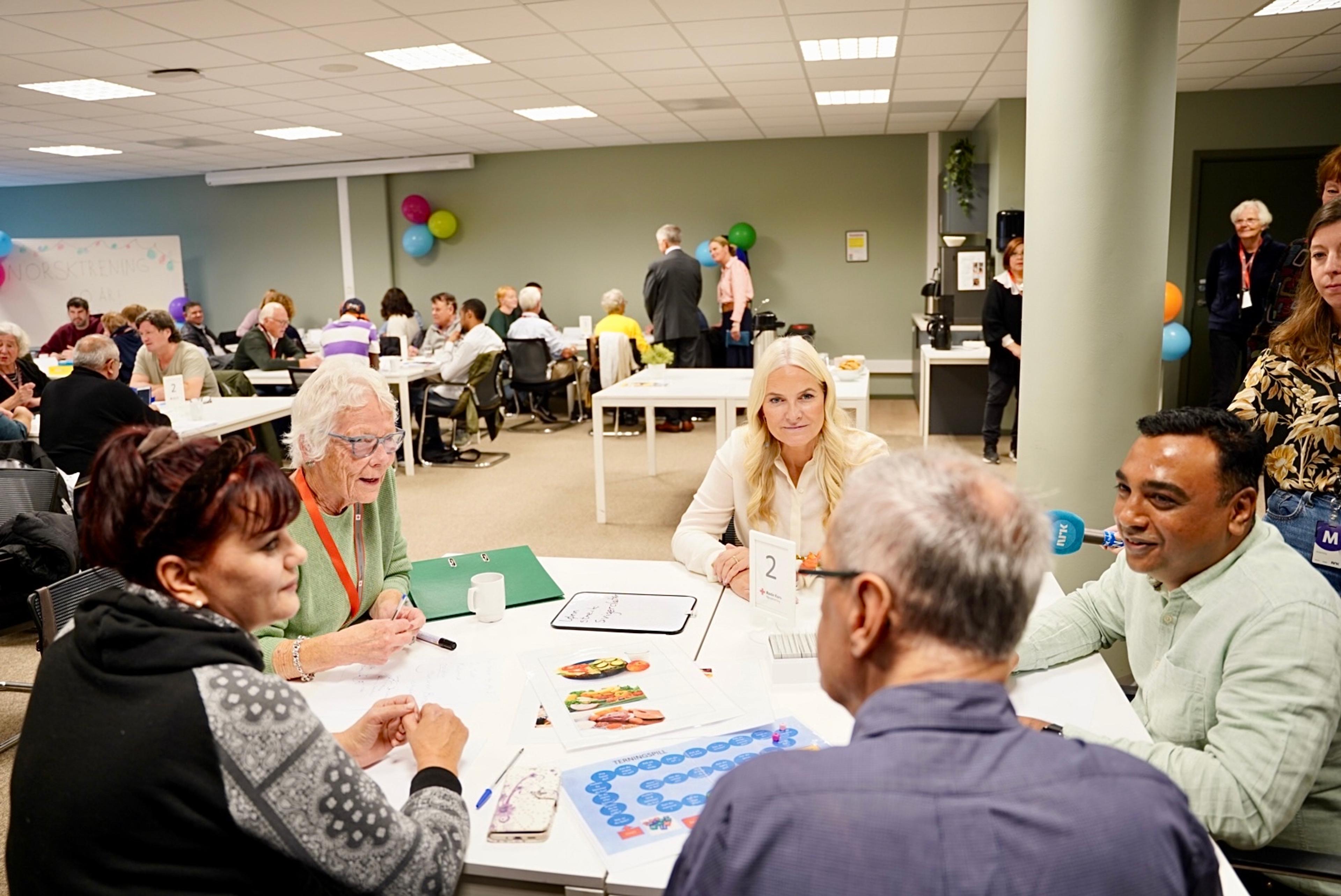 Røde Kors tilbyr blant annet norsktrening som et av tilbudene på senteret. Under besøket møtte Kronprinsessen både frivillige og deltakere som ofte tar del i norsktreningen.