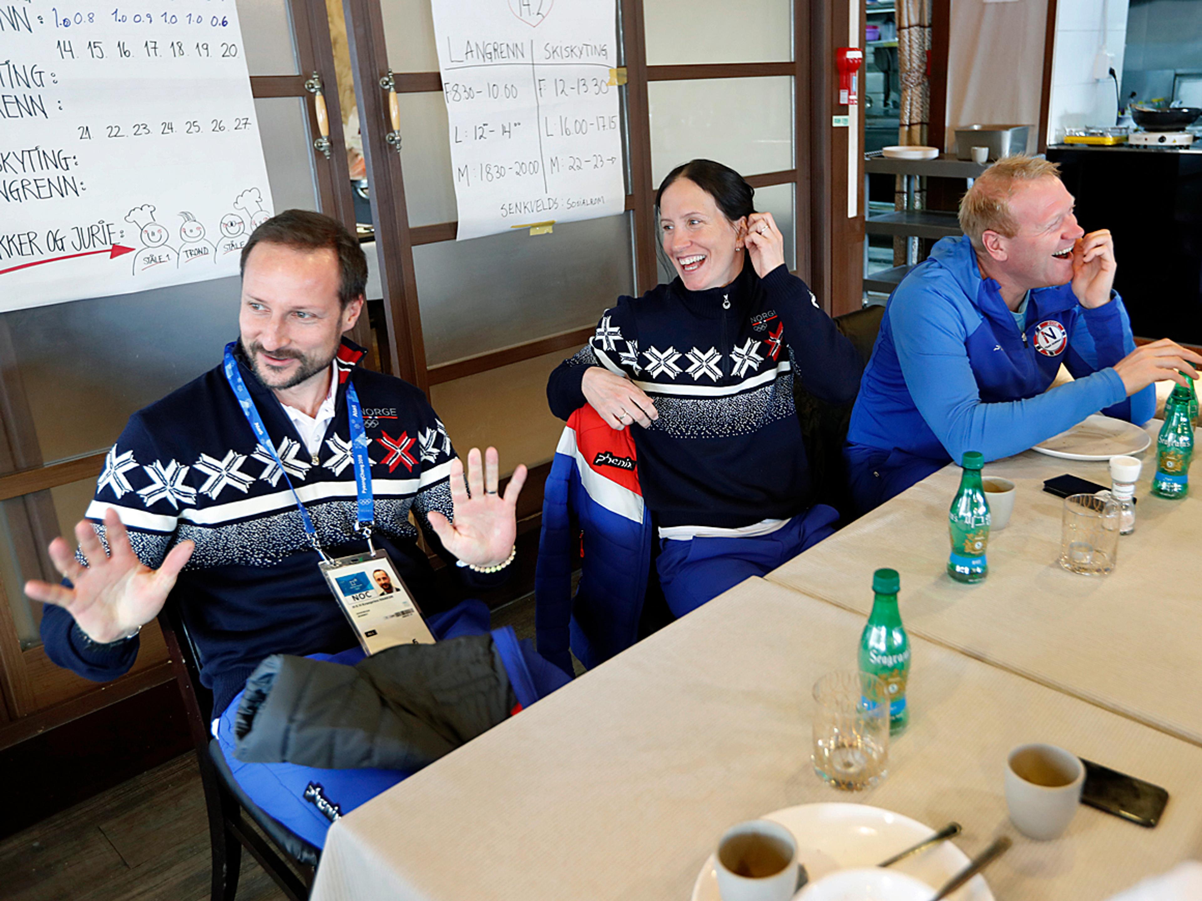 I går besøkte Kronprinsen langrennsutøverne på hotellet hvor de bor. Pål Golberg utfordret Kronprinsen blant annet til en felles treningsøkt på en rulleskimølle.