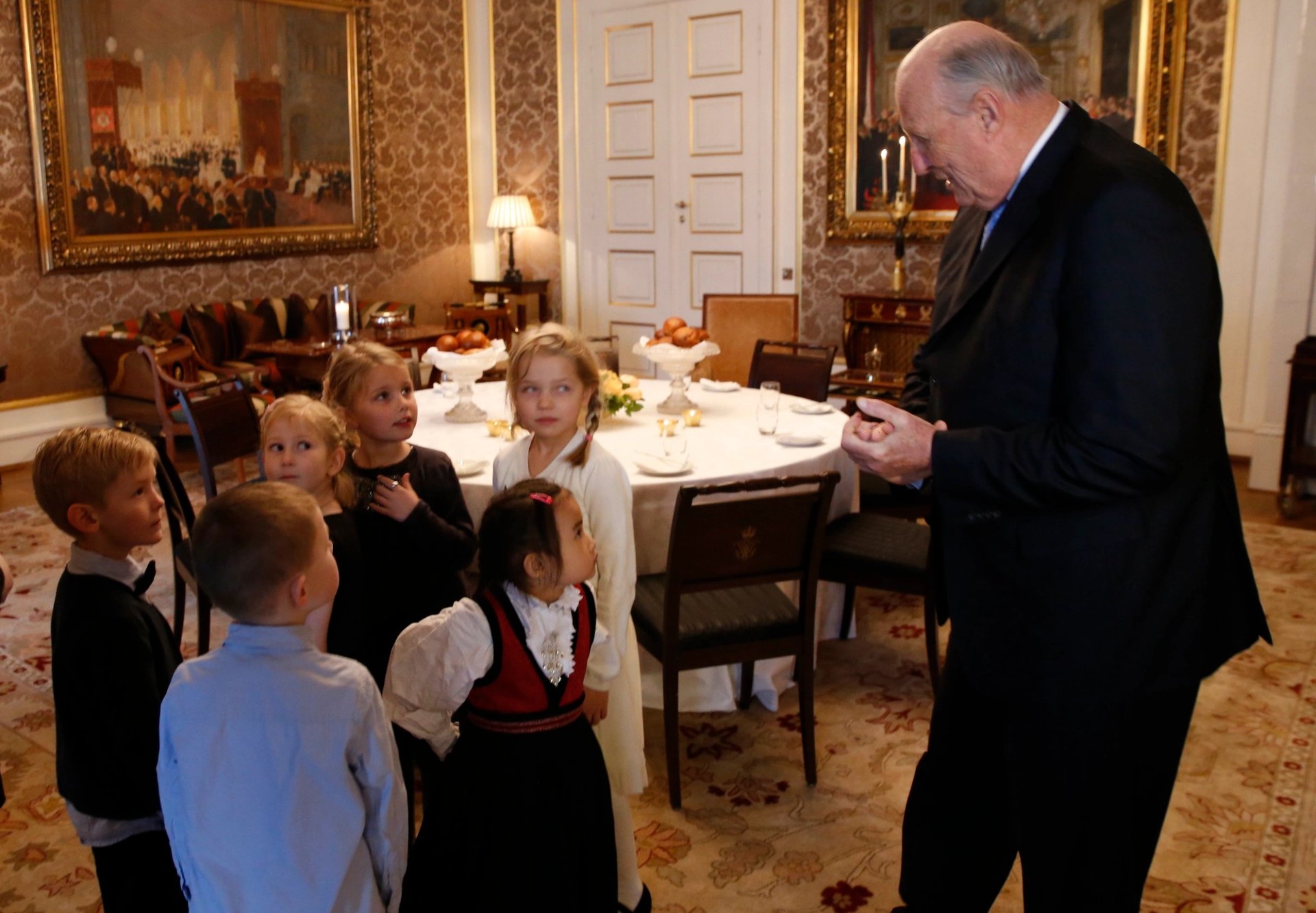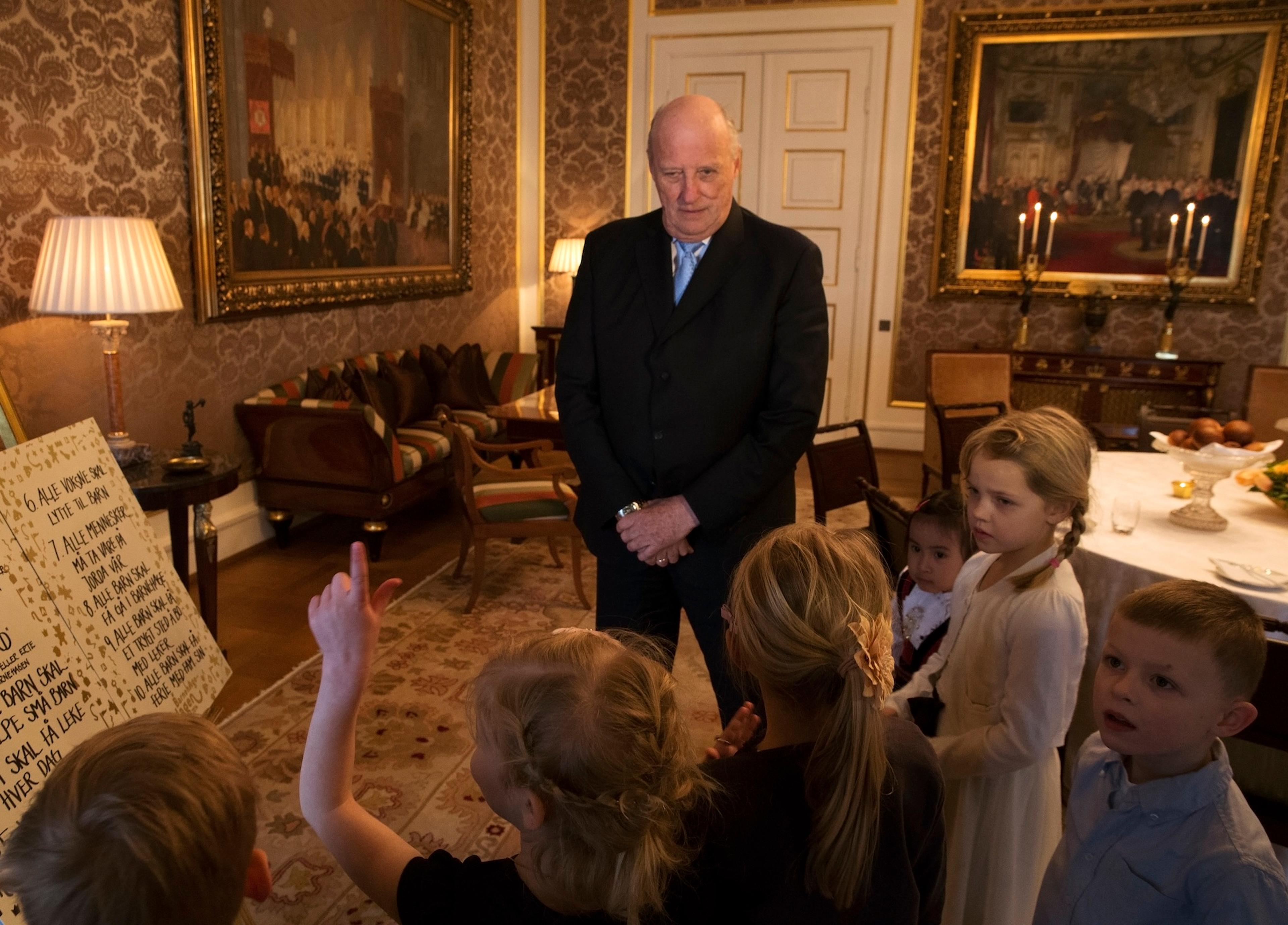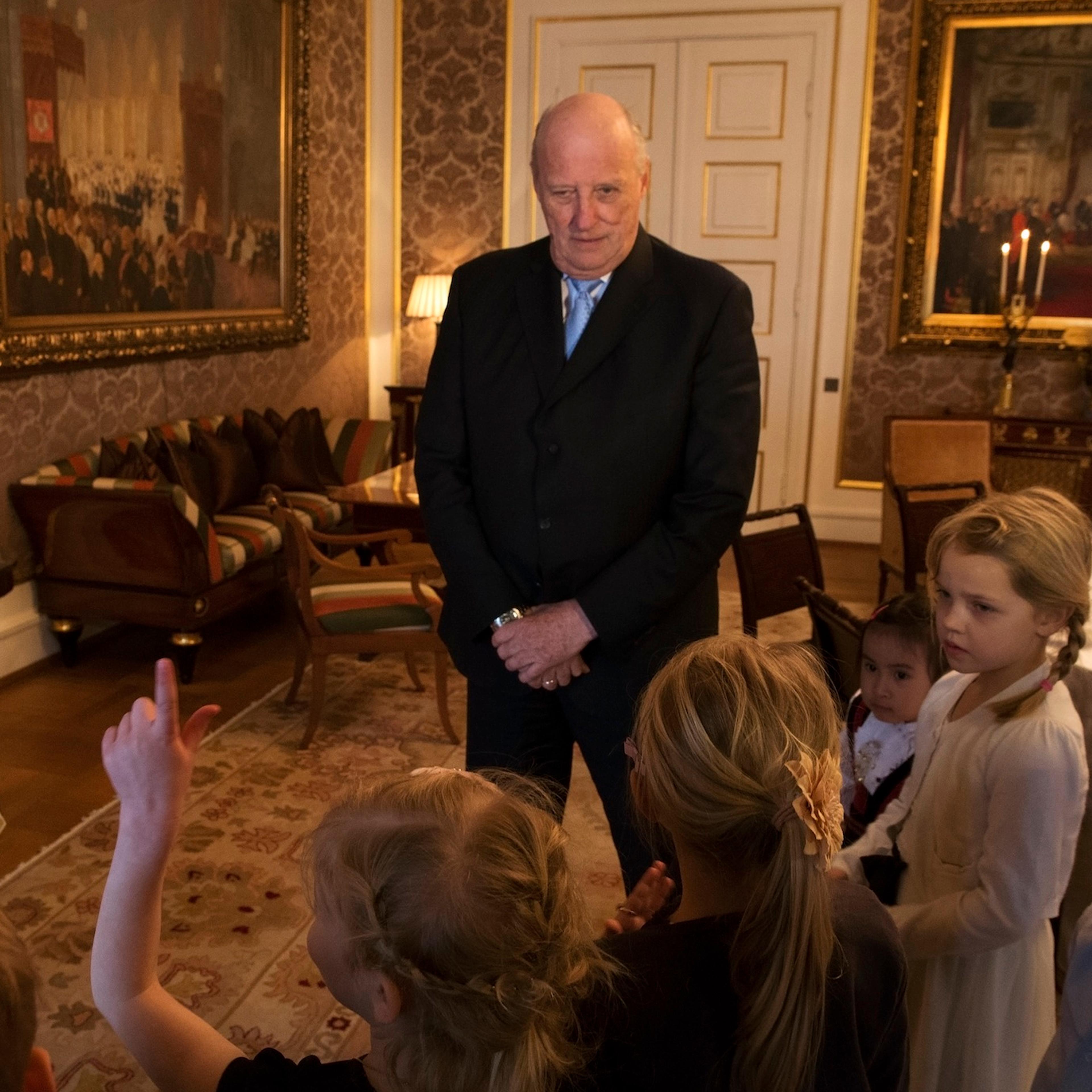 Barna ble tatt i mot av Kongen i Ministersalongen. Her var barnas forslag til grunnlov presentert på plansjer, og Kong Harald fikk høre om de ulike paragrafene og tankene bak.