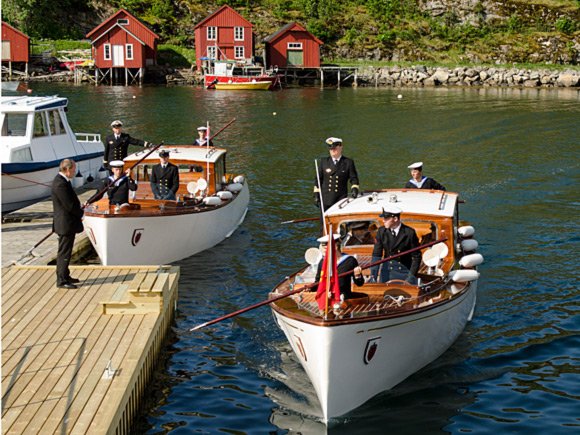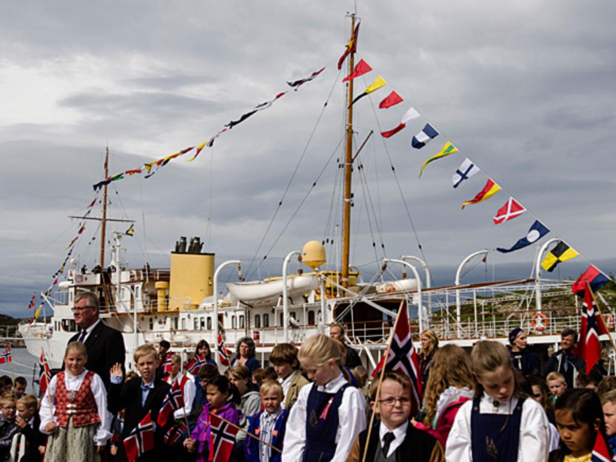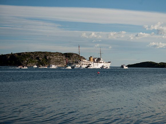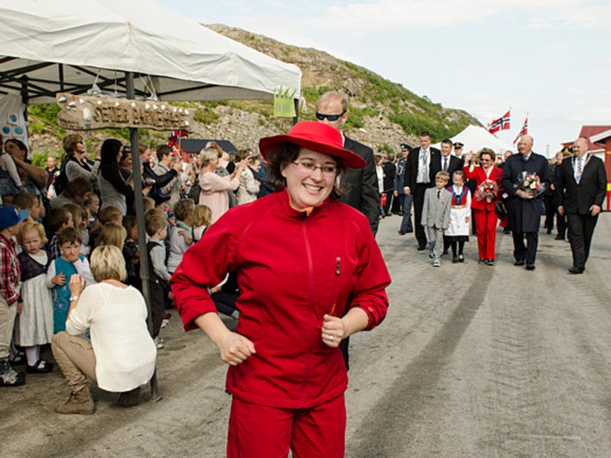 Det er andre dag av Kongeparets fylkestur til Sør-Trøndelag, og i morges la Kongesjaluppen til i Osen. Uvanlig nok lå den røde løperen et stykke foran Kongen og Dronningen denne gangen - i et av medlemmene «De Gærne damers forenings» skikkelse