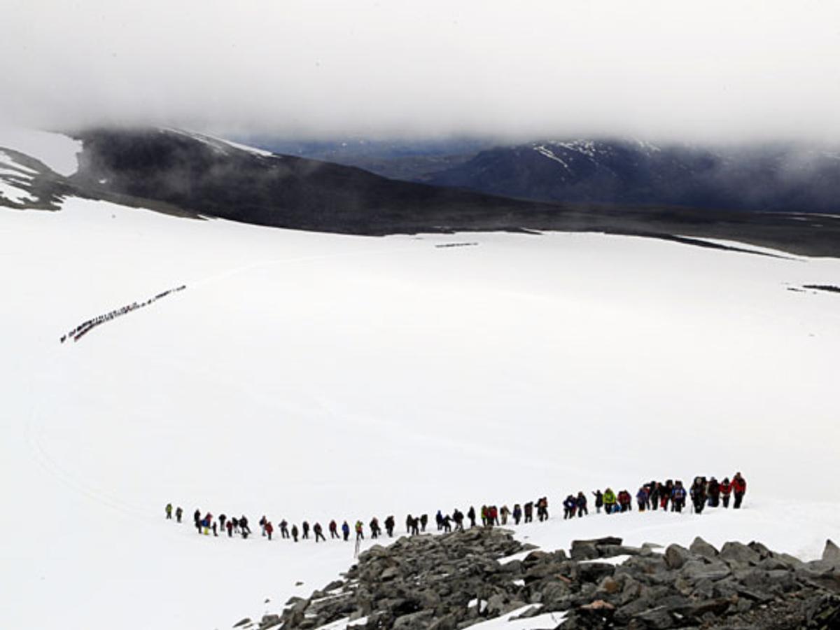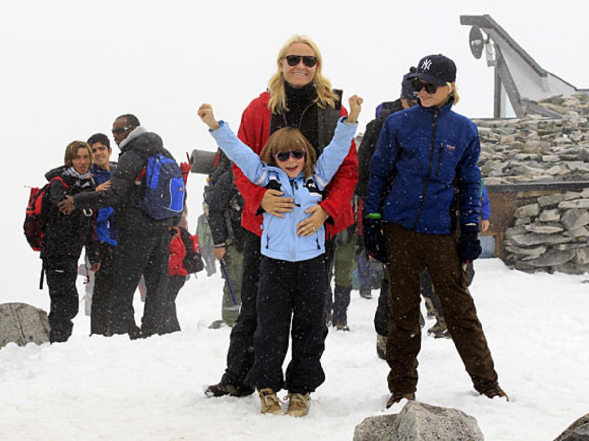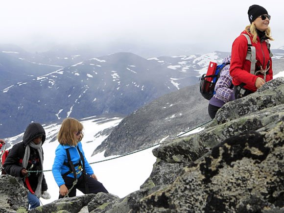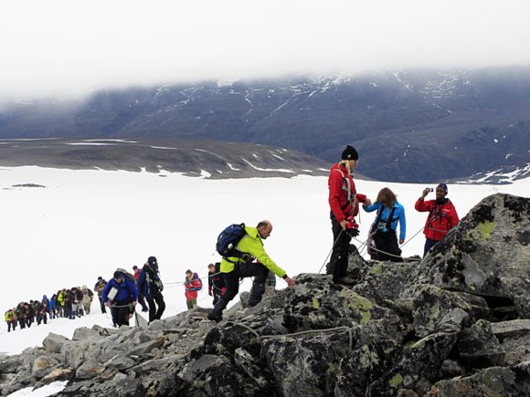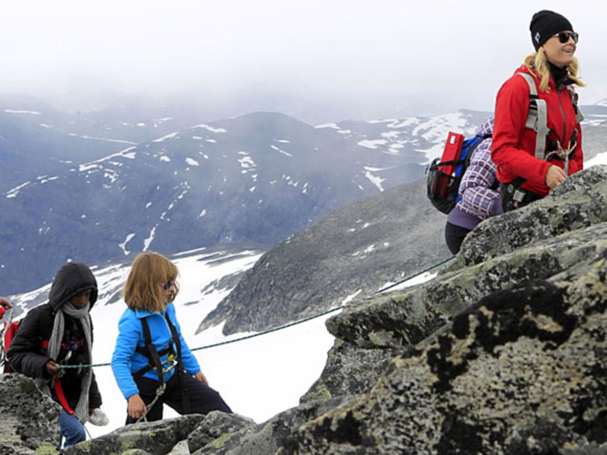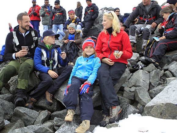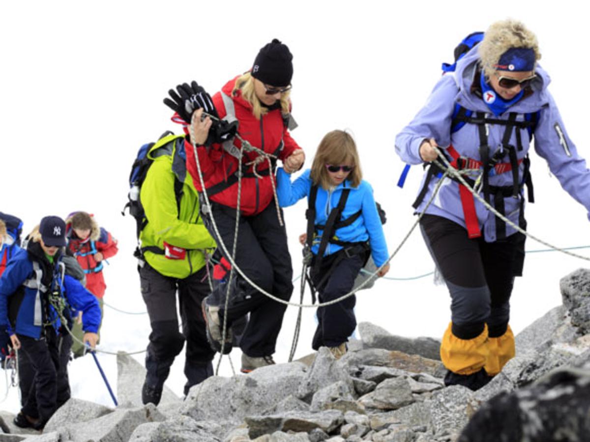 H.K.H. Kronprins Haakon og Prins Sverre Magnus snudde ved foten av Styggebreen, mens resten av familien stilte i taulaget over breen og vidare heilt opp til toppen av Galdhøpiggen.