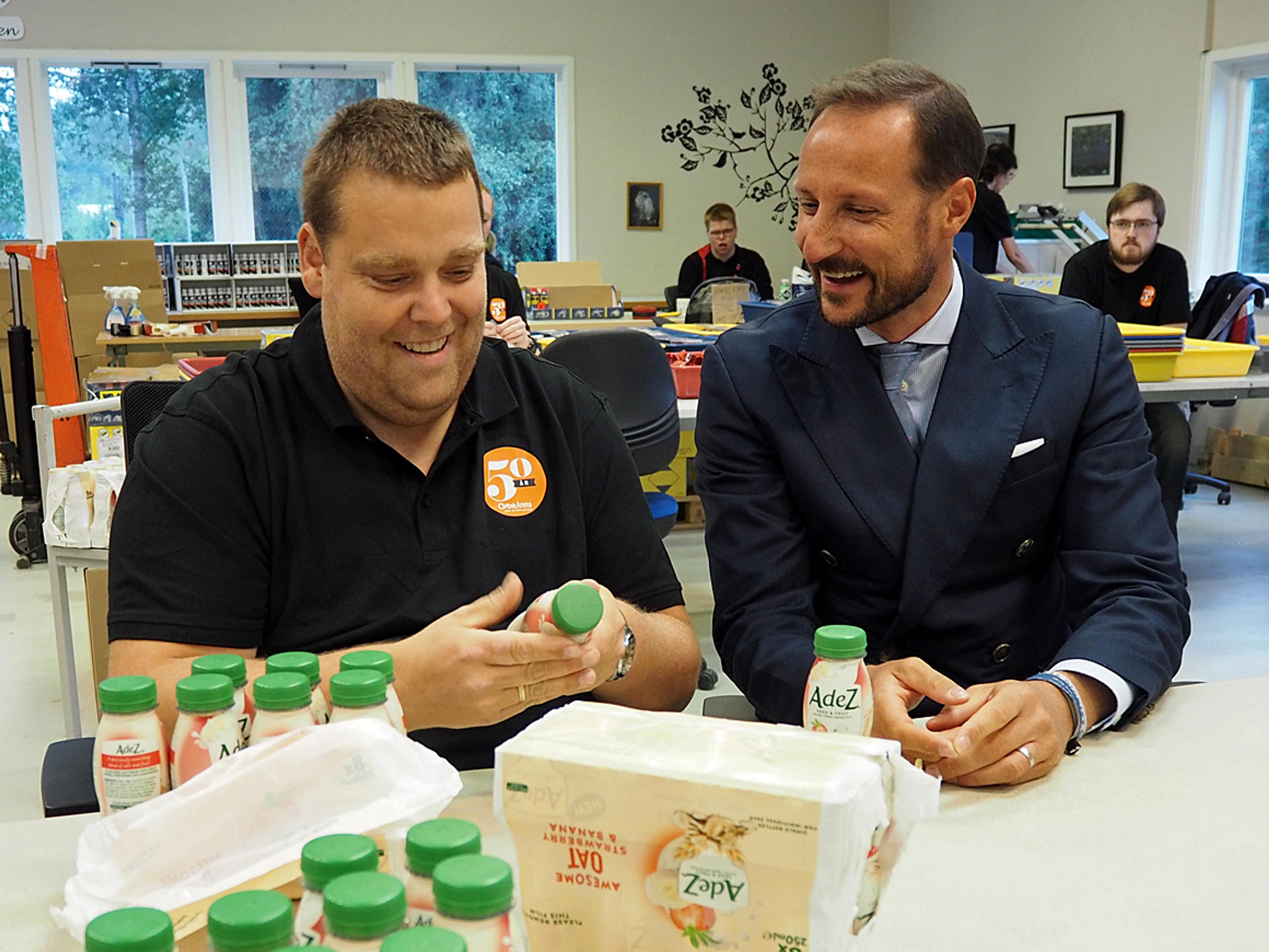 I pakke- og monteringsavdelingen var deltakerne i full gang med å merke og pakke juledisplay og flasker med smoothie. Kronprinsparet satte seg ned med Ante Verket og Barbro Amundsen som fortalte dem litt om jobben.