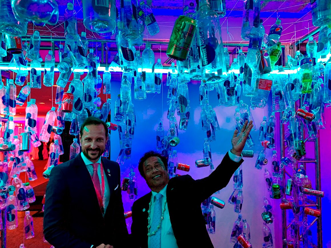 Utsmykningen av spisesalen i FNs hovedkvarter i kveld gjenspeiler mottakelsens tema. Gjestene passerer gjennom en installasjon av plastflasker når de ankommer. Totalt tre installasjoner designet av Quin Wu er satt opp i ulike deler av rommet, og hver av dem symboliserer utfordringer havet står overfor, som forsøpling og biodiversitet.