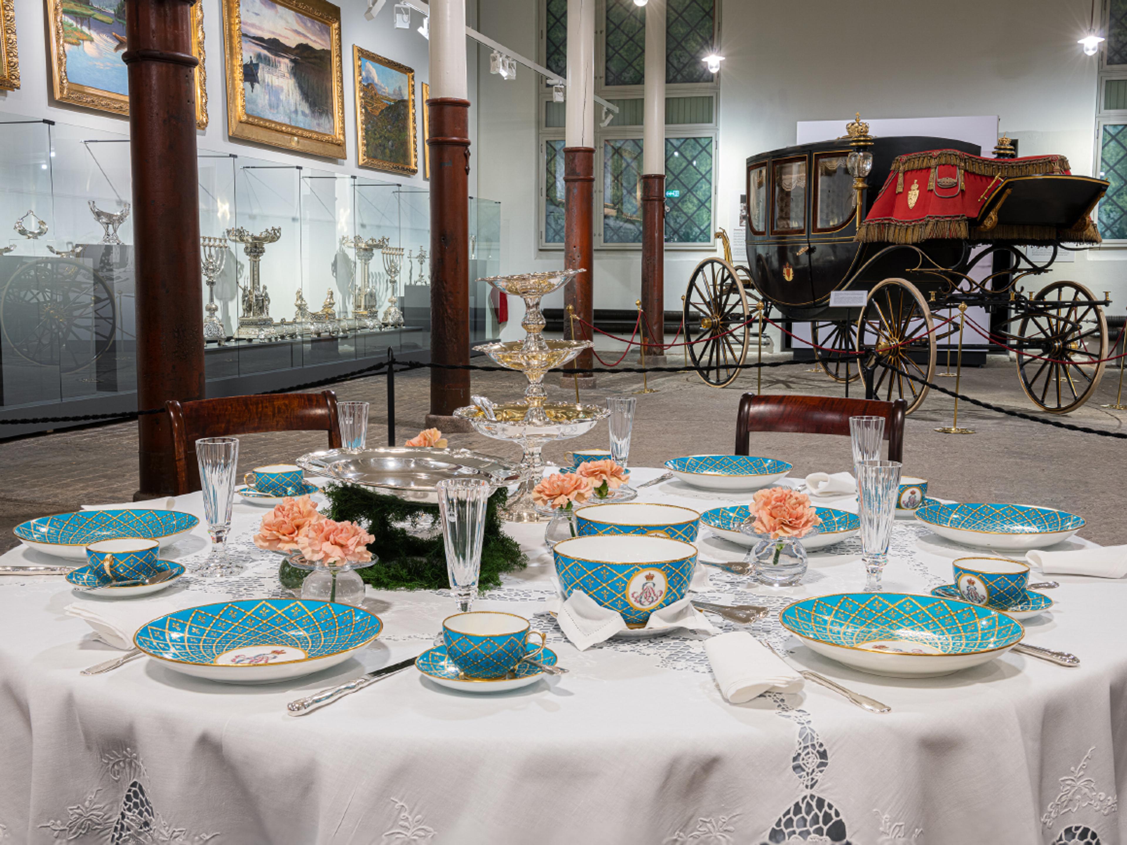 Serviset tilhørte Dronning Mauds foreldre, Kong Edward og Dronning Alexandra av Storbritannia. Den 20. november klokken 14.00 er det også anledning til å høre kunsthistoriker Nina Høye og Slottets konditor, Eline Haugesten Gulbrandsen fortelle om tradisjonen. Arrangementet er en del av utstillingen, og inngår i den vanlige inngangsbilletten.
