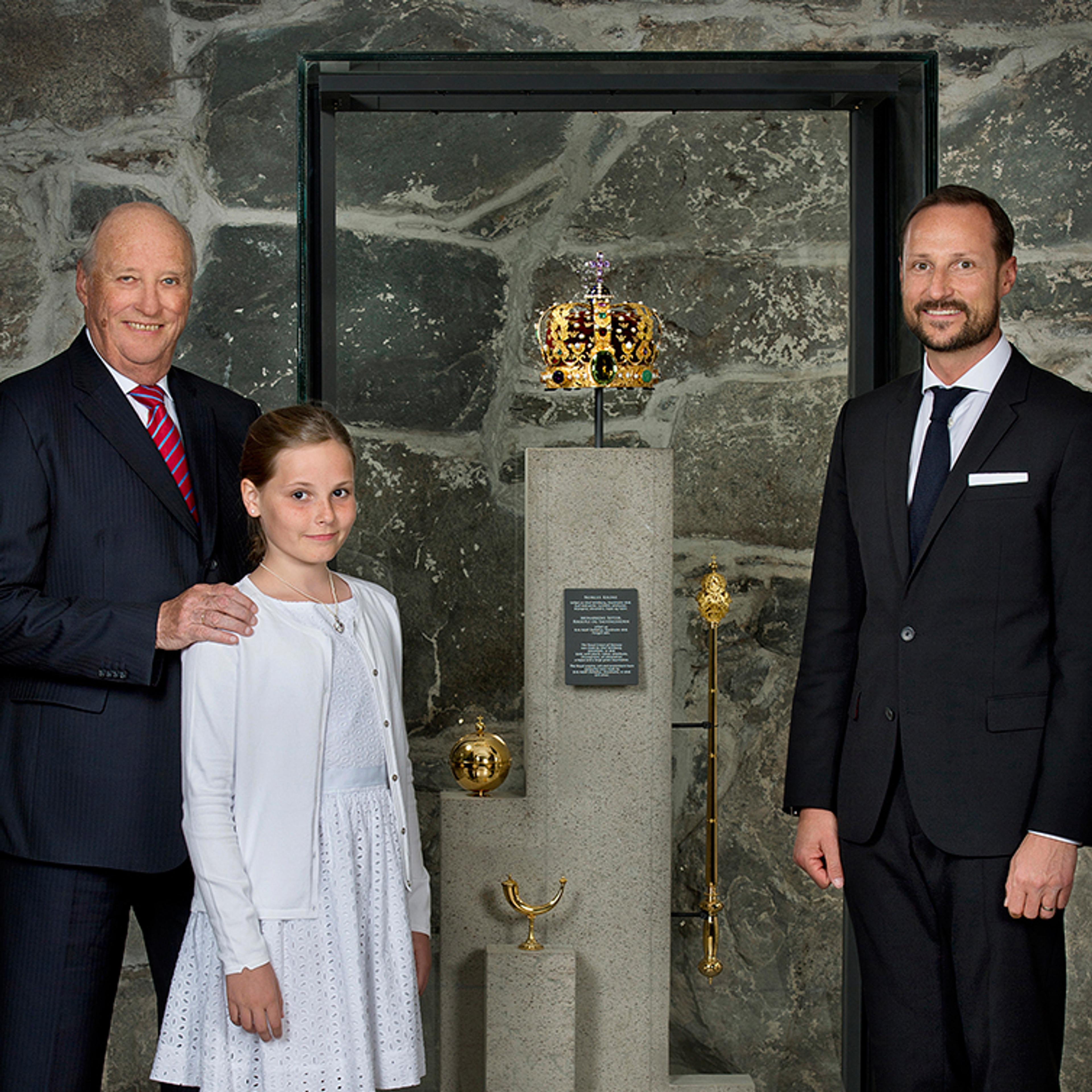 Biletet er teke framfor dei norske kronregalia – på same stad som for ti år sidan, da arverekkja vart avbilda i samband med 100-årsjubileet for kroninga av Kong Haakon og Dronning Maud.